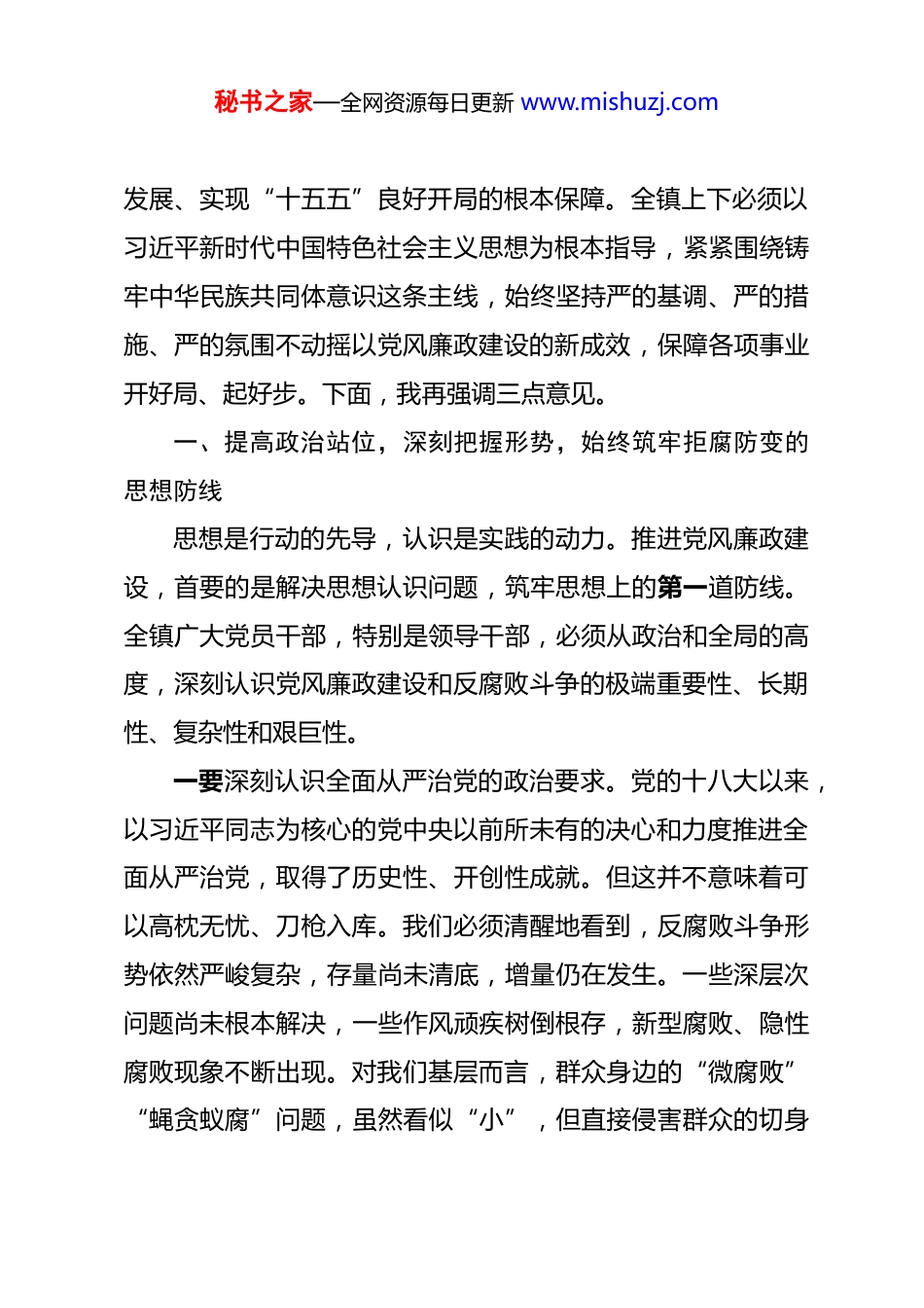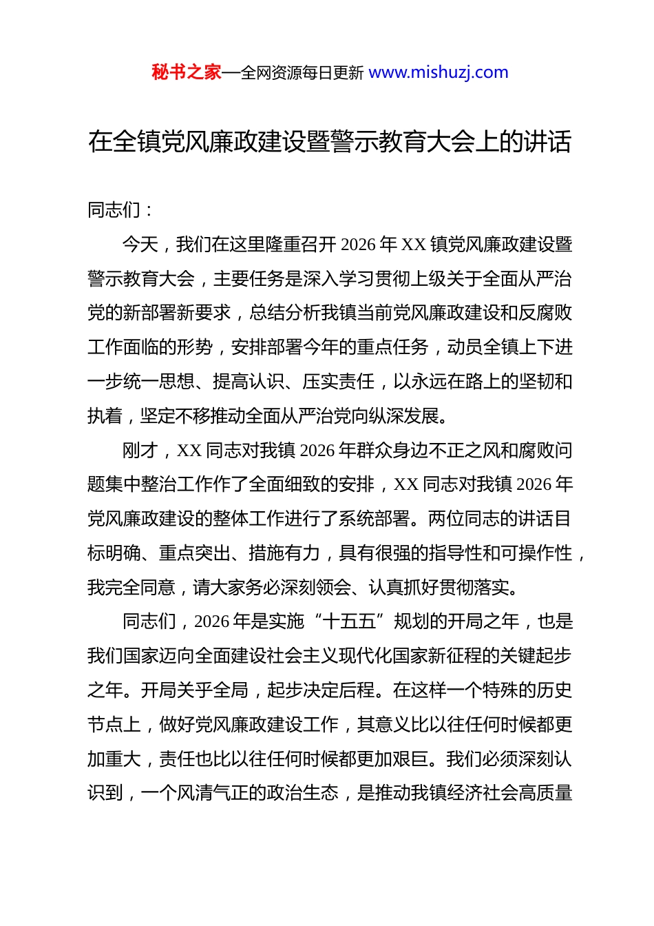 秘书之家—全网资源每日更新 www.mishuzj.com在全镇党风廉政建设暨警示教育大会上的讲话 同志们:今天,我们在这里隆重召开 2026 年 XX 镇党风廉政建设暨警示教育大会,主要任务是深入学习贯彻上级关于全面从严治党的新部署新要求,总结分析我镇当前党风廉政建设和反腐败工作面临的形势,安排部署今年的重点任务,动员全镇上下进一步统一思想、提高认识、压实责任,以永远在路上的坚韧和执着,坚定不移推动全面从严治党向纵深发展。刚才,XX 同志对我镇 2026 年群众身边不正之风和腐败问题集中整治工作作了全面细致的安排,XX 同志对我镇 2026 年党风廉政建设的整体工作进行了系统部署。两位同志的讲话目标明确、重点突出、措施有力,具有很强的指导性和可操作性,我完全同意,请大家务必深刻领会、认真抓好贯彻落实。同志们,2026 年是实施“十五五”规划的开局之年,也是我们国家迈向全面建设社会主义现代化国家新征程的关键起步之年。开局关乎全局,起步决定后程。在这样一个特殊的历史节点上,做好党风廉政建设工作,其意义比以往任何时候都更加重大,责任也比以往任何时候都更加艰巨。我们必须深刻认识到,一个风清气正的政治生态,是推动我镇经济社会高质量秘书之家—全网资源每日更新 www.mishuzj.com发展、实现“十五五”良好开局的根本保障。全镇上下必须以习近平新时代中国特色社会主义思想为根本指导,紧紧围绕铸牢中华民族共同体意识这条主线,始终坚持严的基调、严的措施、严的氛围不动摇以党风廉政建设的新成效,保障各项事业开好局、起好步。下面,我再强调三点意见。一、提高政治站位,深刻把握形势,始终筑牢拒腐防变的思想防线思想是行动的先导,认识是实践的动力。推进党风廉政建设,首要的是解决思想认识问题,筑牢思想上的第一道防线。全镇广大党员干部,特别是领导干部,必须从政治和全局的高度,深刻认识党风廉政建设和反腐败斗争的极端重要性、长期性、复杂性和艰巨性。一要深刻认识全面从严治党的政治要求。党的十八大以来,以习近平同志为核心的党中央以前所未有的决心和力度推进全面从严治党,取得了历史性、开创性成就。但这并不意味着可以高枕无忧、刀枪入库。我们必须清醒地看到,反腐败斗争形势依然严峻复杂,存量尚未清底,增量仍在发生。一些深层次问题尚未根本解决,一些作风顽疾树倒根存,新型腐败、隐性腐败现象不断出现。对我们基层而言,群众身边的“微腐败”“蝇贪蚁腐”问题,虽然看似“小”,但直接侵害群众的切身秘书之家—全网资源每日更新 www.mishuzj.com利益,啃食的是群众的获得感,挥霍的是基层群众对党的信任,其危害巨大,影响恶劣。因此,我们必须始终保持政治上的清醒和坚定,始终把纪律和规矩挺在前面,坚定理想信念,严守政治纪律和政治规矩,不断增强“四个意识”、坚定“四个自信”、做到“两个维护”。二要持续强化理论武装和党性修养。理想信念的动摇是最危险的动摇,理想信念的滑坡是最致命的滑坡。会后,我们将组织大家观看警示教育片《一屏之隔》。这部片子深刻揭示了一些党员干部如何因为理想信念滑坡、纪律意识淡薄,从最初的“小节”失守,一步步越过纪律的红线,最终堕入腐败深渊的惨痛教训。“一屏之隔”,隔开的是纪法与贪欲、是光明与黑暗、是“看片人”与“片中人”。这个“屏”,就是我们内心的敬畏之心、纪法之弦。我们每一位同志都要从这些活生生的反面教材中汲取深刻教训,把自己摆进去、把职责摆进去、把工作摆进去,深刻反思、引以为戒。要坚持不懈用习近平新时代中国特色社会主义思想凝心铸魂,真正学出坚定信念、学出绝对忠诚、学出使命担当。要经常性地开展党性教育、纪律教育、廉洁文化教育,常态化开展谈心谈话,及时发现和纠正苗头性、倾向性问题,做到知敬畏、存戒惧、守底线,真正让廉洁从政的思想根基坚如磐石。秘书之家—全网资源每日更新 www.mishuzj.com三要自觉在监督和约束下工作生活。权力是一把“双刃剑”,在职责范围内正确行使,就能为民造福;反之,就会伤人害己。我们手中的权力是党和人民赋予的,只能用来为人民服务,绝不能异化为谋取私利的工具。广大党员干部...