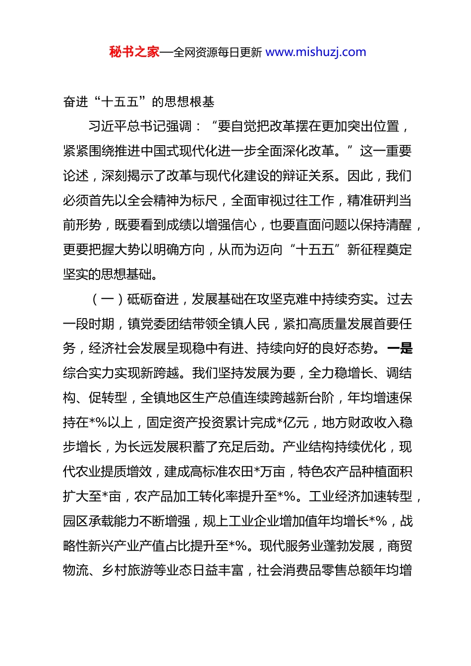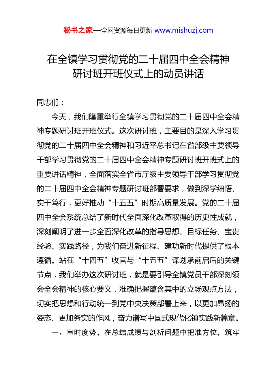 秘书之家—全网资源每日更新 www.mishuzj.com在全镇学习贯彻党的二十届四中全会精神研讨班开班仪式上的动员讲话 同志们:今天,我们隆重举行全镇学习贯彻党的二十届四中全会精神专题研讨班开班仪式。这次研讨班,主要目的是深入学习贯彻党的二十届四中全会精神和习近平总书记在省部级主要领导干部学习贯彻党的二十届四中全会精神专题研讨班开班式上的重要讲话精神,全面落实全省市厅级主要领导干部学习贯彻党的二十届四中全会精神专题研讨班部署要求,做到深学细悟、实干笃行,更好推动“十五五”时期高质量发展。党的二十届四中全会系统总结了新时代全面深化改革取得的历史性成就,深刻阐明了进一步全面深化改革的指导思想、目标任务、宝贵经验、实践路径,为我们奋进新征程、建功新时代提供了根本遵循。站在“十四五”收官与“十五五”谋划承前启后的关键节点,我们举办这次研讨班,就是要引导全镇党员干部深刻领会全会精神的核心要义,准确把握蕴含其中的立场观点方法,切实把思想和行动统一到党中央决策部署上来,以更加昂扬的姿态、更加务实的作风,奋力谱写中国式现代化镇实践新篇章。一、审时度势,在总结成绩与剖析问题中把准方位,筑牢秘书之家—全网资源每日更新 www.mishuzj.com奋进“十五五”的思想根基习近平总书记强调:“要自觉把改革摆在更加突出位置,紧紧围绕推进中国式现代化进一步全面深化改革。”这一重要论述,深刻揭示了改革与现代化建设的辩证关系。因此,我们必须首先以全会精神为标尺,全面审视过往工作,精准研判当前形势,既要看到成绩以增强信心,也要直面问题以保持清醒,更要把握大势以明确方向,从而为迈向“十五五”新征程奠定坚实的思想基础。(一)砥砺奋进,发展基础在攻坚克难中持续夯实。过去一段时期,镇党委团结带领全镇人民,紧扣高质量发展首要任务,经济社会发展呈现稳中有进、持续向好的良好态势。一是综合实力实现新跨越。我们坚持发展为要,全力稳增长、调结构、促转型,全镇地区生产总值连续跨越新台阶,年均增速保持在*%以上,固定资产投资累计完成*亿元,地方财政收入稳步增长,为长远发展积蓄了充足后劲。产业结构持续优化,现代农业提质增效,建成高标准农田*万亩,特色农产品种植面积扩大至*亩,农产品加工转化率提升至*%。工业经济加速转型,园区承载能力不断增强,规上工业企业增加值年均增长*%,战略性新兴产业产值占比提升至*%。现代服务业蓬勃发展,商贸物流、乡村旅游等业态日益丰富,社会消费品零售总额年均增秘书之家—全网资源每日更新 www.mishuzj.com长*%。二是城乡面貌展现新容颜。我们坚持统筹推进,基础设施日益完善,道路交通网络不断加密,新建改造农村公路*公里,安全饮水、污水处理等覆盖面持续扩大。人居环境整治成效显著,垃圾分类处理体系初步建成,村容村貌焕然一新,成功创建省市级美丽乡村示范村*个。生态环境质量稳步改善,河长制、林长制落实有力,主要污染物排放总量持续下降,空气优良天数比例稳定在*%以上。三是民生福祉获得新提升。我们坚持以人民为中心,民生支出占财政支出比重保持在*%以上。教育优先发展战略深入实施,新建改扩建中小学幼儿园*所,办学条件显著改善。医疗卫生服务能力不断增强,镇卫生院提档升级,标准化村卫生室实现全覆盖。社会保障体系更加健全,城乡居民基本养老保险、医疗保险参保率稳定在*%以上,社会救助兜底保障精准有力。平安*建设深入推进,安全生产形势持续稳定,矛盾纠纷化解机制有效运行,群众安全感、满意度不断提升。(二)正视不足,问题短板在深度检视中愈发清晰。对照高质量发展要求和人民群众期盼,我们必须清醒地认识到,前进道路上依然面临不少挑战与短板。一是产业转型升级任务依然艰巨。传统产业占比仍然偏高,部分企业创新能力不强,核心竞争力有待提升;新兴产业规模尚未形成有效支撑,产业链条不够完善,集聚效应不够明显;要素制约依然突出,土地、秘书之家—全网资源每日更新 www.mishuzj.com能耗、环境容量等指标趋紧,部分项目落地面临瓶颈;现代服务业发展层次有待提高,生产性服务业占比偏低,消费潜力释放不够充分。二是城乡融合发...
