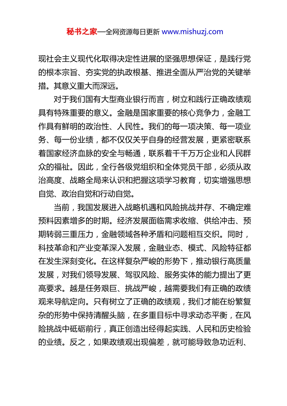 秘书之家—全网资源每日更新 www.mishuzj.comXX 银行党委书记、行长在树立和践行正确政绩观学习教育读书班开班动员暨第一次集体学习会议上的讲话同志们:今天我们在这里隆重举行 XX 银行树立和践行正确政绩观学习教育读书班的开班动员暨第一次集体学习会议,主要任务是深入学习贯彻习近平总书记关于树立和践行正确政绩观的一系列重要论述,认真落实党中央关于在全党开展此项学习教育的决策部署,动员全行上下进一步统一思想、提高站位,深刻把握正确政绩观的精髓要义和实践要求,并将其转化为推动我行高质量发展、服务中国式现代化建设的强大动力和实际成效。下面,我讲几点意见。一、提高政治站位,深刻认识树立和践行正确政绩观的极端重要性和现实紧迫性政绩观,是党员干部世界观、人生观、价值观在履职尽责干事创业中的集中体现,直接反映党性修养、宗旨意识和格局境界。是否树立和践行正确政绩观,不仅关系到干部个人的健康成长,更关系到党和国家事业发展全局,关系到人民群众的切身利益。在全党开展树立和践行正确政绩观学习教育,是党的二十届四中全会作出的一项重要部署,是持续深化党的创新理论武装、巩固拓展主题教育成果的必然要求,是确保基本实秘书之家—全网资源每日更新 www.mishuzj.com现社会主义现代化取得决定性进展的坚强思想保证,是践行党的根本宗旨、夯实党的执政根基、推进全面从严治党的关键举措。其意义重大而深远。对于我们国有大型商业银行而言,树立和践行正确政绩观具有特殊重要的意义。金融是国家重要的核心竞争力,金融工作具有鲜明的政治性、人民性。我们的每一项决策、每一项业务、每一份业绩,都不仅仅关乎自身的经营发展,更紧密联系着国家经济血脉的安全与畅通,联系着千千万万企业和人民群众的福祉。因此,全行各级党组织和全体党员干部,必须从政治高度、战略全局来认识和把握这项学习教育,切实增强思想自觉、政治自觉和行动自觉。当前,我国发展进入战略机遇和风险挑战并存、不确定难预料因素增多的时期。经济发展面临需求收缩、供给冲击、预期转弱三重压力,金融领域各种矛盾和问题相互交织。同时,科技革命和产业变革深入发展,金融业态、模式、风险特征都在发生深刻变化。在这样复杂严峻的形势下,推动银行高质量发展,对我们领导发展、驾驭风险、服务实体的能力提出了更高要求。越是任务艰巨、挑战严峻,越需要我们有正确的政绩观来导航定向。只有树立了正确的政绩观,我们才能在纷繁复杂的形势中保持清醒头脑,在多重目标中寻求动态平衡,在风险挑战中砥砺前行,真正创造出经得起实践、人民和历史检验的业绩。反之,如果政绩观出现偏差,就可能导致急功近利、秘书之家—全网资源每日更新 www.mishuzj.com盲目扩张、忽视风险、脱离群众等问题,不仅会损害银行的长远健康发展,更可能给党和国家事业带来风险隐患。全行上下必须深刻认识到,树立和践行正确政绩观,是推动我行行稳致远的“压舱石”,是激励干部担当作为的“指挥棒”,是衡量我们一切工作成效的“试金石”。二、把握核心要义,全面理解正确政绩观的丰富内涵与实践要求习近平总书记关于树立和践行正确政绩观的重要论述,思想深邃、内涵丰富,系统回答了“政绩为谁而树、树什么样的政绩、靠什么树政绩”等一系列重大理论和实践问题,为我们提供了根本遵循。全行党员干部必须深学细悟、融会贯通,准确把握其精神实质。(一)必须坚守“政绩为谁而树”的根本立场。这是政绩观的首要问题和核心问题。我们党除了国家、民族、人民的利益,没有任何自己的特殊利益。正确的政绩观,必然是以人民为中心的政绩观。具体到我们银行工作,就是要始终坚持金融工作的政治性、人民性。我们的政绩,必须树在为国尽责、为民造福的坚实基础上。要心怀“国之大者”,自觉把分行乃至全行的工作放到党和国家事业发展全局中去思考、去定位、去推进,时刻关注党中央在关心什么、强调什么,深刻领会什么是党和国家最重要的利益、什么是最需要坚定维护的立场。金融服务不能“自弹自唱”,必须紧紧围绕国家重大战略、经济秘书之家—全网资源每日更新 www.mishuzj.com社会发展的重点领域和薄弱环...