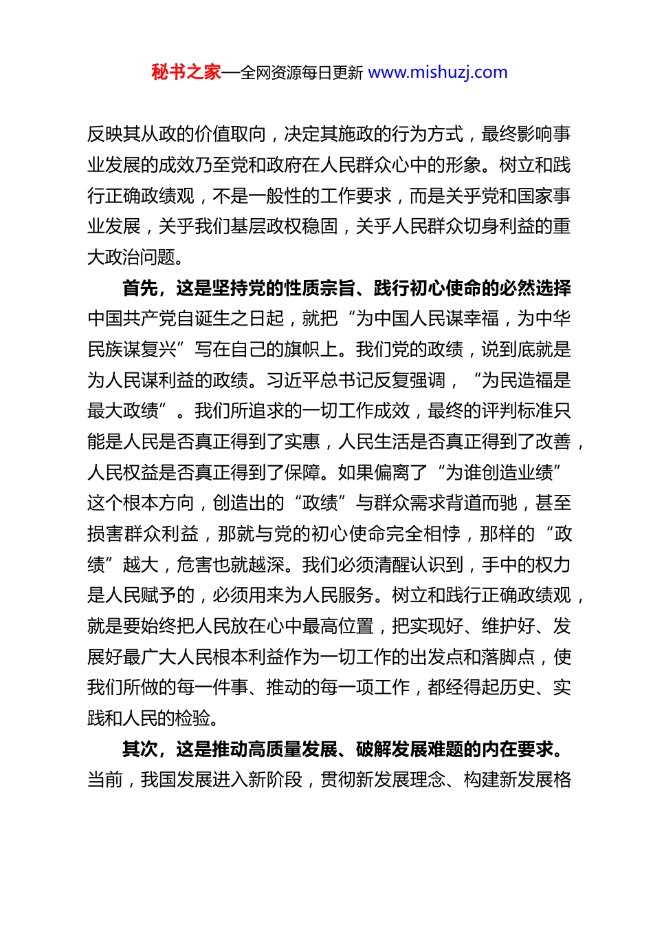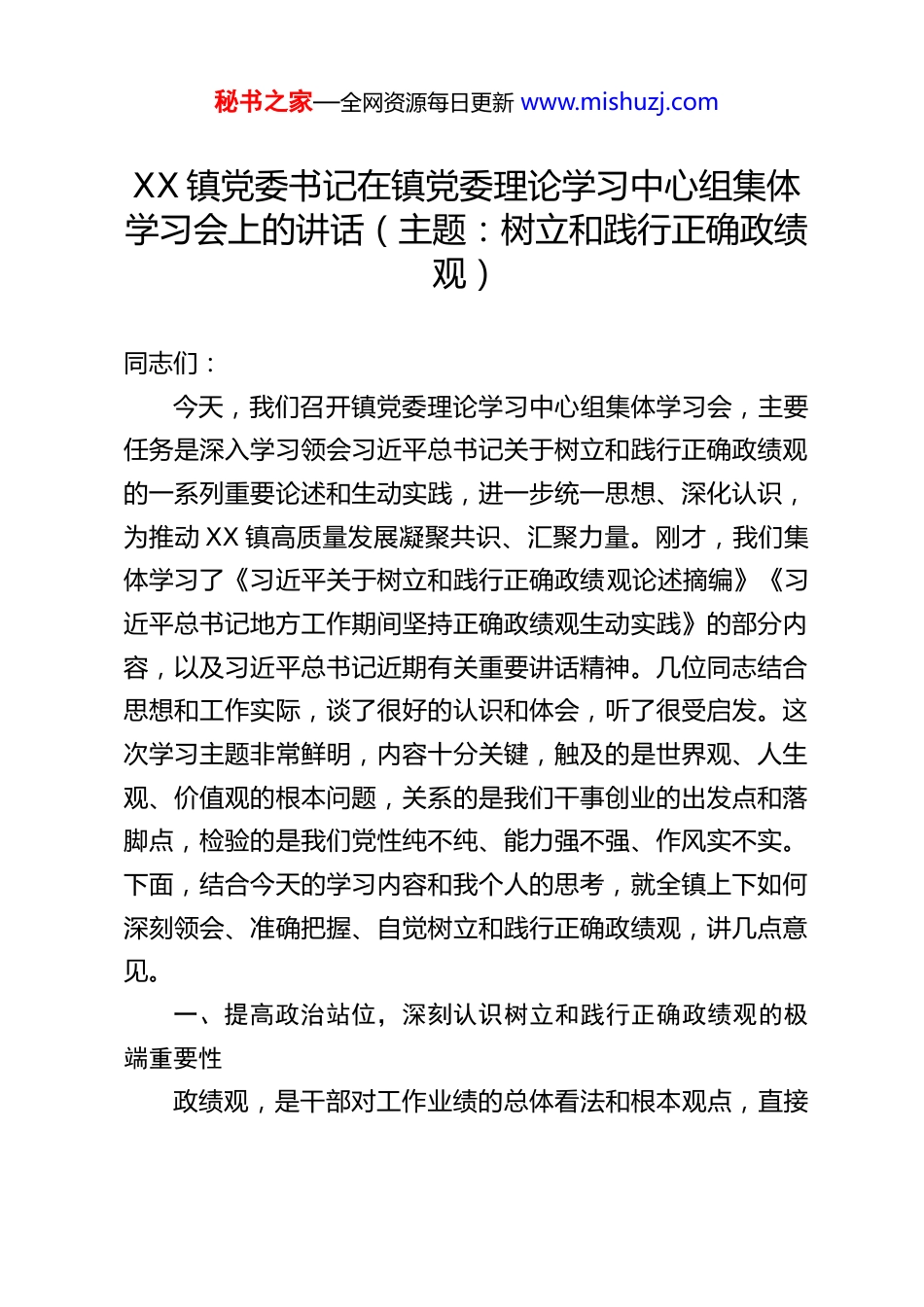 秘书之家—全网资源每日更新 www.mishuzj.comXX 镇党委书记在镇党委理论学习中心组集体学习会上的讲话(主题:树立和践行正确政绩观)同志们:今天,我们召开镇党委理论学习中心组集体学习会,主要任务是深入学习领会习近平总书记关于树立和践行正确政绩观的一系列重要论述和生动实践,进一步统一思想、深化认识,为推动 XX 镇高质量发展凝聚共识、汇聚力量。刚才,我们集体学习了《习近平关于树立和践行正确政绩观论述摘编》《习近平总书记地方工作期间坚持正确政绩观生动实践》的部分内容,以及习近平总书记近期有关重要讲话精神。几位同志结合思想和工作实际,谈了很好的认识和体会,听了很受启发。这次学习主题非常鲜明,内容十分关键,触及的是世界观、人生观、价值观的根本问题,关系的是我们干事创业的出发点和落脚点,检验的是我们党性纯不纯、能力强不强、作风实不实。下面,结合今天的学习内容和我个人的思考,就全镇上下如何深刻领会、准确把握、自觉树立和践行正确政绩观,讲几点意见。一、提高政治站位,深刻认识树立和践行正确政绩观的极端重要性政绩观,是干部对工作业绩的总体看法和根本观点,直接秘书之家—全网资源每日更新 www.mishuzj.com反映其从政的价值取向,决定其施政的行为方式,最终影响事业发展的成效乃至党和政府在人民群众心中的形象。树立和践行正确政绩观,不是一般性的工作要求,而是关乎党和国家事业发展,关乎我们基层政权稳固,关乎人民群众切身利益的重大政治问题。首先,这是坚持党的性质宗旨、践行初心使命的必然选择中国共产党自诞生之日起,就把“为中国人民谋幸福,为中华民族谋复兴”写在自己的旗帜上。我们党的政绩,说到底就是为人民谋利益的政绩。习近平总书记反复强调,“为民造福是最大政绩”。我们所追求的一切工作成效,最终的评判标准只能是人民是否真正得到了实惠,人民生活是否真正得到了改善,人民权益是否真正得到了保障。如果偏离了“为谁创造业绩”这个根本方向,创造出的“政绩”与群众需求背道而驰,甚至损害群众利益,那就与党的初心使命完全相悖,那样的“政绩”越大,危害也就越深。我们必须清醒认识到,手中的权力是人民赋予的,必须用来为人民服务。树立和践行正确政绩观,就是要始终把人民放在心中最高位置,把实现好、维护好、发展好最广大人民根本利益作为一切工作的出发点和落脚点,使我们所做的每一件事、推动的每一项工作,都经得起历史、实践和人民的检验。其次,这是推动高质量发展、破解发展难题的内在要求。当前,我国发展进入新阶段,贯彻新发展理念、构建新发展格秘书之家—全网资源每日更新 www.mishuzj.com局、推动高质量发展是当前和今后一个时期确定发展思路、制定经济政策、实施宏观调控的根本要求。高质量发展,是体现新发展理念的发展,是创新成为第一动力、协调成为内生特点、绿色成为普遍形态、开放成为必由之路、共享成为根本目的的发展。这就要求我们必须彻底摆脱过去那种单纯追求增长速度、规模扩张的粗放式发展模式,摒弃那些急功近利、竭泽而渔的短视行为。现实中,一些地方出现的“形象工程”“政绩工程”,重显绩轻潜绩,重当前轻长远,重经济发展轻环境保护,其背后扭曲的政绩观,正是制约高质量发展的思想藩篱和现实障碍。对于 XX 镇而言,我们正处在转型升级、爬坡过坎的关键时期,产业发展、民生保障、乡村振兴、生态环保等各项任务艰巨繁重。只有树立和践行符合高质量发展要求的正确政绩观,我们才能保持战略定力,不为一时的增速波动所慌乱,不为短期的利益诱惑所动摇,才能真正沉下心来做强产业基础、补齐民生短板、优化营商环境、守护绿水青山,一步一个脚印地把 XX 镇的发展蓝图变为美好现实。再次,这是加强干部队伍建设、营造良好政治生态的重要保障。干部队伍的政绩观,直接影响一个地方、一个单位的政治生态和工作作风。如果政绩观出现偏差,热衷于搞“材料政绩”“数字政绩”“盆景工程”,就会催生形式主义、官僚主义,助长投机取巧、弄虚作假的不正之风,挫伤那些脚踏实地、默默奉献干部的积极性。这不仅会损害党同人民群众的血肉联秘书之家—全网资源每...