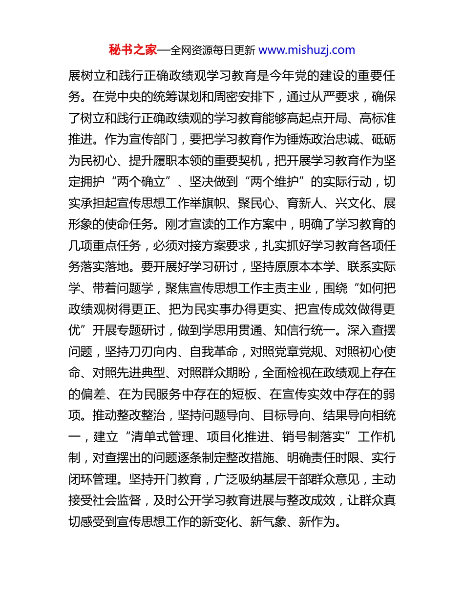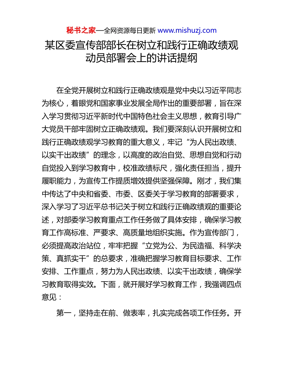 秘书之家—全网资源每日更新 www.mishuzj.com某区委宣传部部长在树立和践行正确政绩观动员部署会上的讲话提纲在全党开展树立和践行正确政绩观是党中央以习近平同志为核心,着眼党和国家事业发展全局作出的重要部署,旨在深入学习贯彻习近平新时代中国特色社会主义思想,教育引导广大党员干部牢固树立正确政绩观。我们要深刻认识开展树立和践行正确政绩观学习教育的重大意义,牢记“为人民出政绩、以实干出政绩”的理念,以高度的政治自觉、思想自觉和行动自觉投入到学习教育中,校准政绩标尺,强化责任担当,提升履职能力,为宣传工作提质增效提供坚强保障。刚才,我们集中传达了中央和省委、市委、区委关于学习教育的部署要求,深入学习了习近平总书记关于树立和践行正确政绩观的重要论述,对部委学习教育重点工作任务做了具体安排,确保学习教育工作高标准、严要求、高质量地组织实施。作为宣传部门,必须提高政治站位,牢牢把握“立党为公、为民造福、科学决策、真抓实干”的总要求,准确把握学习教育目标要求、工作安排、工作重点,努力为人民出政绩、以实干出政绩,确保学习教育取得实效。下面,就开展好学习教育工作,我强调四点意见:第一,坚持走在前、做表率,扎实完成各项工作任务。开秘书之家—全网资源每日更新 www.mishuzj.com展树立和践行正确政绩观学习教育是今年党的建设的重要任务。在党中央的统筹谋划和周密安排下,通过从严要求,确保了树立和践行正确政绩观的学习教育能够高起点开局、高标准推进。作为宣传部门,要把学习教育作为锤炼政治忠诚、砥砺为民初心、提升履职本领的重要契机,把开展学习教育作为坚定拥护“两个确立”、坚决做到“两个维护”的实际行动,切实承担起宣传思想工作举旗帜、聚民心、育新人、兴文化、展形象的使命任务。刚才宣读的工作方案中,明确了学习教育的几项重点任务,必须对接方案要求,扎实抓好学习教育各项任务落实落地。要开展好学习研讨,坚持原原本本学、联系实际学、带着问题学,聚焦宣传思想工作主责主业,围绕“如何把政绩观树得更正、把为民实事办得更实、把宣传成效做得更优”开展专题研讨,做到学思用贯通、知信行统一。深入查摆问题,坚持刀刃向内、自我革命,对照党章党规、对照初心使命、对照先进典型、对照群众期盼,全面检视在政绩观上存在的偏差、在为民服务中存在的短板、在宣传实效中存在的弱项。推动整改整治,坚持问题导向、目标导向、结果导向相统一,建立“清单式管理、项目化推进、销号制落实”工作机制,对查摆出的问题逐条制定整改措施、明确责任时限、实行闭环管理。坚持开门教育,广泛吸纳基层干部群众意见,主动接受社会监督,及时公开学习教育进展与整改成效,让群众真切感受到宣传思想工作的新变化、新气象、新作为。秘书之家—全网资源每日更新 www.mishuzj.com第二,坚持真学习、真整治,确保学习教育走深走实。高质量开展好学习教育,要打牢学习研讨这个基础,坚持学思用贯通、知信行统一,把学习贯彻习近平总书记关于树立和践行正确政绩观的重要论述,同深入学习党的二十届四中全会精神、学习中央规划建议结合起来,同加强调查研究、做好本地区本部门工作结合起来,教育引导党员干部牢牢树立正确政绩观。要突出实践转化,将学习教育成效融入“一月一活动”等具体载体,贯穿理论宣讲、新闻报道、文艺创作、文明实践、舆情引导各环节,以宣传思想工作提质增效的实际成果,检验政绩观是否端正、为民实事是否落实、高质量发展是否有力。要坚持原原本本学,深入领会正确政绩观的精神实质、核心要义、实践要求,搞清楚“为谁创造业绩、创造什么样的业绩、怎样创造业绩”这一根本问题,切实把学习成果转化为谋划工作的思路、推动落实的举措、服务群众的能力,以“时时放心不下”的责任感和“事事心中有底”的执行力,确保每一项任务都落地生根、每一个环节都经得起检验、每一件实事都赢得群众认可。紧扣具体实践学,立足实际,突出特色,找准工作的着力点和切入点,确保学有方向、干有遵循。坚持学以致用、以用促学,把“举旗帜、聚民心、育新人、兴文化、展形象”的使命任务贯穿始终,聚焦群众急...