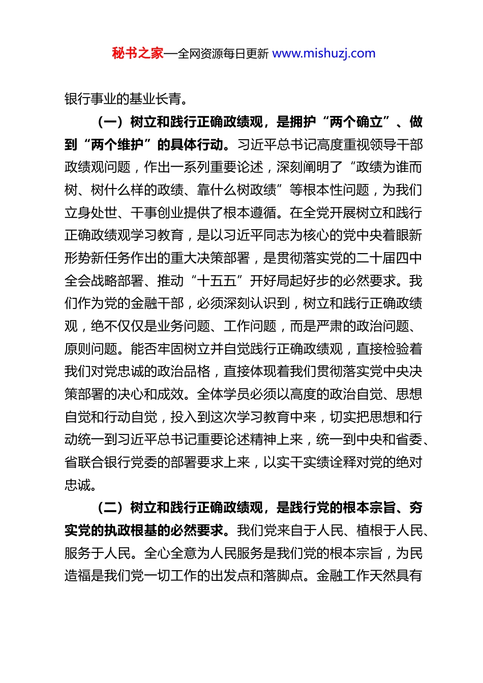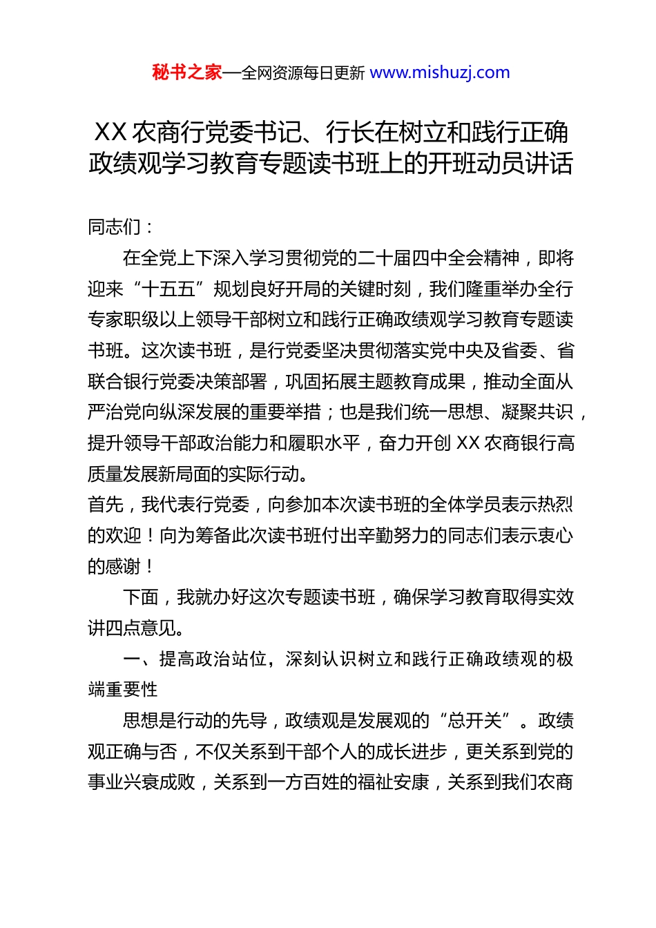 秘书之家—全网资源每日更新 www.mishuzj.comXX 农商行党委书记、行长在树立和践行正确政绩观学习教育专题读书班上的开班动员讲话同志们:在全党上下深入学习贯彻党的二十届四中全会精神,即将迎来“十五五”规划良好开局的关键时刻,我们隆重举办全行专家职级以上领导干部树立和践行正确政绩观学习教育专题读书班。这次读书班,是行党委坚决贯彻落实党中央及省委、省联合银行党委决策部署,巩固拓展主题教育成果,推动全面从严治党向纵深发展的重要举措;也是我们统一思想、凝聚共识,提升领导干部政治能力和履职水平,奋力开创 XX 农商银行高质量发展新局面的实际行动。首先,我代表行党委,向参加本次读书班的全体学员表示热烈的欢迎!向为筹备此次读书班付出辛勤努力的同志们表示衷心的感谢!下面,我就办好这次专题读书班,确保学习教育取得实效讲四点意见。一、提高政治站位,深刻认识树立和践行正确政绩观的极端重要性思想是行动的先导,政绩观是发展观的“总开关”。政绩观正确与否,不仅关系到干部个人的成长进步,更关系到党的事业兴衰成败,关系到一方百姓的福祉安康,关系到我们农商秘书之家—全网资源每日更新 www.mishuzj.com银行事业的基业长青。(一)树立和践行正确政绩观,是拥护“两个确立”、做到“两个维护”的具体行动。习近平总书记高度重视领导干部政绩观问题,作出一系列重要论述,深刻阐明了“政绩为谁而树、树什么样的政绩、靠什么树政绩”等根本性问题,为我们立身处世、干事创业提供了根本遵循。在全党开展树立和践行正确政绩观学习教育,是以习近平同志为核心的党中央着眼新形势新任务作出的重大决策部署,是贯彻落实党的二十届四中全会战略部署、推动“十五五”开好局起好步的必然要求。我们作为党的金融干部,必须深刻认识到,树立和践行正确政绩观,绝不仅仅是业务问题、工作问题,而是严肃的政治问题、原则问题。能否牢固树立并自觉践行正确政绩观,直接检验着我们对党忠诚的政治品格,直接体现着我们贯彻落实党中央决策部署的决心和成效。全体学员必须以高度的政治自觉、思想自觉和行动自觉,投入到这次学习教育中来,切实把思想和行动统一到习近平总书记重要论述精神上来,统一到中央和省委、省联合银行党委的部署要求上来,以实干实绩诠释对党的绝对忠诚。(二)树立和践行正确政绩观,是践行党的根本宗旨、夯实党的执政根基的必然要求。我们党来自于人民、植根于人民、服务于人民。全心全意为人民服务是我们党的根本宗旨,为民造福是我们党一切工作的出发点和落脚点。金融工作天然具有秘书之家—全网资源每日更新 www.mishuzj.com群众属性,我们农商银行因农而生、因农而兴,根植农村、服务“三农”和小微企业是我们的初心使命。我们的服务对象是最广大的基层群众,我们的工作成效直接关系到千家万户的切身利益。只有树立和践行正确政绩观,始终坚持以人民为中心的发展思想,把为民造福作为最大政绩,才能真正赢得群众的信任和支持,才能不断巩固我们党的阶级基础和群众基础,才能让普惠金融的阳光照亮每一个角落,让党的惠民政策通过我们的服务温暖每一颗民心。(三)树立和践行正确政绩观,是推动全行高质量发展、实现“十五五”良好开局的迫切需要。当前,我们正处在全面建设现代化农商银行的关键时期,面临着复杂严峻的内外部环境。经济下行压力加大、金融监管日趋严格、同业竞争日益激烈、数字化转型挑战重重。越是任务艰巨、挑战严峻,越需要领导干部树立和践行正确政绩观,保持战略定力,把准发展方向。过去一个时期,我们取得了一些成绩,但也要清醒看到,少数干部在政绩观上还存在偏差:有的急功近利,重显绩轻潜绩,热衷于“短平快”项目,忽视打基础、利长远的工作;有的脱离实际,盲目铺摊子、上项目,造成资源浪费和风险隐患;有的重业务轻党建,重速度轻质量,重形式轻实效,等等。这些问题,已经成为阻碍我们高质量发展的“拦路虎”和“绊脚石”。只有通过学习教育,彻底纠治这些错误观念,引导全体干部特别是领导干部牢固树立正确政绩观,坚持“立党为公、秘书之家—全网资源每日更新 www.mishuzj.com为民造福、科学...