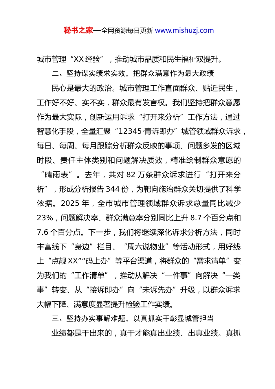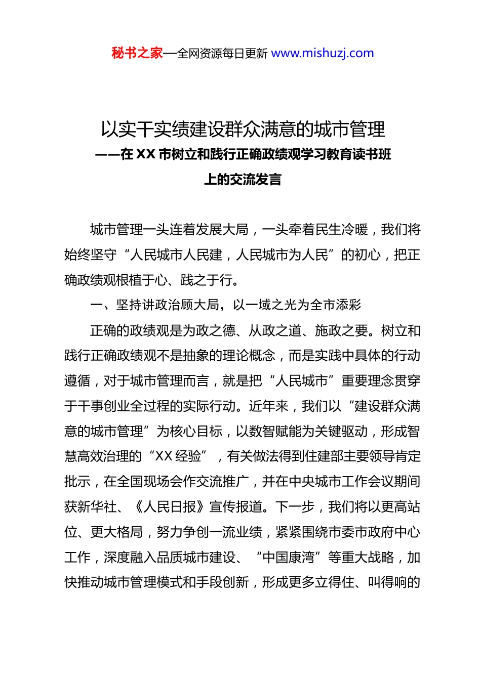 秘书之家—全网资源每日更新 www.mishuzj.com以实干实绩建设群众满意的城市管理——在 XX 市树立和践行正确政绩观学习教育读书班上的交流发言城市管理一头连着发展大局,一头牵着民生冷暖,我们将始终坚守“人民城市人民建,人民城市为人民”的初心,把正确政绩观根植于心、践之于行。一、坚持讲政治顾大局,以一域之光为全市添彩正确的政绩观是为政之德、从政之道、施政之要。树立和践行正确政绩观不是抽象的理论概念,而是实践中具体的行动遵循,对于城市管理而言,就是把“人民城市”重要理念贯穿于干事创业全过程的实际行动。近年来,我们以“建设群众满意的城市管理”为核心目标,以数智赋能为关键驱动,形成智慧高效治理的“XX 经验”,有关做法得到住建部主要领导肯定批示,在全国现场会作交流推广,并在中央城市工作会议期间获新华社、《人民日报》宣传报道。下一步,我们将以更高站位、更大格局,努力争创一流业绩,紧紧围绕市委市政府中心工作,深度融入品质城市建设、“中国康湾”等重大战略,加快推动城市管理模式和手段创新,形成更多立得住、叫得响的秘书之家—全网资源每日更新 www.mishuzj.com城市管理“XX 经验”,推动城市品质和民生福祉双提升。二、坚持谋实绩求实效,把群众满意作为最大政绩民心是最大的政治。城市管理工作直面群众、贴近民生,工作好不好、实不实,群众最有发言权。我们坚持把群众意愿作为最大实际,创新运用诉求“打开来分析”工作方法,通过智慧化手段,全量汇聚“12345·青诉即办”城管领域群众诉求,每日、每周、每月跟踪分析群众反映的事项、问题多发的区域时段、责任主体类别和问题解决质效,精准绘制群众意愿的“晴雨表”。去年,共对 82 万条群众诉求进行“打开来分析”,形成分析报告 344 份,为靶向施治群众关切提供了科学依据。2025 年,全市城市管理领域群众诉求总量同比减少23%,问题解决率、群众满意率分别同比上升 8.7 个百分点和7.6 个百分点。下一步,我们将继续深化诉求分析方法,同时丰富线下“身边”栏目、“周六说物业”等活动形式,用好线上“点靓 XX”“码上办”等平台渠道,将群众的“需求清单”变为我们的“工作清单”,推动从解决“一件事”向解决“一类事”转变、从“接诉即办”向“未诉先办”升级,以群众诉求大幅下降、满意度显著提升检验工作实绩。三、坚持办实事解难题,以真抓实干彰显城管担当业绩都是干出来的,真干才能真出业绩、出真业绩。真抓秘书之家—全网资源每日更新 www.mishuzj.com实干、攻坚克难历来是城管人的鲜明底色。我们坚持把市民群众的急难愁盼作为主攻方向,把城市治理的短板弱项作为发力重点,当好市民群众的“办事员”和城市治理的“大管家”。聚焦问题导向,开展物业服务品质提升行动,继续推进 100 个问题小区综合治理、1500 个开放楼院因地制宜划分物业管理区域,攻坚治理侵占业主公共收益、开放楼院长效管理等“老大难”问题。聚焦群众需要,高质高效推动公共收益账户开立、老旧电梯更新、老化供热管网改造等民生实事落地见效,让市民群众获得感更足。去年,我们争取 1.3 亿元超长期特别国债支持 892 台老旧电梯更新改造。今年,力争更新指标 3500 台以上,资金规模突破 6 亿元。聚焦市容提质,开展占道经营、乱堆乱放等市容环境突出问题集中整治,实施 50 处城市小微公共空间改造提升和 676 条背街小巷、无名路综合整治。我们还将在燃气、供热等民生保障领域持续优化服务供给,本采暖季以来,全市供热领域群众诉求总量在上一采暖季同比大幅减少 52%的基础上,再度同比减少 37%。事虽小,不为不成;路虽远,行则将至。我们将坚持用心用情用力办好一件件小事,打好一场场攻坚硬仗,努力让城市更宜居,让群众更暖心。四、坚持打基础利长远,以常态长效筑牢发展根基我们将坚决摒弃“大呼隆”“一阵风”式的粗放管理模式秘书之家—全网资源每日更新 www.mishuzj.com坚持系统观念,推动城市精细化管理常态化、长效化。更加注重科技赋能,出台城市管理领域“人工智能+”三年行动计划,充分发挥城市运行管理服务平台领先优势,推动智能网联车、智能穿...