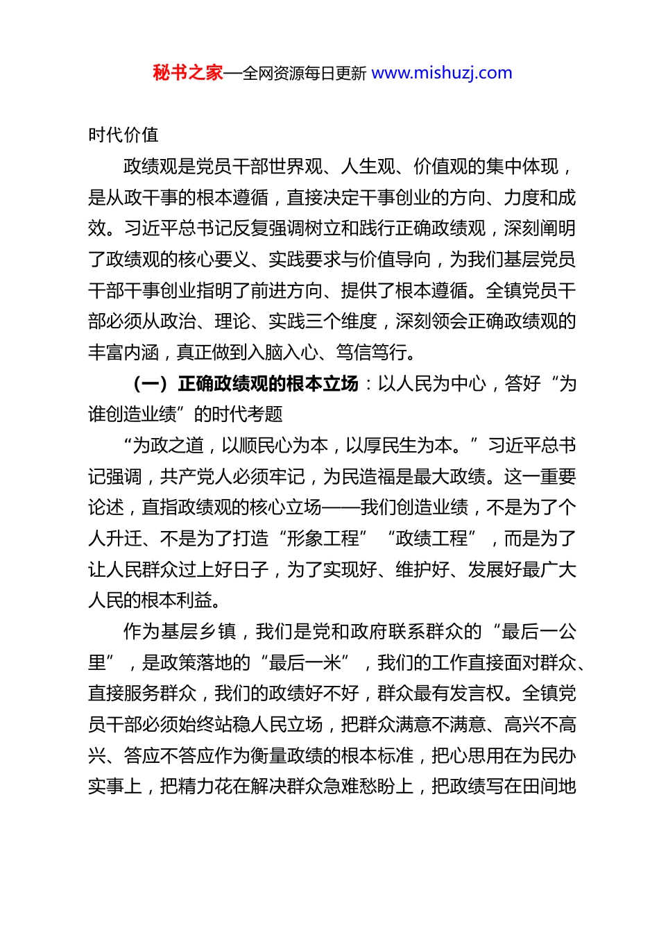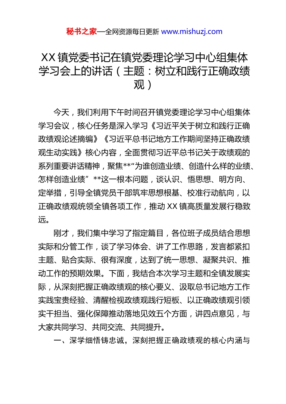 秘书之家—全网资源每日更新 www.mishuzj.comXX 镇党委书记在镇党委理论学习中心组集体学习会上的讲话(主题:树立和践行正确政绩观)今天,我们利用下午时间召开镇党委理论学习中心组集体学习会议,核心任务是深入学习《习近平关于树立和践行正确政绩观论述摘编》《习近平总书记地方工作期间坚持正确政绩观生动实践》核心内容,全面贯彻习近平总书记关于政绩观的系列重要讲话精神,聚焦**“为谁创造业绩、创造什么样的业绩、怎样创造业绩”**这一根本问题,谈认识、悟思想、明方向、定举措,引导全镇党员干部筑牢思想根基、校准行动航向,以正确政绩观统领全镇各项工作,推动 XX 镇高质量发展行稳致远。刚才,我们集中学习了指定篇目,各位班子成员结合思想实际和分管工作,谈了学习体会、讲了工作思路,发言都紧扣主题、贴合实际、很有深度,达到了统一思想、凝聚共识、推动工作的预期效果。下面,我结合本次学习主题和全镇发展实际,从深刻把握正确政绩观的核心要义、汲取总书记地方工作实践宝贵经验、清醒检视政绩观践行短板、以正确政绩观引领实干担当、强化保障推动落地见效五个方面,讲四点意见,与大家共同学习、共同交流、共同提升。一、深学细悟铸忠诚,深刻把握正确政绩观的核心内涵与秘书之家—全网资源每日更新 www.mishuzj.com时代价值政绩观是党员干部世界观、人生观、价值观的集中体现,是从政干事的根本遵循,直接决定干事创业的方向、力度和成效。习近平总书记反复强调树立和践行正确政绩观,深刻阐明了政绩观的核心要义、实践要求与价值导向,为我们基层党员干部干事创业指明了前进方向、提供了根本遵循。全镇党员干部必须从政治、理论、实践三个维度,深刻领会正确政绩观的丰富内涵,真正做到入脑入心、笃信笃行。(一)正确政绩观的根本立场:以人民为中心,答好“为谁创造业绩”的时代考题“为政之道,以顺民心为本,以厚民生为本。”习近平总书记强调,共产党人必须牢记,为民造福是最大政绩。这一重要论述,直指政绩观的核心立场——我们创造业绩,不是为了个人升迁、不是为了打造“形象工程”“政绩工程”,而是为了让人民群众过上好日子,为了实现好、维护好、发展好最广大人民的根本利益。作为基层乡镇,我们是党和政府联系群众的“最后一公里”,是政策落地的“最后一米”,我们的工作直接面对群众、直接服务群众,我们的政绩好不好,群众最有发言权。全镇党员干部必须始终站稳人民立场,把群众满意不满意、高兴不高兴、答应不答应作为衡量政绩的根本标准,把心思用在为民办实事上,把精力花在解决群众急难愁盼上,把政绩写在田间地秘书之家—全网资源每日更新 www.mishuzj.com头、写在群众心坎上,让每一项工作都经得起群众、实践和历史的检验。(二)正确政绩观的根本标准:务实长远为民,答好“创造什么样的业绩”的实践考题正确的政绩,是实事求是、求真务实的实绩,是打基础、利长远、惠民生的潜绩,是统筹发展、兼顾全局的优绩,绝不是急功近利、华而不实的虚绩,更不是劳民伤财、脱离实际的败绩。一是要创造经得起历史检验的业绩。坚决摒弃“重当前轻长远、重显绩轻潜绩”的短视思维,多做谋长远、固根本的工作,比如乡村基础设施建设、基层党组织建设、乡风文明培育、生态环境保护等,这些工作看似见效慢、不显山露水,但却是乡镇发展的根基,是惠及子孙后代的大事。二是要创造经得起实践检验的业绩。一切从 XX 镇实际出发,不搞脱离实际的盲目攀比,不喊不切实际的空口号,立足镇情、因地制宜,聚焦产业发展、民生保障、乡村振兴等重点工作,一步一个脚印抓落实,确保每一项决策、每一项工作都符合发展规律、符合镇情实际。三是要创造经得起群众检验的业绩。始终把民生放在首位,聚焦群众关心的就业、教育、医疗、养老、住房、出行等问题,办好一件件民生实事,解决一个个具体难题,让群众的获得感、幸福感、安全感更加充实、更有保障、更可持续。(三)正确政绩观的根本路径:真抓实干担当,答好“怎秘书之家—全网资源每日更新 www.mishuzj.com样创造业绩”的行动考题“道虽迩,不行不至;事虽小,不为不成。”正确的政绩,不是喊...