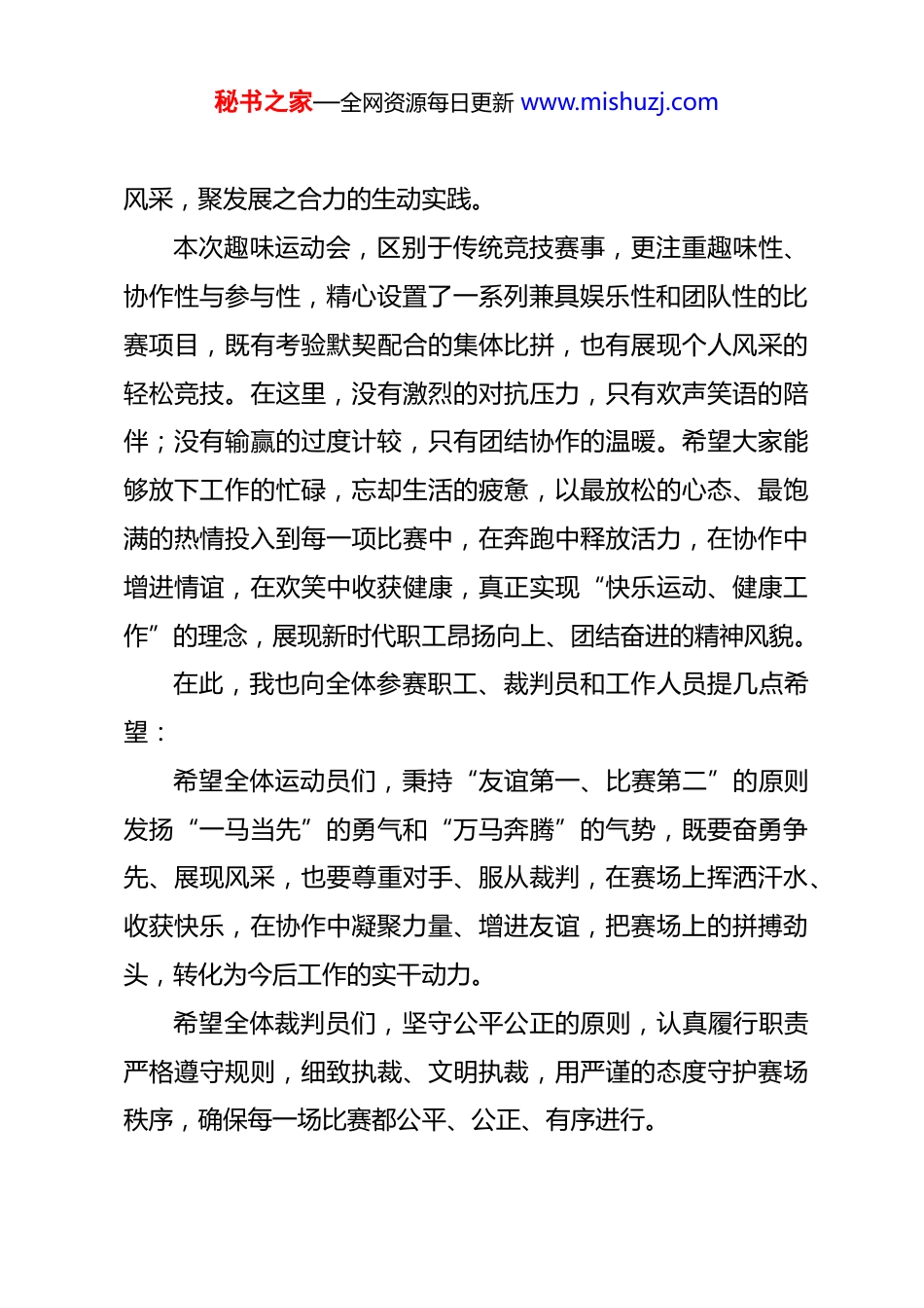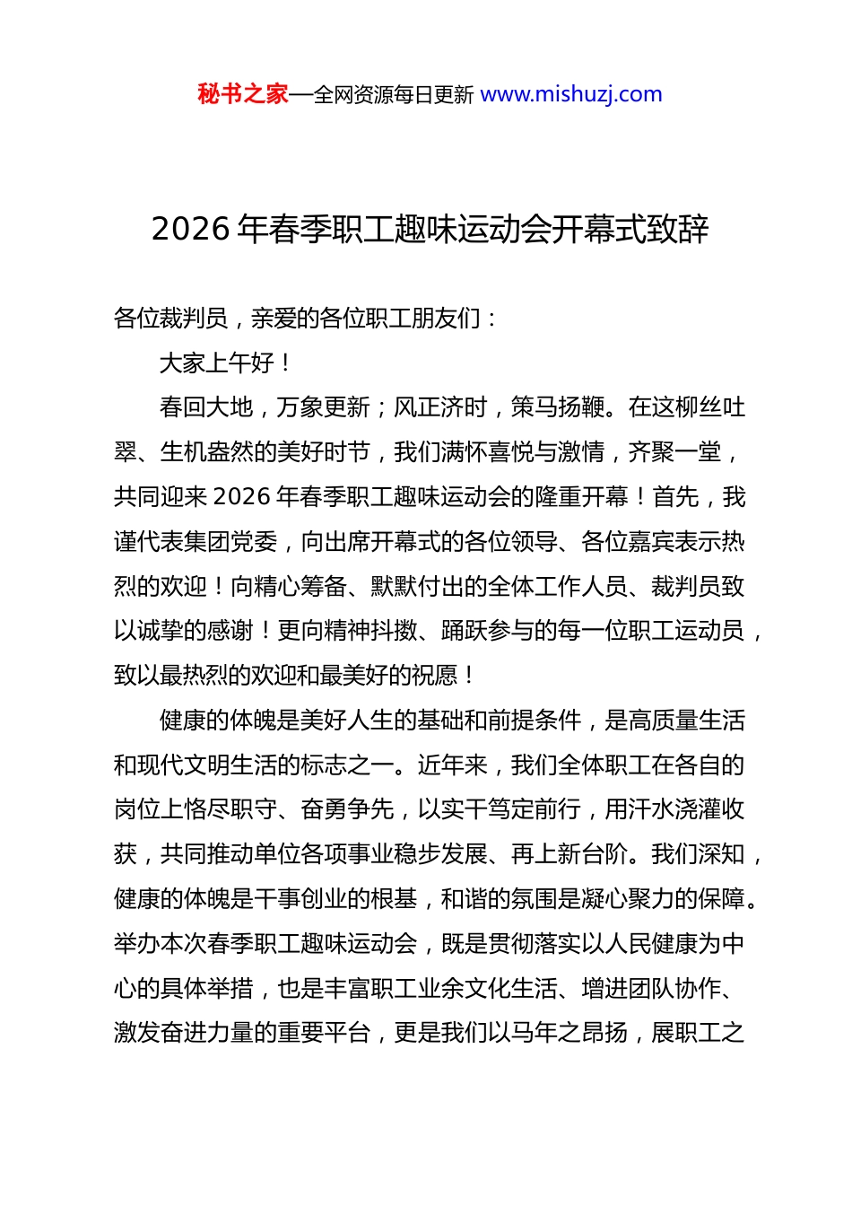 秘书之家—全网资源每日更新 www.mishuzj.com2026 年春季职工趣味运动会开幕式致辞各位裁判员,亲爱的各位职工朋友们:大家上午好!春回大地,万象更新;风正济时,策马扬鞭。在这柳丝吐翠、生机盎然的美好时节,我们满怀喜悦与激情,齐聚一堂,共同迎来 2026 年春季职工趣味运动会的隆重开幕!首先,我谨代表集团党委,向出席开幕式的各位领导、各位嘉宾表示热烈的欢迎!向精心筹备、默默付出的全体工作人员、裁判员致以诚挚的感谢!更向精神抖擞、踊跃参与的每一位职工运动员,致以最热烈的欢迎和最美好的祝愿!健康的体魄是美好人生的基础和前提条件,是高质量生活和现代文明生活的标志之一。近年来,我们全体职工在各自的岗位上恪尽职守、奋勇争先,以实干笃定前行,用汗水浇灌收获,共同推动单位各项事业稳步发展、再上新台阶。我们深知,健康的体魄是干事创业的根基,和谐的氛围是凝心聚力的保障。举办本次春季职工趣味运动会,既是贯彻落实以人民健康为中心的具体举措,也是丰富职工业余文化生活、增进团队协作、激发奋进力量的重要平台,更是我们以马年之昂扬,展职工之秘书之家—全网资源每日更新 www.mishuzj.com风采,聚发展之合力的生动实践。本次趣味运动会,区别于传统竞技赛事,更注重趣味性、协作性与参与性,精心设置了一系列兼具娱乐性和团队性的比赛项目,既有考验默契配合的集体比拼,也有展现个人风采的轻松竞技。在这里,没有激烈的对抗压力,只有欢声笑语的陪伴;没有输赢的过度计较,只有团结协作的温暖。希望大家能够放下工作的忙碌,忘却生活的疲惫,以最放松的心态、最饱满的热情投入到每一项比赛中,在奔跑中释放活力,在协作中增进情谊,在欢笑中收获健康,真正实现“快乐运动、健康工作”的理念,展现新时代职工昂扬向上、团结奋进的精神风貌。在此,我也向全体参赛职工、裁判员和工作人员提几点希望:希望全体运动员们,秉持“友谊第一、比赛第二”的原则发扬“一马当先”的勇气和“万马奔腾”的气势,既要奋勇争先、展现风采,也要尊重对手、服从裁判,在赛场上挥洒汗水、收获快乐,在协作中凝聚力量、增进友谊,把赛场上的拼搏劲头,转化为今后工作的实干动力。希望全体裁判员们,坚守公平公正的原则,认真履行职责严格遵守规则,细致执裁、文明执裁,用严谨的态度守护赛场秩序,确保每一场比赛都公平、公正、有序进行。秘书之家—全网资源每日更新 www.mishuzj.com希望全体工作人员,立足岗位、履职尽责,细致做好赛事组织、后勤保障、安全防护等各项工作,用心服务、主动作为,为本次运动会的顺利开展保驾护航,让大家能够安心参赛、舒心比拼。职工朋友们,春光不负赶路人,时代眷顾奋斗者。2026年是充满希望与挑战的一年,也是我们策马扬鞭、续写辉煌的一年。希望大家以本次趣味运动会为契机,把赛场上展现出的团结协作、奋勇拼搏、永不言弃的精神,融入到今后的工作和生活中,以更强健的体魄、更饱满的热情、更昂扬的斗志,立足本职、担当作为,凝心聚力、奋勇争先,共同谱写单位高质量发展的新篇章!最后,衷心祝愿本次 2026 年春季职工趣味运动会圆满成功!祝愿各位运动员赛出风格、赛出水平,收获健康、收获友谊、收获快乐!祝愿各位领导、各位职工朋友们身体健康、工作顺利、阖家幸福、马到成功!现在,我宣布:2026 年春季职工趣味运动会,正式开幕!