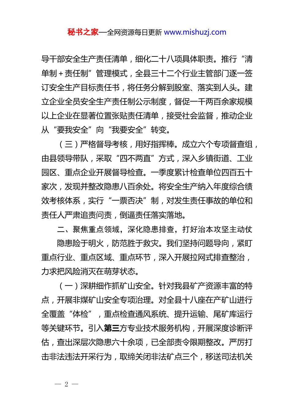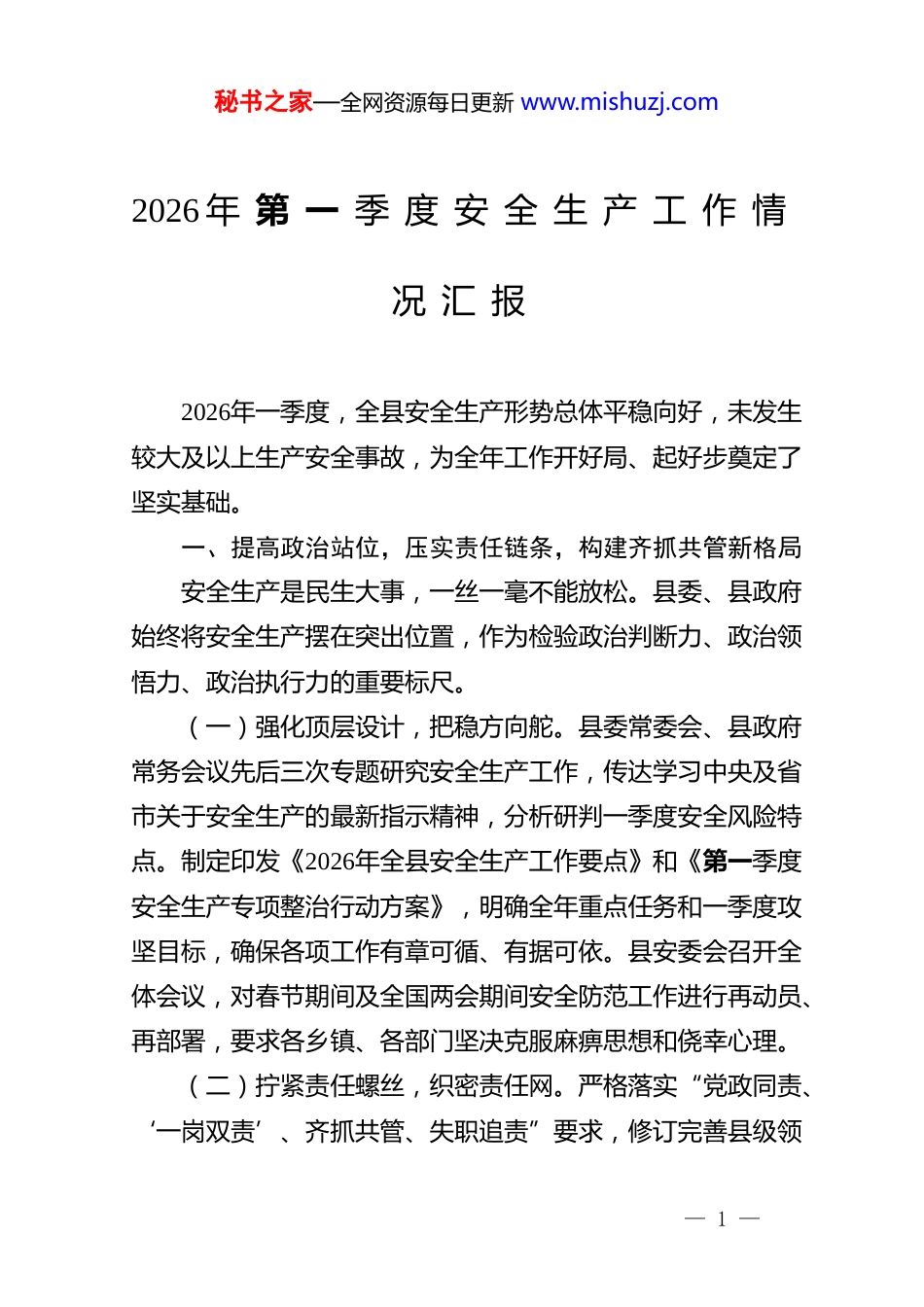 秘书之家—全网资源每日更新 www.mishuzj.com2026 年 第 一 季 度 安 全 生 产 工 作 情况 汇 报2026年一季度,全县安全生产形势总体平稳向好,未发生较大及以上生产安全事故,为全年工作开好局、起好步奠定了坚实基础。一、提高政治站位,压实责任链条,构建齐抓共管新格局安全生产是民生大事,一丝一毫不能放松。县委、县政府始终将安全生产摆在突出位置,作为检验政治判断力、政治领悟力、政治执行力的重要标尺。(一)强化顶层设计,把稳方向舵。县委常委会、县政府常务会议先后三次专题研究安全生产工作,传达学习中央及省市关于安全生产的最新指示精神,分析研判一季度安全风险特点。制定印发《2026年全县安全生产工作要点》和《第一季度安全生产专项整治行动方案》,明确全年重点任务和一季度攻坚目标,确保各项工作有章可循、有据可依。县安委会召开全体会议,对春节期间及全国两会期间安全防范工作进行再动员、再部署,要求各乡镇、各部门坚决克服麻痹思想和侥幸心理。(二)拧紧责任螺丝,织密责任网。严格落实“党政同责、‘一岗双责’、齐抓共管、失职追责”要求,修订完善县级领— 1 —秘书之家—全网资源每日更新 www.mishuzj.com导干部安全生产责任清单,细化二十八项具体职责。推行“清单制+责任制”管理模式,全县三十二个行业主管部门逐一签订安全生产目标责任书,将任务分解到股室、落实到人头。建立企业全员安全生产责任制公示制度,督促一千两百余家规模以上企业在显著位置张贴责任清单,接受社会监督,推动企业从“要我安全”向“我要安全”转变。(三)严格督导考核,用好指挥棒。成立六个专项督查组,由县领导带队,采取“四不两直”方式,深入乡镇街道、工业园区、重点企业开展督导检查。一季度累计检查单位四百五十家次,发现并整改隐患八百余处。将安全生产纳入年度综合绩效考核体系,实行“一票否决”制,对发生责任事故的单位和责任人严肃追责问责,倒逼责任落实落地。二、聚焦重点领域,深化隐患排查,打好治本攻坚主动仗隐患险于明火,防范胜于救灾。我们坚持问题导向,紧盯重点行业、重点区域、重点环节,深入开展拉网式排查整治,力求把风险消灭在萌芽状态。(一)深耕细作抓矿山安全。针对我县矿产资源丰富的特点,开展非煤矿山安全专项治理。对全县十八座在产矿山进行全覆盖“体检”,重点检查通风系统、提升运输、尾矿库运行等关键环节。引入第三方专业技术服务机构,开展深度诊断评估,查出深层次隐患六十余项,已全部责令限期整改。严厉打击非法违法开采行为,取缔关闭非法矿点三个,移送司法机关— 2 —秘书之家—全网资源每日更新 www.mishuzj.com处理两人,形成了强大震慑。(二)严防死守抓消防安全。结合冬春火灾防控特点,聚焦商场市场、宾馆饭店、公共娱乐场所、老旧小区等人员密集场所,开展消防通道畅通行动和电气火灾综合治理。清理违规占用消防通道行为一百二十余起,更换老化电气线路三十余公里。加强对“九小场所”和沿街门店的巡查,推广安装独立式感烟火灾探测报警器五千余个,提升早期预警能力。一季度,全县火灾起数同比下降百分之二十五,未发生亡人火灾事故。(三)精管细控抓道路交通。针对春运期间车流人流激增的情况,公安交警、交通运输等部门联勤联动,在国省干道、农村公路设立临时检查点八十个,严查超速超载、酒驾醉驾、疲劳驾驶等违法违规行为。加强恶劣天气交通疏导管控,及时发布路况信息和预警提示。推进农村公路安全生命防护工程,新安装波形护栏十五公里,改造危桥两座,有效改善了农村道路通行条件。一季度,道路交通事故死亡人数创历史同期新低。(四)举一反三抓工贸危化。对涉爆粉尘、有限空间、液氨制冷等高危工艺企业进行专项排查,督促企业完善操作规程,加强员工培训。开展危险化学品储存使用安全整治,对全县四十家危化品经营企业进行全面核查,规范储存管理,消除泄漏风险。推动工贸企业开展标准化建设,新增二级标准化企业五家,提升本质安全水平。三、夯实基层基础,提升应急能力,筑牢防灾减灾防火墙— 3 —秘书之家—全网资源每日更新 www.mishuzj.com基础不牢,...