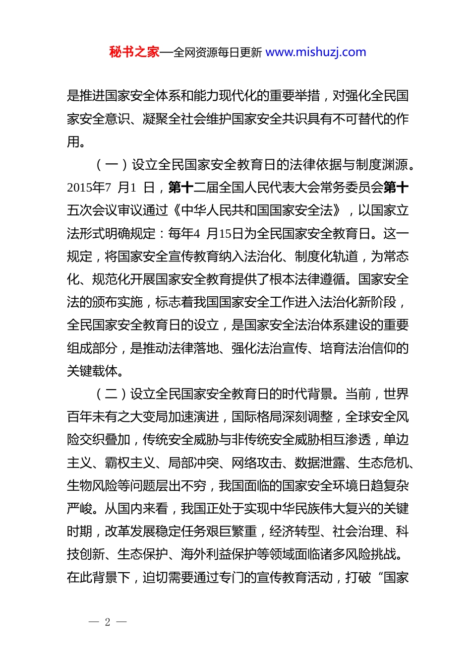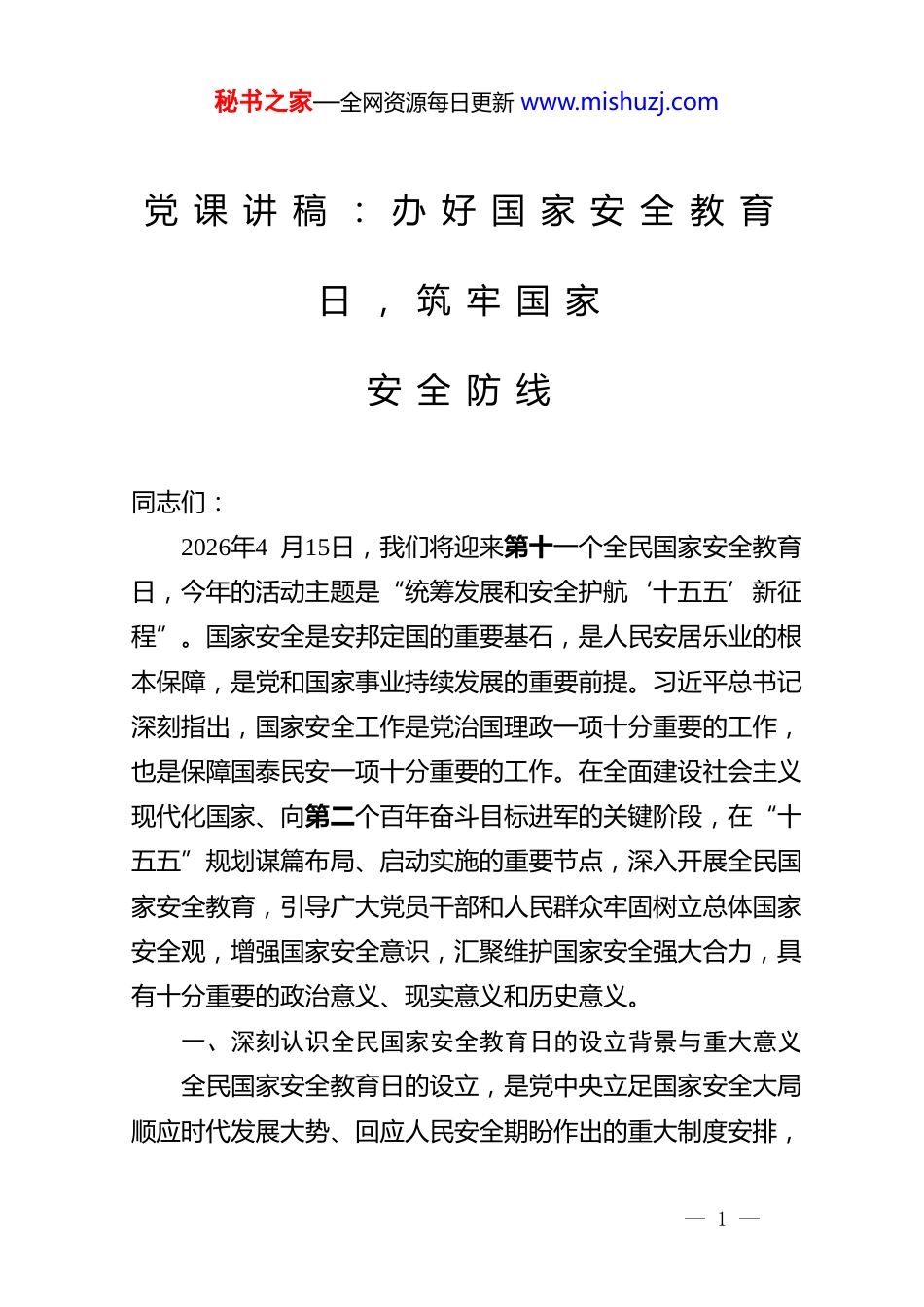 秘书之家—全网资源每日更新 www.mishuzj.com党 课 讲 稿 : 办 好 国 家 安 全 教 育日 , 筑 牢 国 家安 全 防 线同志们:2026年4 月15日,我们将迎来第十一个全民国家安全教育日,今年的活动主题是“统筹发展和安全护航‘十五五’新征程”。国家安全是安邦定国的重要基石,是人民安居乐业的根本保障,是党和国家事业持续发展的重要前提。习近平总书记深刻指出,国家安全工作是党治国理政一项十分重要的工作,也是保障国泰民安一项十分重要的工作。在全面建设社会主义现代化国家、向第二个百年奋斗目标进军的关键阶段,在“十五五”规划谋篇布局、启动实施的重要节点,深入开展全民国家安全教育,引导广大党员干部和人民群众牢固树立总体国家安全观,增强国家安全意识,汇聚维护国家安全强大合力,具有十分重要的政治意义、现实意义和历史意义。一、深刻认识全民国家安全教育日的设立背景与重大意义全民国家安全教育日的设立,是党中央立足国家安全大局顺应时代发展大势、回应人民安全期盼作出的重大制度安排,— 1 —秘书之家—全网资源每日更新 www.mishuzj.com是推进国家安全体系和能力现代化的重要举措,对强化全民国家安全意识、凝聚全社会维护国家安全共识具有不可替代的作用。(一)设立全民国家安全教育日的法律依据与制度渊源。2015年7 月1 日,第十二届全国人民代表大会常务委员会第十五次会议审议通过《中华人民共和国国家安全法》,以国家立法形式明确规定:每年4 月15日为全民国家安全教育日。这一规定,将国家安全宣传教育纳入法治化、制度化轨道,为常态化、规范化开展国家安全教育提供了根本法律遵循。国家安全法的颁布实施,标志着我国国家安全工作进入法治化新阶段,全民国家安全教育日的设立,是国家安全法治体系建设的重要组成部分,是推动法律落地、强化法治宣传、培育法治信仰的关键载体。(二)设立全民国家安全教育日的时代背景。当前,世界百年未有之大变局加速演进,国际格局深刻调整,全球安全风险交织叠加,传统安全威胁与非传统安全威胁相互渗透,单边主义、霸权主义、局部冲突、网络攻击、数据泄露、生态危机、生物风险等问题层出不穷,我国面临的国家安全环境日趋复杂严峻。从国内来看,我国正处于实现中华民族伟大复兴的关键时期,改革发展稳定任务艰巨繁重,经济转型、社会治理、科技创新、生态保护、海外利益保护等领域面临诸多风险挑战。在此背景下,迫切需要通过专门的宣传教育活动,打破“国家— 2 —秘书之家—全网资源每日更新 www.mishuzj.com安全与己无关”的错误认知,破除“国家安全只是政府和军队的事”的片面观念,让全社会深刻认识到国家安全的极端重要性。(三)设立全民国家安全教育日的重大意义。一是强化全民国家安全意识,推动总体国家安全观深入人心,引导全社会形成“国家安全、人人有责”的思想共识。二是普及国家安全法律知识,提升公民和组织维护国家安全的法治素养,推动形成尊法学法守法用法的良好氛围。三是凝聚维护国家安全合力,构建起党委领导、政府负责、社会协同、公众参与、法治保障的国家安全工作格局。四是护航高质量发展大局,以高水平安全保障高质量发展,为“十五五”时期经济社会持续健康发展保驾护航。据统计,自全民国家安全教育日设立以来,全国累计开展各类宣传教育活动超120 万场,覆盖干部群众9 亿人次,全社会国家安全意识显著提升,危害国家安全举报线索年均增长15%以上,全民共同维护国家安全的良好局面初步形成。实践充分证明,全民国家安全教育日已成为强化国家安全宣传、凝聚国家安全共识、筑牢国家安全防线的重要平台。二、准确把握国家安全的核心内涵与本质要求准确理解什么是国家安全,是树立正确国家安全观、自觉维护国家安全的前提。《中华人民共和国国家安全法》对国家安全作出了权威、清晰、全面的界定,为我们认识国家安全、践行国家安全要求提供了根本遵循。— 3 —秘书之家—全网资源每日更新 www.mishuzj.com(一)国家安全的法定定义。根据国家安全法规定:国家安全是指国家政权、主权统一和领土完整、人民福祉、经济社会可持续发展和国...
