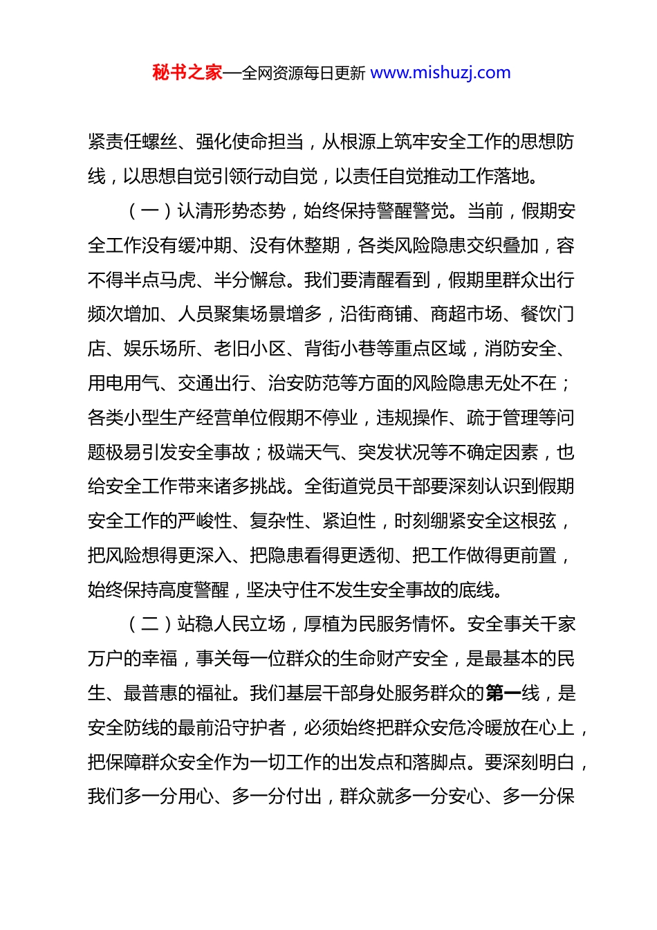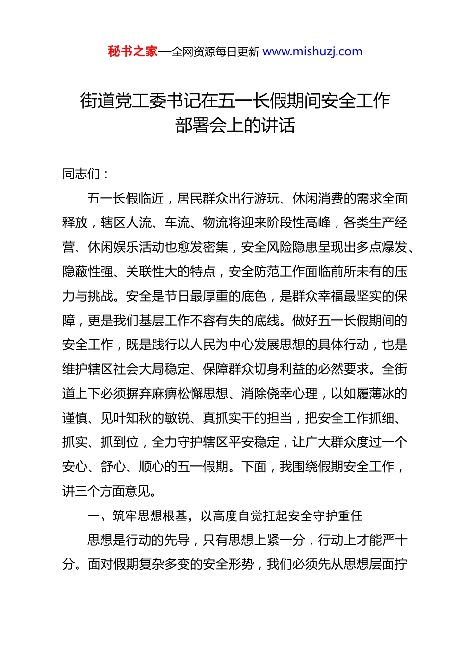 秘书之家—全网资源每日更新 www.mishuzj.com街道党工委书记在五一长假期间安全工作部署会上的讲话 同志们:五一长假临近,居民群众出行游玩、休闲消费的需求全面释放,辖区人流、车流、物流将迎来阶段性高峰,各类生产经营、休闲娱乐活动也愈发密集,安全风险隐患呈现出多点爆发、隐蔽性强、关联性大的特点,安全防范工作面临前所未有的压力与挑战。安全是节日最厚重的底色,是群众幸福最坚实的保障,更是我们基层工作不容有失的底线。做好五一长假期间的安全工作,既是践行以人民为中心发展思想的具体行动,也是维护辖区社会大局稳定、保障群众切身利益的必然要求。全街道上下必须摒弃麻痹松懈思想、消除侥幸心理,以如履薄冰的谨慎、见叶知秋的敏锐、真抓实干的担当,把安全工作抓细、抓实、抓到位,全力守护辖区平安稳定,让广大群众度过一个安心、舒心、顺心的五一假期。下面,我围绕假期安全工作,讲三个方面意见。一、筑牢思想根基,以高度自觉扛起安全守护重任思想是行动的先导,只有思想上紧一分,行动上才能严十分。面对假期复杂多变的安全形势,我们必须先从思想层面拧秘书之家—全网资源每日更新 www.mishuzj.com紧责任螺丝、强化使命担当,从根源上筑牢安全工作的思想防线,以思想自觉引领行动自觉,以责任自觉推动工作落地。(一)认清形势态势,始终保持警醒警觉。当前,假期安全工作没有缓冲期、没有休整期,各类风险隐患交织叠加,容不得半点马虎、半分懈怠。我们要清醒看到,假期里群众出行频次增加、人员聚集场景增多,沿街商铺、商超市场、餐饮门店、娱乐场所、老旧小区、背街小巷等重点区域,消防安全、用电用气、交通出行、治安防范等方面的风险隐患无处不在;各类小型生产经营单位假期不停业,违规操作、疏于管理等问题极易引发安全事故;极端天气、突发状况等不确定因素,也给安全工作带来诸多挑战。全街道党员干部要深刻认识到假期安全工作的严峻性、复杂性、紧迫性,时刻绷紧安全这根弦,把风险想得更深入、把隐患看得更透彻、把工作做得更前置,始终保持高度警醒,坚决守住不发生安全事故的底线。(二)站稳人民立场,厚植为民服务情怀。安全事关千家万户的幸福,事关每一位群众的生命财产安全,是最基本的民生、最普惠的福祉。我们基层干部身处服务群众的第一线,是安全防线的最前沿守护者,必须始终把群众安危冷暖放在心上,把保障群众安全作为一切工作的出发点和落脚点。要深刻明白,我们多一分用心、多一分付出,群众就多一分安心、多一分保秘书之家—全网资源每日更新 www.mishuzj.com障;每一次隐患排查、每一次宣传引导、每一次应急值守,都是在为群众筑牢安全屏障。要始终秉持为民初心,主动扛起守护平安的责任,以对群众高度负责的态度,把安全工作做到群众心坎上,用我们的辛苦指数换取群众的安全指数、幸福指数,让群众在假期里真正感受到安全感、归属感。(三)强化责任担当,压实全域工作责任。安全工作没有旁观者、没有局外人,人人都是责任人、个个都是守护者。假期安全工作覆盖辖区每一个角落、涉及每一个领域,必须构建起横向到边、纵向到底、责任到人、闭环落实的责任体系,杜绝责任悬空、工作虚转。街道各科室、各社区(村)、辖区各单位要牢固树立“安全无小事、责任大于天”的理念,严格落实属地管理责任、行业监管责任、主体责任,明确工作分工、细化工作举措、拧紧责任链条。党员干部要带头履职尽责,主动担当作为,把安全责任扛在肩上、落在行动上,做到守土有责、守土负责、守土尽责,以人人担责、层层尽责的强大合力,凝聚起守护辖区安全的坚实屏障。二、聚焦关键环节,以精准举措筑牢安全防护屏障假期安全工作点多面广、任务繁重,必须抓住重点、找准关键、精准发力,聚焦辖区安全风险最突出、群众最关心、最容易出问题的领域和环节,下足绣花功夫、做实精细文章,全秘书之家—全网资源每日更新 www.mishuzj.com方位、全流程、全要素排查整治隐患,切实把风险化解在萌芽状态、把问题解决在事发之前。(一)紧盯重点领域,全面排查整治风险隐患。隐患险于明火,防范胜于救灾。做好假期安全工作,核心在于把隐患排查整治...