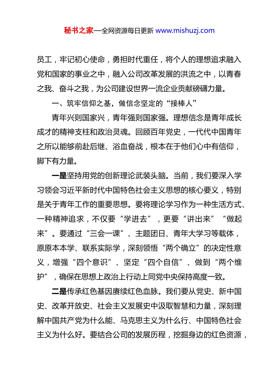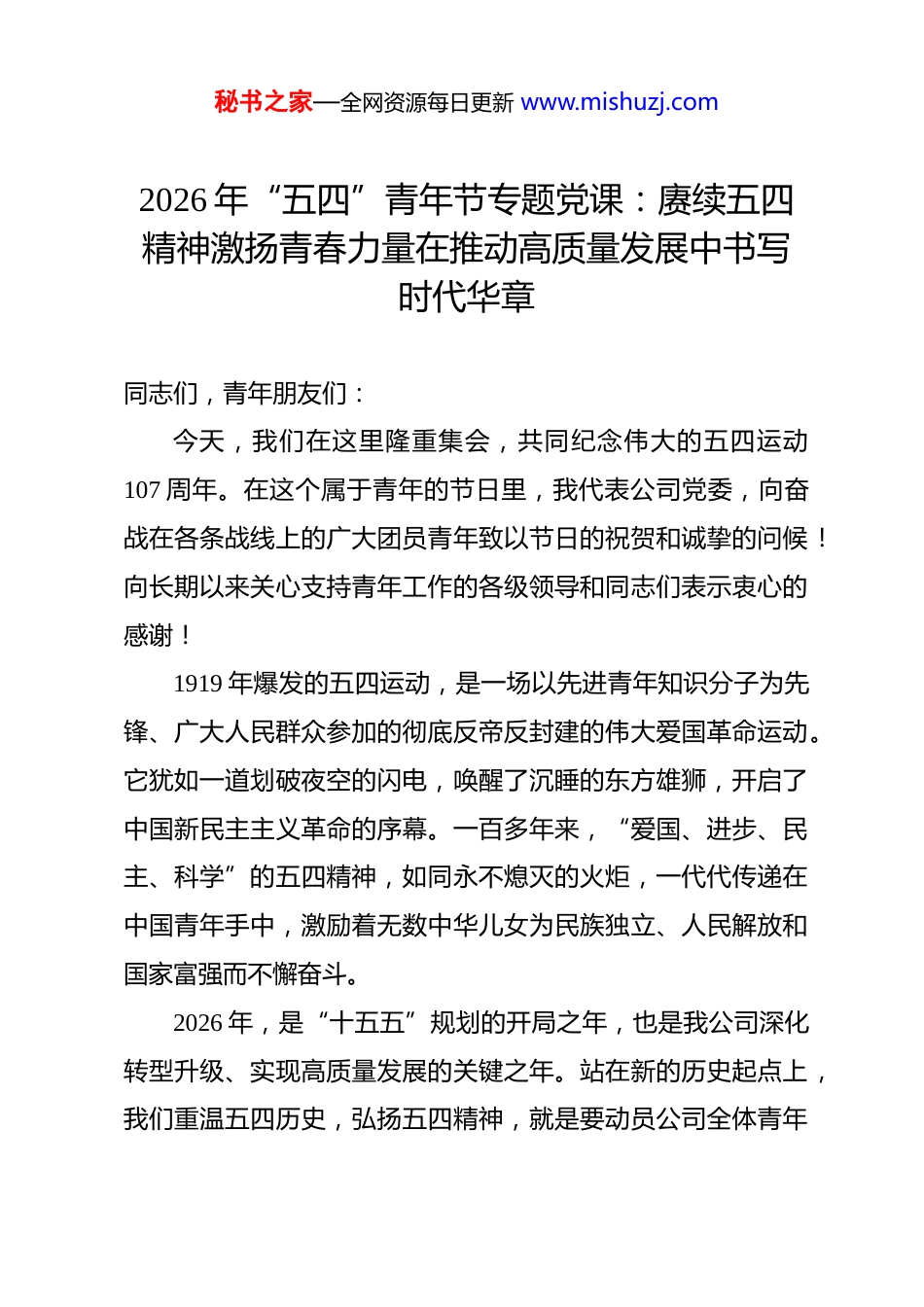 秘书之家—全网资源每日更新 www.mishuzj.com2026 年“五四”青年节专题党课:赓续五四精神激扬青春力量在推动高质量发展中书写时代华章 同志们,青年朋友们:今天,我们在这里隆重集会,共同纪念伟大的五四运动107 周年。在这个属于青年的节日里,我代表公司党委,向奋战在各条战线上的广大团员青年致以节日的祝贺和诚挚的问候!向长期以来关心支持青年工作的各级领导和同志们表示衷心的感谢!1919 年爆发的五四运动,是一场以先进青年知识分子为先锋、广大人民群众参加的彻底反帝反封建的伟大爱国革命运动。它犹如一道划破夜空的闪电,唤醒了沉睡的东方雄狮,开启了中国新民主主义革命的序幕。一百多年来,“爱国、进步、民主、科学”的五四精神,如同永不熄灭的火炬,一代代传递在中国青年手中,激励着无数中华儿女为民族独立、人民解放和国家富强而不懈奋斗。2026 年,是“十五五”规划的开局之年,也是我公司深化转型升级、实现高质量发展的关键之年。站在新的历史起点上,我们重温五四历史,弘扬五四精神,就是要动员公司全体青年秘书之家—全网资源每日更新 www.mishuzj.com员工,牢记初心使命,勇担时代重任,将个人的理想追求融入党和国家的事业之中,融入公司改革发展的洪流之中,以青春之我、奋斗之我,为公司建设世界一流企业贡献磅礴力量。一、筑牢信仰之基,做信念坚定的“接棒人”青年兴则国家兴,青年强则国家强。理想信念是青年成长成才的精神支柱和政治灵魂。回顾百年党史,一代代中国青年之所以能够前赴后继、浴血奋战,根本在于他们心中有信仰,脚下有力量。一是坚持用党的创新理论武装头脑。当前,我们要深入学习领会习近平新时代中国特色社会主义思想的核心要义,特别是关于青年工作的重要思想。要将理论学习作为一种生活方式、一种精神追求,不仅要“学进去”,更要“讲出来”“做起来”。要通过“三会一课”、主题团日、青年大学习等载体,原原本本学、联系实际学,深刻领悟“两个确立”的决定性意义,增强“四个意识”、坚定“四个自信”、做到“两个维护”,确保在思想上政治上行动上同党中央保持高度一致。二是传承红色基因赓续红色血脉。我们要从党史、新中国史、改革开放史、社会主义发展史中汲取智慧和力量,深刻理解中国共产党为什么能、马克思主义为什么行、中国特色社会主义为什么好。要结合公司的发展历程,挖掘身边的红色资源,秘书之家—全网资源每日更新 www.mishuzj.com讲好公司的创业故事、奋斗故事,让青年员工在回望来路中看清前路,在感悟初心砥砺使命中坚定信念,接过历史的接力棒,跑好属于我们这一代人的“长征路”。三是把稳思想之舵把准政治方向。面对错综复杂的国际形势和艰巨繁重的改革发展任务,青年员工要保持政治定力,明辨是非曲直,在大是大非面前旗帜鲜明,在风浪考验面前无所畏惧。要时刻警惕各种错误思潮的侵蚀,自觉抵制拜金主义、享乐主义、极端个人主义的影响,树立正确的世界观、人生观、价值观,扣好人生的“第一粒扣子”,确保人生航船始终沿着正确的方向破浪前行。二、练就过硬本领,做堪当重任的“实干家”梦想从学习开始,事业靠本领成就。当今世界,知识更新不断加快,社会分工日益细化,新技术新模式新业态层出不穷。这既为青年施展才华提供了广阔舞台,也对青年的能力素质提出了更高要求。一是如饥似渴学习,夯实专业基础。青年时期是苦练本领、增长才干的黄金时期。大家要珍惜韶华,不负青春,发扬“挤”和“钻”的精神,立足本职岗位,刻苦钻研业务知识,熟练掌握专业技能。要干什么学什么、缺什么补什么,努力成为本行业本领域的行家里手。要树立终身学习的理念,不仅要秘书之家—全网资源每日更新 www.mishuzj.com向书本学,更要向实践学、向群众学、向老同志学,不断更新知识结构,拓宽视野格局,提升综合素质,克服“本领恐慌”,避免“少知而迷、不知而盲、无知而乱”。二是勇于实践锻炼,积累工作经验。纸上得来终觉浅,绝知此事要躬行。基层一线是培养锻炼青年的最好课堂,艰苦环境是磨砺青年意志的最佳熔炉。广大青年要主动到生产经营最前沿、项目建设主战场、服务群众第一线去经风雨、...