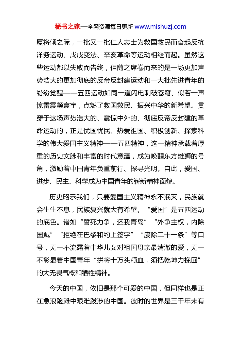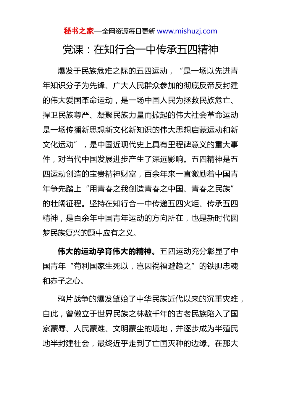 秘书之家—全网资源每日更新 www.mishuzj.com党课:在知行合一中传承五四精神爆发于民族危难之际的五四运动,“是一场以先进青年知识分子为先锋、广大人民群众参加的彻底反帝反封建的伟大爱国革命运动,是一场中国人民为拯救民族危亡、捍卫民族尊严、凝聚民族力量而掀起的伟大社会革命运动是一场传播新思想新文化新知识的伟大思想启蒙运动和新文化运动”,是中国近现代史上具有里程碑意义的重大事件,对当代中国发展进步产生了深远影响。五四精神是五四运动创造的宝贵精神财富,百余年来一直激励着中国青年争先踏上“用青春之我创造青春之中国、青春之民族”的壮阔征程。坚持在知行合一中传递五四火炬、传承五四精神,是百余年中国青年运动的方向所在,也是新时代圆梦民族复兴的题中应有之义。伟大的运动孕育伟大的精神。五四运动充分彰显了中国青年“苟利国家生死以,岂因祸福避趋之”的铁胆忠魂和赤子之心。鸦片战争的爆发肇始了中华民族近代以来的沉重灾难,自此,曾傲立于世界民族之林数千年的古老民族陷入了国家蒙辱、人民蒙难、文明蒙尘的境地,并逐步成为半殖民地半封建社会,最终近乎走到了亡国灭种的边缘。在那大秘书之家—全网资源每日更新 www.mishuzj.com厦将倾之际,一批又一批仁人志士为救国救民而奋起反抗洋务运动、戊戌变法、辛亥革命等运动相继而起。虽然这些运动都以失败而告终,但随之席卷而来的是一场更加声势浩大的更加彻底的反帝反封建运动和一大批先进青年的纷纷觉醒——五四运动如同一道闪电刺破苍穹、似若一声惊雷震颤寰宇,点燃了救国救民、振兴中华的新希望。贯穿于这场声势浩大的、震惊中外的、彻底反帝反封建的革命运动的,正是忧国忧民、热爱祖国、积极创新、探索科学的伟大爱国主义精神——五四精神,这一精神承载着厚重的历史文脉和丰富的时代意蕴,成为唤醒东方雄狮的号角,激励着中国青年负重前行、探寻光明。自此,爱国、进步、民主、科学成为中国青年的崭新精神面貌。历史昭示我们,只要爱国主义精神永不泯灭,民族就会生生不息,民族复兴就大有希望。“爱国”是五四运动的底色。诸如“誓死力争,还我青岛”“外争主权,内除国贼”“拒绝在巴黎和约上签字”“废除二十一条”等口号,无一不流露着中华儿女对祖国母亲最清澈的爱,无一不彰显着中国青年“拼将十万头颅血,须把乾坤力挽回”的大无畏气概和牺牲精神。今天的中国,依旧是那个可爱的中国,但同样也是正在急浪险滩中艰难跋涉的中国。彼时的世界是三千年未有秘书之家—全网资源每日更新 www.mishuzj.com之大变局,时下的世界正处于百年未有之大变局;彼时的中华民族尚在构筑中国梦的基本情境,时下的中华民族仍在思谋伟大复兴的战略全局。尽管在中国共产党的领导下中国人民历经百余年奋斗,已使中华民族迎来了从站起来富起来到强起来的伟大飞跃,但要想长期保持“风景这边独好”局面,国家所面临的挑战之巨、阻碍之大、困难之多,依旧需要务必大力弘扬以爱国主义为核心的五四精神充分激励和调动中华儿女尤其是广大青少年紧密团结在中国共产党的周围,自觉将个人命运与国家和民族的命运高度统一起来,将爱国和爱党、爱社会主义高度统一起来,在坚定“四个自信”、增强“四个意识”、做到“两个维护”、拥护“两个确立”的过程中,坚决抵制各种敌对势力的一切“西化”“分化”“渗透”行径和“民族虚无主义”“历史虚无主义”等不良思潮,积极投身全面建设社会主义现代化国家和实现祖国完全统一的伟大事业,像五四先驱们一样矢志不渝为中华民族伟大复兴而团结奋斗。伟大的精神引领伟大的事业。五四精神激发了中国青年“为有牺牲多壮志,敢教日月换新天”的壮志豪情和进取精神。与**岁的马克思在青春誓言中所畅想的一样:“如果我们选择了最能为人类福利而劳动的职业,那么,重担就秘书之家—全网资源每日更新 www.mishuzj.com不能把我们压倒,因为这是为大家而献身。那时我们所感到的就不是可怜的、有限的、自私的乐趣,我们的幸福将属于千百万人,我们的事业将默默地、但是永恒发挥作用地存在下去,而面对我们的骨灰,高尚的人们将洒下热泪”,五四运动中的先驱们在山河破碎、民族危...