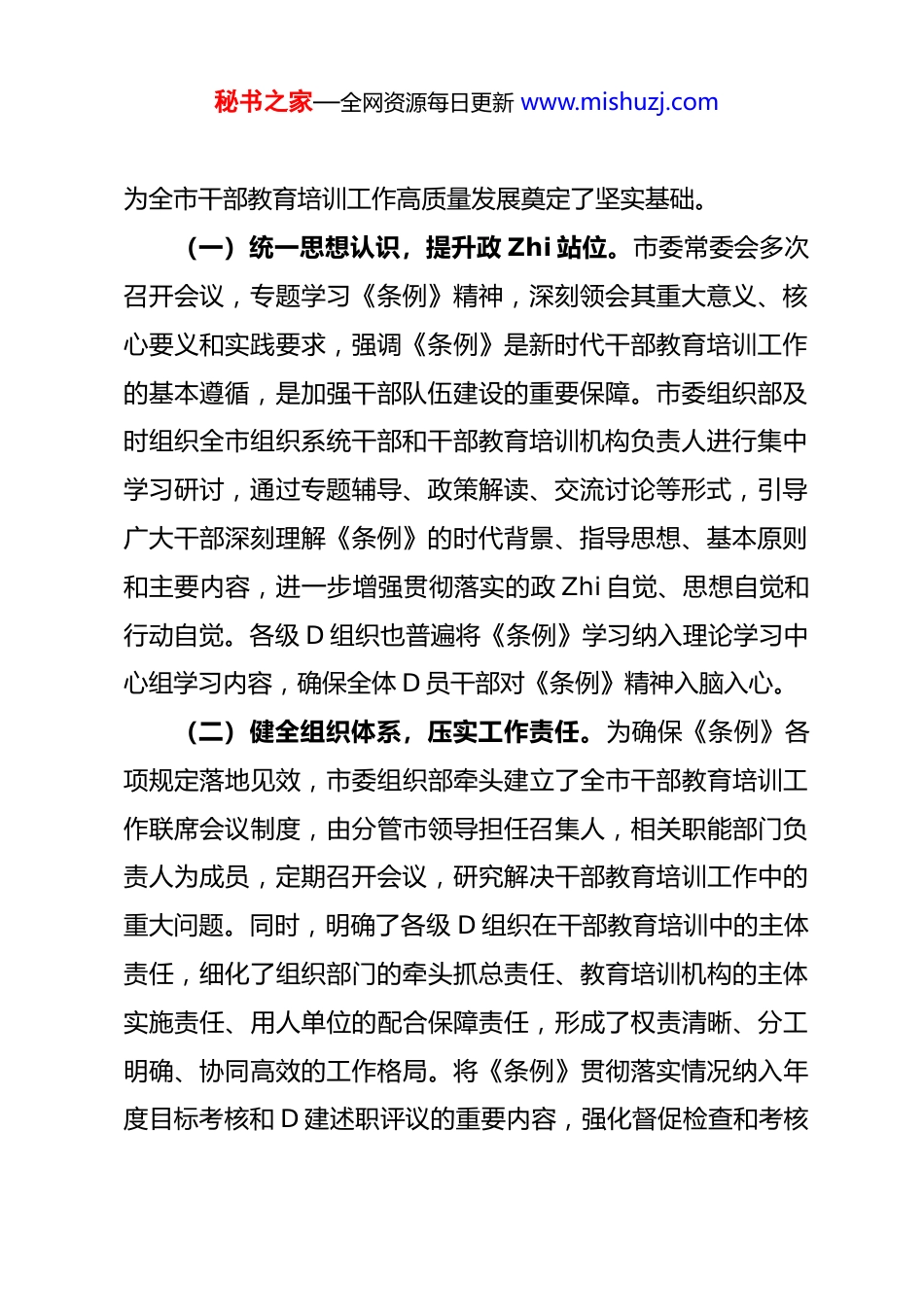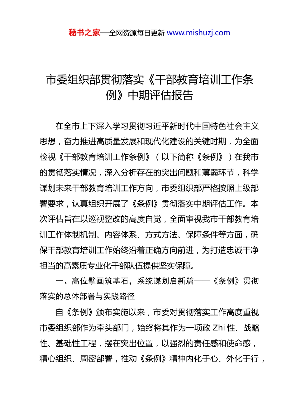秘书之家—全网资源每日更新 www.mishuzj.com市委组织部贯彻落实《干部教育培训工作条例》中期评估报告在全市上下深入学习贯彻习近平新时代中国特色社会主义思想,奋力推进高质量发展和现代化建设的关键时期,为全面检视《干部教育培训工作条例》(以下简称《条例》)在我市的贯彻落实情况,深入分析存在的突出问题和薄弱环节,科学谋划未来干部教育培训工作方向,市委组织部严格按照上级部署要求,认真组织开展了《条例》贯彻落实中期评估工作。本次评估旨在以巡视整改的高度自觉,全面审视我市干部教育培训工作体制机制、内容体系、方式方法、保障条件等方面,确保干部教育培训工作始终沿着正确方向前进,为打造忠诚干净担当的高素质专业化干部队伍提供坚实保障。一、高位擘画筑基石,系统谋划启新篇——《条例》贯彻落实的总体部署与实践路径自《条例》颁布实施以来,市委对贯彻落实工作高度重视市委组织部作为牵头部门,始终将其作为一项政 Zhi 性、战略性、基础性工程,摆在突出位置,以强烈的责任感和使命感,精心组织、周密部署,推动《条例》精神内化于心、外化于行,秘书之家—全网资源每日更新 www.mishuzj.com为全市干部教育培训工作高质量发展奠定了坚实基础。(一)统一思想认识,提升政 Zhi 站位。市委常委会多次召开会议,专题学习《条例》精神,深刻领会其重大意义、核心要义和实践要求,强调《条例》是新时代干部教育培训工作的基本遵循,是加强干部队伍建设的重要保障。市委组织部及时组织全市组织系统干部和干部教育培训机构负责人进行集中学习研讨,通过专题辅导、政策解读、交流讨论等形式,引导广大干部深刻理解《条例》的时代背景、指导思想、基本原则和主要内容,进一步增强贯彻落实的政 Zhi 自觉、思想自觉和行动自觉。各级 D 组织也普遍将《条例》学习纳入理论学习中心组学习内容,确保全体 D 员干部对《条例》精神入脑入心。(二)健全组织体系,压实工作责任。为确保《条例》各项规定落地见效,市委组织部牵头建立了全市干部教育培训工作联席会议制度,由分管市领导担任召集人,相关职能部门负责人为成员,定期召开会议,研究解决干部教育培训工作中的重大问题。同时,明确了各级 D 组织在干部教育培训中的主体责任,细化了组织部门的牵头抓总责任、教育培训机构的主体实施责任、用人单位的配合保障责任,形成了权责清晰、分工明确、协同高效的工作格局。将《条例》贯彻落实情况纳入年度目标考核和 D 建述职评议的重要内容,强化督促检查和考核秘书之家—全网资源每日更新 www.mishuzj.com评估,推动工作责任层层压实、环环相扣。(三)完善制度机制,优化顶层设计。在《条例》的指引下,市委组织部结合我市实际,先后修订完善了一系列配套制度和实施细则,构建了科学规范的干部教育培训制度体系。一是制定了《关于贯彻落实《干部教育培训工作条例》的实施意见》,明确了培训目标、培训内容、培训方式、培训管理和保障措施等具体要求。二是修订了《全市干部教育培训年度计划编制办法》,更加注重培训需求的精准调研和计划的科学性、前瞻性。三是健全了《干部教育培训经费管理办法》,确保培训经费足额投入、规范使用。四是出台了《干部教育培训师资库建设管理办法》,加强师资队伍建设。五是完善了《干部教育培训学分制管理规定》,强化培训的刚性约束和激励作用。通过制度的不断完善,为干部教育培训工作的规范化、常态化运行提供了坚实保障。(四)聚焦主责主业,突出政 Zhi 引领。在贯彻落实《条例》过程中,我们始终坚持把习近平新时代中国特色社会主义思想作为干部教育培训的首要任务和核心内容,突出政 Zhi 训练和 D 性教育。一是将 D 的创新理论教育作为各类培训班次的“第一课”,引导干部深刻领会其精髓要义。二是把 D 章 D 规D 纪教育贯穿培训全过程,教育引导干部增强纪律意识和规矩秘书之家—全网资源每日更新 www.mishuzj.com意识。三是深入开展革命传统教育、理想信念教育、对 D 忠诚教育,引导干部传承红色基因,坚定理想信念。四是结合我市发展实际,将 D 的最新理论成果与地方实践紧密结合,增强...