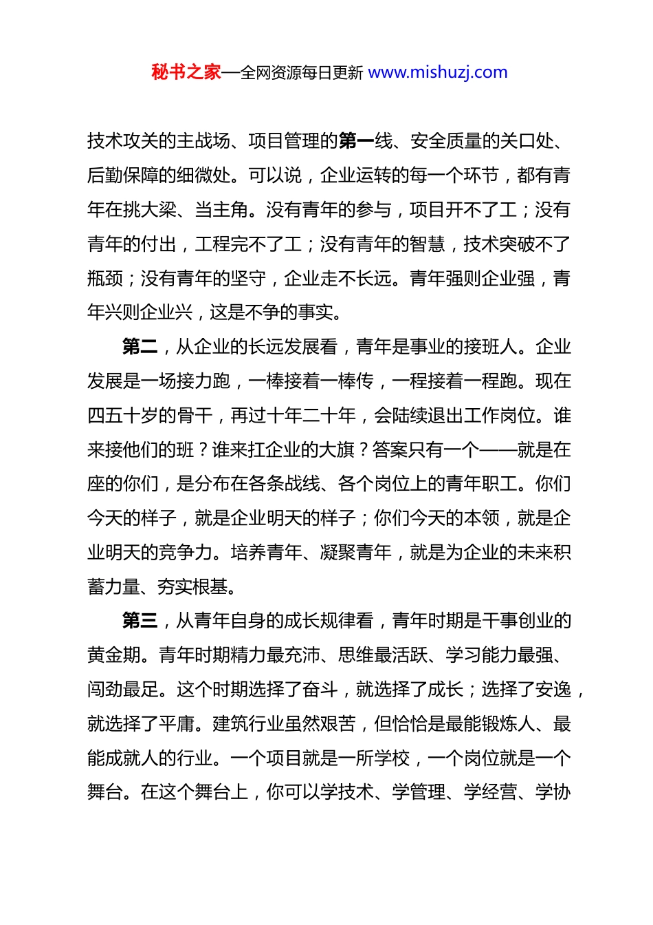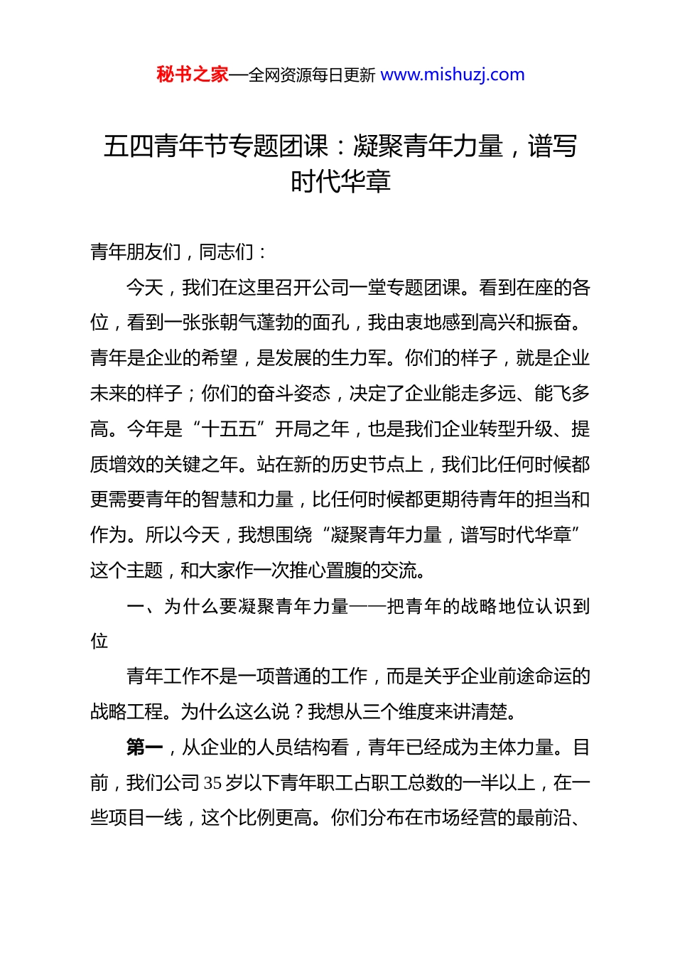 秘书之家—全网资源每日更新 www.mishuzj.com五四青年节专题团课:凝聚青年力量,谱写时代华章 青年朋友们,同志们:今天,我们在这里召开公司一堂专题团课。看到在座的各位,看到一张张朝气蓬勃的面孔,我由衷地感到高兴和振奋。青年是企业的希望,是发展的生力军。你们的样子,就是企业未来的样子;你们的奋斗姿态,决定了企业能走多远、能飞多高。今年是“十五五”开局之年,也是我们企业转型升级、提质增效的关键之年。站在新的历史节点上,我们比任何时候都更需要青年的智慧和力量,比任何时候都更期待青年的担当和作为。所以今天,我想围绕“凝聚青年力量,谱写时代华章”这个主题,和大家作一次推心置腹的交流。一、为什么要凝聚青年力量——把青年的战略地位认识到位青年工作不是一项普通的工作,而是关乎企业前途命运的战略工程。为什么这么说?我想从三个维度来讲清楚。第一,从企业的人员结构看,青年已经成为主体力量。目前,我们公司 35 岁以下青年职工占职工总数的一半以上,在一些项目一线,这个比例更高。你们分布在市场经营的最前沿、秘书之家—全网资源每日更新 www.mishuzj.com技术攻关的主战场、项目管理的第一线、安全质量的关口处、后勤保障的细微处。可以说,企业运转的每一个环节,都有青年在挑大梁、当主角。没有青年的参与,项目开不了工;没有青年的付出,工程完不了工;没有青年的智慧,技术突破不了瓶颈;没有青年的坚守,企业走不长远。青年强则企业强,青年兴则企业兴,这是不争的事实。第二,从企业的长远发展看,青年是事业的接班人。企业发展是一场接力跑,一棒接着一棒传,一程接着一程跑。现在四五十岁的骨干,再过十年二十年,会陆续退出工作岗位。谁来接他们的班?谁来扛企业的大旗?答案只有一个——就是在座的你们,是分布在各条战线、各个岗位上的青年职工。你们今天的样子,就是企业明天的样子;你们今天的本领,就是企业明天的竞争力。培养青年、凝聚青年,就是为企业的未来积蓄力量、夯实根基。第三,从青年自身的成长规律看,青年时期是干事创业的黄金期。青年时期精力最充沛、思维最活跃、学习能力最强、闯劲最足。这个时期选择了奋斗,就选择了成长;选择了安逸,就选择了平庸。建筑行业虽然艰苦,但恰恰是最能锻炼人、最能成就人的行业。一个项目就是一所学校,一个岗位就是一个舞台。在这个舞台上,你可以学技术、学管理、学经营、学协秘书之家—全网资源每日更新 www.mishuzj.com调,综合素质能得到全面提升。那些成长快的干部,无一不是在青年时期打下了坚实基础。青年工作不是团委一家的事,不是可有可无的“边缘工作”,而是关乎企业生存发展的“核心工程”。各级组织要把青年工作摆在更加突出的位置,用心用情用力做好青年工作,让每一名青年都能在企业找到自己的位置、实现自己的价值。二、新时代建筑青年应该有什么样的追求——把奋斗的方向标立起来方向对了,努力才有意义;方向错了,走得越快偏得越远作为新时代的建筑青年,我们应该有什么样的追求?我想,至少要有四个方面的追求。第一,要有扎根一线的定力。本行业的主战场在工地、在项目、在市场一线。不到一线去,就学不到真本事;不在基层摸爬滚打,就成不了真正的行家里手。有些年轻同志刚来的时候满腔热情,干了几个月就觉得工地太苦、太枯燥,开始想着往机关调、往城里跑。这种心态要不得。我理解大家想追求更好工作环境的愿望,但我想说的是,最锻炼人的地方恰恰是最艰苦的地方。那些在偏远项目上一待就是几年的同志,那些在急难险重任务中冲在前面的同志,成长速度往往是最快的。青年时期多吃一点苦,将来就多一分底气、多一分从容。希望大秘书之家—全网资源每日更新 www.mishuzj.com家沉下心来,把根扎在项目上,把心用在工地上,在基层一线磨砺意志、增长才干。第二,要有精益求精的追求。行业是实打实的行当,来不得半点虚假。钢筋绑扎得横平竖直,混凝土浇筑得内实外美,测量放样得精准无误,资料整理得规范有序——这些看似基础的工作,恰恰体现一个人的专业素养。同样是干活,有的人满足于“差不多就行”,有的人追求“做到极致”。差别就在有...