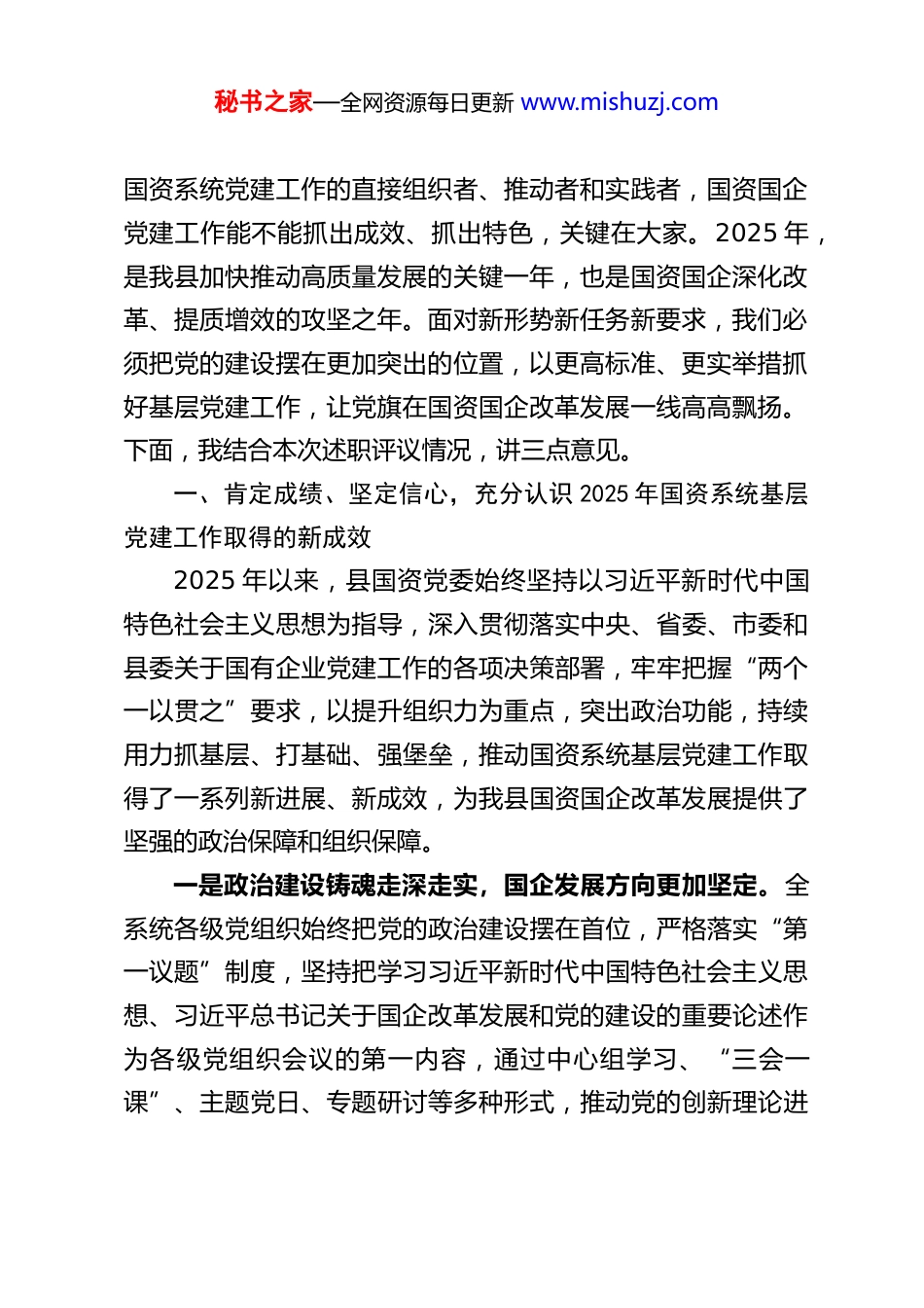 秘书之家—全网资源每日更新 www.mishuzj.comXX 县国资党委书记在县国资党委 2025 年度党组织书记抓基层党建述职评议会上的讲话同志们:今天,我们齐聚一堂,召开县国资党委 2025 年度党组织书记抓基层党建述职评议会。这次会议的主要任务是,深入学习贯彻习近平新时代中国特色社会主义思想和党的二十大及二十届历次全会精神,全面落实新时代党的建设总要求和新时代党的组织路线,通过现场述职、逐一点评、民主评议的方式,总结过去一年我县国资系统基层党建工作成效,查摆问题不足,交流经验做法,进一步压实党建工作责任,推动国资国企基层党建工作提质增效,以高质量党建引领保障我县国资国企高质量发展。刚才,国投集团党总支、城投集团党总支等 6 位党(总)支部书记作了现场述职,其他党组织书记提交了书面述职报告。大家的述职报告都能紧扣抓基层党建工作主线,既客观总结了成绩,也敢于直面问题,提出的整改措施也比较务实。我也结合平时掌握的情况和各企业实际,对现场述职的同志逐一点评了,点出了亮点,也指出了短板。会后,各位书记要对照点评意见和自身查摆的问题,认真制定整改清单,明确整改时限和整改措施,切实把问题改到位、改彻底。参加今天会议的有县国资党委委员、县属国有企业党(总)支部书记、专职副书记、非公支部书记,大家都是我县秘书之家—全网资源每日更新 www.mishuzj.com国资系统党建工作的直接组织者、推动者和实践者,国资国企党建工作能不能抓出成效、抓出特色,关键在大家。2025 年,是我县加快推动高质量发展的关键一年,也是国资国企深化改革、提质增效的攻坚之年。面对新形势新任务新要求,我们必须把党的建设摆在更加突出的位置,以更高标准、更实举措抓好基层党建工作,让党旗在国资国企改革发展一线高高飘扬。下面,我结合本次述职评议情况,讲三点意见。一、肯定成绩、坚定信心,充分认识 2025 年国资系统基层党建工作取得的新成效2025 年以来,县国资党委始终坚持以习近平新时代中国特色社会主义思想为指导,深入贯彻落实中央、省委、市委和县委关于国有企业党建工作的各项决策部署,牢牢把握“两个一以贯之”要求,以提升组织力为重点,突出政治功能,持续用力抓基层、打基础、强堡垒,推动国资系统基层党建工作取得了一系列新进展、新成效,为我县国资国企改革发展提供了坚强的政治保障和组织保障。一是政治建设铸魂走深走实,国企发展方向更加坚定。全系统各级党组织始终把党的政治建设摆在首位,严格落实“第一议题”制度,坚持把学习习近平新时代中国特色社会主义思想、习近平总书记关于国企改革发展和党的建设的重要论述作为各级党组织会议的第一内容,通过中心组学习、“三会一课”、主题党日、专题研讨等多种形式,推动党的创新理论进秘书之家—全网资源每日更新 www.mishuzj.com基层、进岗位、进职工心间。国投集团、城投集团等企业党组织结合自身业务特点,开展专题学习研讨活动,把学习成果转化为谋划工作的思路、推动工作的举措。同时,我们严格规范党组织前置研究程序,全面推行党组织书记、董事长“一肩挑”和领导班子交叉任职,进一步明确了党组织在公司治理中的法定地位,把党的领导全面融入公司治理各环节、全过程,确保国资国企发展始终沿着正确政治方向前进。二是基层堡垒建设提质增效,组织基础更加坚实。我们紧扣国有企业业务布局,坚持“应建尽建、设置规范、运行有效”原则,动态优化党支部、党小组设置,把党组织的触角延伸至生产一线、项目现场、关键岗位,实现了组织覆盖和工作覆盖“双覆盖”。矿投集团党总支针对矿山生产、项目建设等一线特点,在重点项目部设立党小组,让党员在项目攻坚中当先锋、作表率;文旅公司党支部结合文旅产业服务群众的特点,在景区服务窗口设立党员先锋岗,提升服务质量。全系统各级党组织严格落实“三会一课”、组织生活会、民主评议党员、主题党日等基本制度,不断创新组织生活形式和内容,摒弃形式主义,注重实际效果,让组织生活真正成为锤炼党员党性的“大熔炉”。同时,我们持续推进基层党组织标准化规范化建设,以标准化促规范化,以规范化提战斗力,基层...