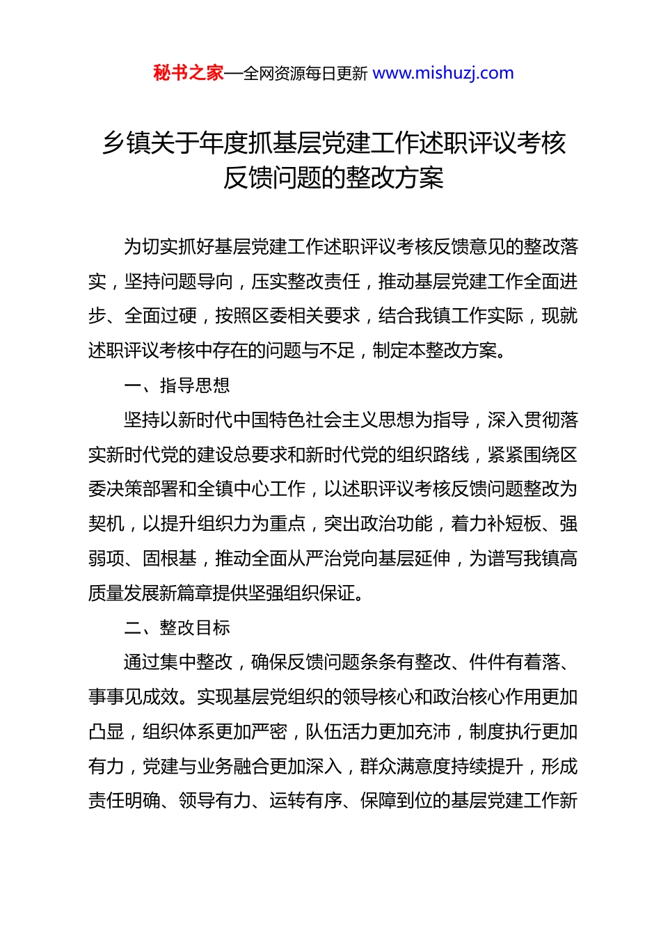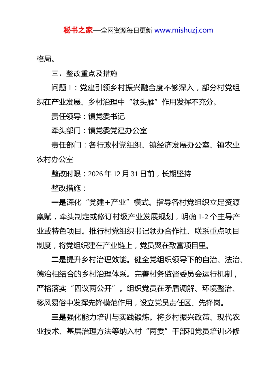秘书之家—全网资源每日更新 www.mishuzj.com乡镇关于年度抓基层党建工作述职评议考核反馈问题的整改方案 为切实抓好基层党建工作述职评议考核反馈意见的整改落实,坚持问题导向,压实整改责任,推动基层党建工作全面进步、全面过硬,按照区委相关要求,结合我镇工作实际,现就述职评议考核中存在的问题与不足,制定本整改方案。一、指导思想坚持以新时代中国特色社会主义思想为指导,深入贯彻落实新时代党的建设总要求和新时代党的组织路线,紧紧围绕区委决策部署和全镇中心工作,以述职评议考核反馈问题整改为契机,以提升组织力为重点,突出政治功能,着力补短板、强弱项、固根基,推动全面从严治党向基层延伸,为谱写我镇高质量发展新篇章提供坚强组织保证。二、整改目标通过集中整改,确保反馈问题条条有整改、件件有着落、事事见成效。实现基层党组织的领导核心和政治核心作用更加凸显,组织体系更加严密,队伍活力更加充沛,制度执行更加有力,党建与业务融合更加深入,群众满意度持续提升,形成责任明确、领导有力、运转有序、保障到位的基层党建工作新秘书之家—全网资源每日更新 www.mishuzj.com格局。三、整改重点及措施问题 1:党建引领乡村振兴融合度不够深入,部分村党组织在产业发展、乡村治理中“领头雁”作用发挥不充分。责任领导:镇党委书记牵头部门:镇党委党建办公室责任部门:各行政村党组织、镇经济发展办公室、镇农业农村办公室整改时限:2026 年 12 月 31 日前,长期坚持整改措施:一是深化“党建+产业”模式。指导各村党组织立足资源禀赋,牵头制定或修订村级产业发展规划,明确 1-2 个主导产业或特色项目。推行村党组织书记领办合作社、联系重点项目制度,将党组织建在产业链上,党员聚在致富项目里。二是提升乡村治理效能。健全党组织领导下的自治、法治、德治相结合的乡村治理体系。完善村务监督委员会运行机制,严格落实“四议两公开”。组织党员在矛盾调解、环境整治、移风易俗中发挥先锋模范作用,设立党员责任区、先锋岗。三是强化能力培训与实践锻炼。将乡村振兴政策、现代农业技术、基层治理方法等纳入村“两委”干部和党员培训必修秘书之家—全网资源每日更新 www.mishuzj.com课。组织村党组织书记到先进地区观摩学习,开展“擂台比武”,在实践一线提升带领群众致富、善治乡村的能力。问题 2:党员教育管理针对性、实效性有待加强,流动党员管理存在薄弱环节,部分党员先锋模范作用不突出。责任领导:镇党委副书记、组织委员牵头部门:镇党委党建办公室责任部门:各基层党组织整改时限:2026 年 12 月 31 日前,长期坚持整改措施:一是实施分类精准教育。针对农村党员、机关党员、离退休党员、流动党员等不同群体特点,分类制定学习计划和教育重点。丰富教育形式,运用“田间课堂”、线上微党课、案例教学等多种方式,增强吸引力和感染力。二是健全流动党员动态管理机制。全面摸排更新流动党员信息库,建立“一对一”联系制度,确保联系不断线。利用学习强国、微信群等平台,定期推送学习资料,引导流动党员线上参加组织生活。探索在流动党员集中地建立临时党支部或联络站。三是搭建党员作用发挥平台。全面推行党员设岗定责、承诺践诺、积分管理制度。围绕中心工作和群众需求,设立政策秘书之家—全网资源每日更新 www.mishuzj.com宣传、技术帮扶、平安巡逻、志愿服务等岗位,引导党员亮身份、作表率,将考核评价结果作为评先评优的重要依据。问题 3:基层党建工作压力传导存在递减现象,部分党支部落实“三会一课”、组织生活会等制度不够规范、质量不高。责任领导:镇党委副书记牵头部门:镇党委党建办公室责任部门:各基层党组织整改时限:2026 年 12 月 31 日前,长期坚持整改措施:一是压实支部主体责任。明确各党支部书记为落实基本制度第一责任人,签订党建工作责任书。将制度落实情况作为支部书记述职评议考核的核心内容,加大权重。二是规范组织生活流程与内容。制定下发《镇基层党组织“三会一课”、组织生活会、民主评议党员操作指南》,明确时间、程序、记录等标准。建立“主题清单”制度,每月由镇党...