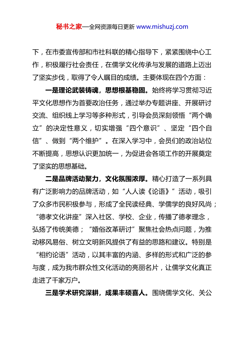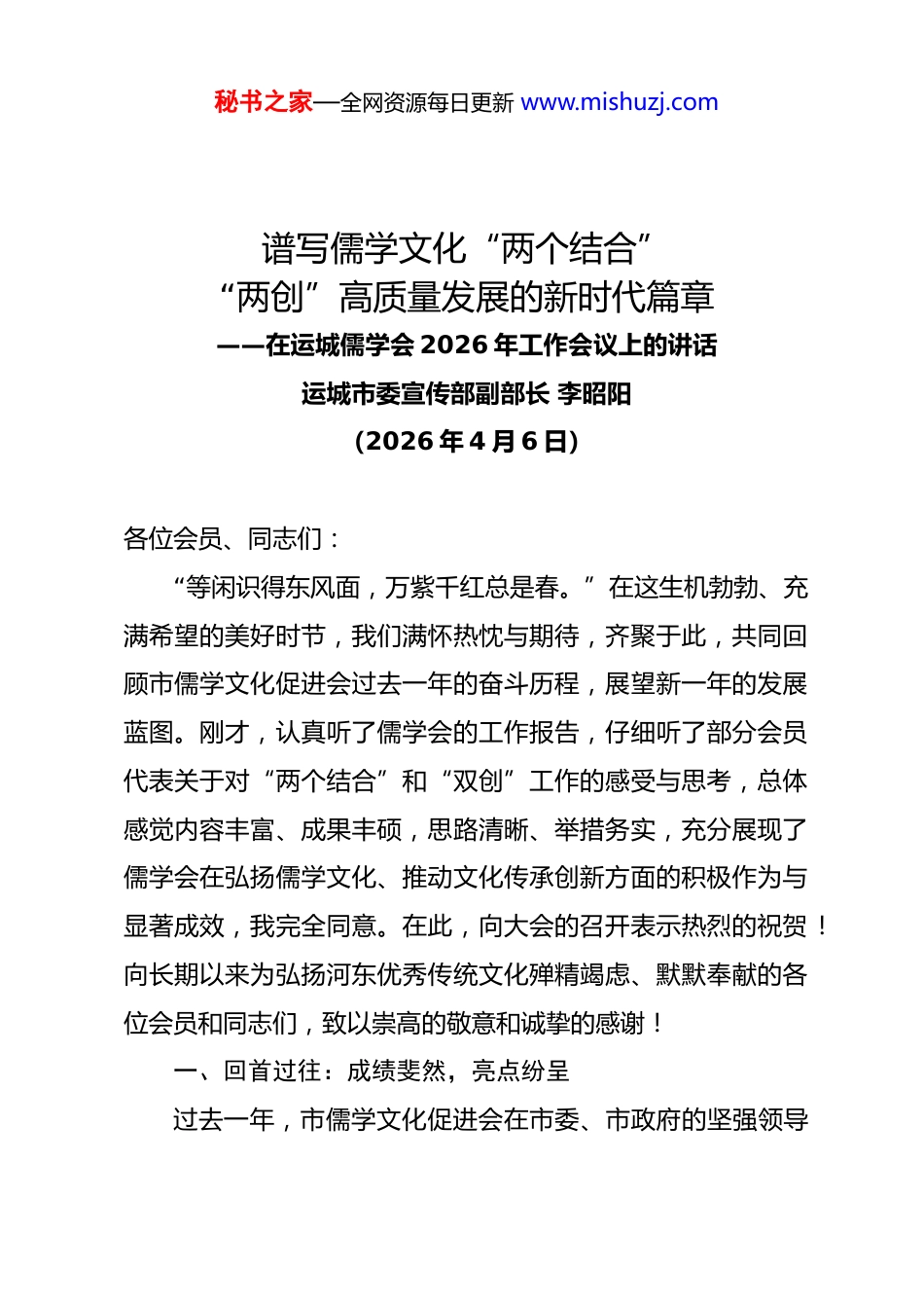 秘书之家—全网资源每日更新 www.mishuzj.com谱写儒学文化“两个结合”“两创”高质量发展的新时代篇章——在运城儒学会 2026 年工作会议上的讲话运城市委宣传部副部长 李昭阳(2026 年 4 月 6 日)各位会员、同志们:“等闲识得东风面,万紫千红总是春。”在这生机勃勃、充满希望的美好时节,我们满怀热忱与期待,齐聚于此,共同回顾市儒学文化促进会过去一年的奋斗历程,展望新一年的发展蓝图。刚才,认真听了儒学会的工作报告,仔细听了部分会员代表关于对“两个结合”和“双创”工作的感受与思考,总体感觉内容丰富、成果丰硕,思路清晰、举措务实,充分展现了儒学会在弘扬儒学文化、推动文化传承创新方面的积极作为与显著成效,我完全同意。在此,向大会的召开表示热烈的祝贺!向长期以来为弘扬河东优秀传统文化殚精竭虑、默默奉献的各位会员和同志们,致以崇高的敬意和诚挚的感谢!一、回首过往:成绩斐然,亮点纷呈过去一年,市儒学文化促进会在市委、市政府的坚强领导秘书之家—全网资源每日更新 www.mishuzj.com下,在市委宣传部和市社科联的精心指导下,紧紧围绕中心工作,积极履行社会责任,在儒学文化传承与发展的道路上迈出了坚实步伐,取得了令人瞩目的成绩。主要体现在四个方面:一是理论武装铸魂,思想根基稳固。始终将学习贯彻习近平文化思想作为首要政治任务,通过举办专题讲座、开展研讨交流、组织线上学习等多种形式,引导会员深刻领悟“两个确立”的决定性意义,切实增强“四个意识”、坚定“四个自信”、做到“两个维护”。在深入学习中,会员们的政治站位不断提高,思想认识更加统一,为促进会各项工作的开展奠定了坚实的思想基础。二是品牌活动聚力,文化氛围浓厚。精心打造了一系列具有广泛影响力的品牌活动,如“人人读《论语》”活动,吸引了众多市民积极参与,形成了全民读经典、学儒学的良好风尚;“德孝文化讲座”深入社区、学校、企业,传播了德孝理念,弘扬了传统美德;“婚俗改革研讨”聚焦社会热点问题,为推动移风易俗、树立文明新风提供了有益的思路和建议。特别是“相约论语”活动,以其丰富的内涵、多样的形式和广泛的参与度,成为我市群众性文化活动的亮丽名片,让儒学文化真正走进了千家万户。三是学术研究深耕,成果丰硕喜人。围绕儒学文化、关公秘书之家—全网资源每日更新 www.mishuzj.com文化、德孝文化等河东文脉核心,组织专家学者开展深入研究,形成了一批有分量、有价值的研究成果。这些成果不仅在学术领域得到了广泛认可,登上了“学习强国”等平台,并获得了社科联的表彰,为运城文化的传承与发展提供了有力的理论支持。同时,通过学术研究成果的转化应用,进一步提升了运城文化的知名度和影响力。四是自身建设强化,组织活力彰显。注重加强自身建设,不断完善组织架构,初步形成了“四梁八柱”的组织体系。书院建设多点开花,为会员提供了良好的学习和交流平台;微信公众号等宣传阵地有效运转,及时发布活动信息、传播儒学知识,扩大了促进会的社会影响力。通过加强队伍建设,会员们的凝聚力、向心力和战斗力显著增强,为促进会的长远发展提供了坚实的组织保障。二、立足当下:把握机遇,勇担使命2026 年是“十五五”规划开局之年,是我们深入学习贯彻党的二十届四中全会精神、全面建设社会主义现代化国家的关键节点,也是奋力推进“一城两区三门户”的关键之年。当前,全国、全省及我市宣传部长会议相继召开,对深化“两个结合”、特别是“第二个结合”,推动中华优秀传统文化创造性转化、创新性发展提出了新的更高要求。站在新的历史起点秘书之家—全网资源每日更新 www.mishuzj.com上,儒学文化促进会肩负着重大责任和光荣使命,面临着广阔的发展空间和难得的发展机遇。(一)时代召唤,责任在肩。大家知道,中国是世界上唯一未曾中断的文明古国,而中华民族则是这一伟大文明的创造者、继承者和守护者。中华文明五千年不断,其精神精华之一就凝聚在《春秋》等典籍之中。读《论语》以明是非、学做人、明义利、辨君子小人。我们读《春秋》,可以知礼仪,明大义、知秩序、守礼节。这就是我们与先贤对话、延续文脉...