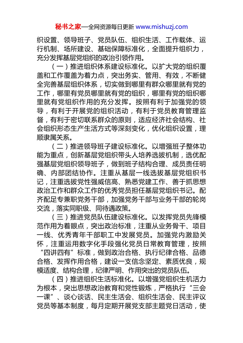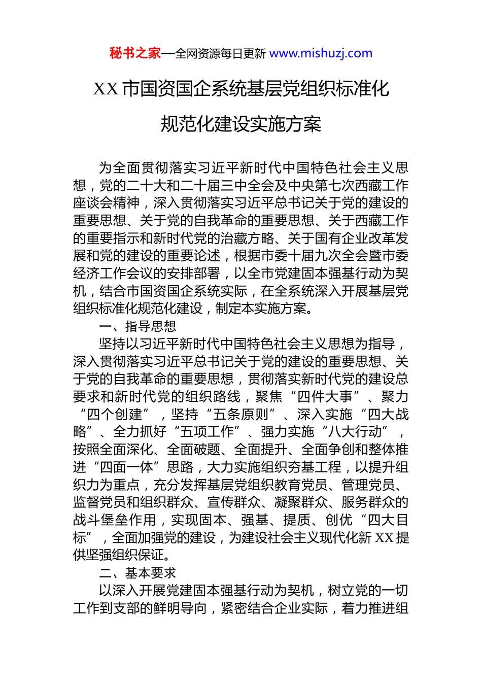 秘书之家—全网资源每日更新 www.mishuzj.comXX 市国资国企系统基层党组织标准化规范化建设实施方案为全面贯彻落实习近平新时代中国特色社会主义思想,党的二十大和二十届三中全会及中央第七次西藏工作座谈会精神,深入贯彻落实习近平总书记关于党的建设的重要思想、关于党的自我革命的重要思想、关于西藏工作的重要指示和新时代党的治藏方略、关于国有企业改革发展和党的建设的重要论述,根据市委十届九次全会暨市委经济工作会议的安排部署,以全市党建固本强基行动为契机,结合市国资国企系统实际,在全系统深入开展基层党组织标准化规范化建设,制定本实施方案。一、指导思想坚持以习近平新时代中国特色社会主义思想为指导,深入贯彻落实习近平总书记关于党的建设的重要思想、关于党的自我革命的重要思想,贯彻落实新时代党的建设总要求和新时代党的组织路线,聚焦“四件大事”、聚力“四个创建”,坚持“五条原则”、深入实施“四大战略”、全力抓好“五项工作”、强力实施“八大行动”,按照全面深化、全面破题、全面提升、全面争创和整体推进“四面一体”思路,大力实施组织夯基工程,以提升组织力为重点,充分发挥基层党组织教育党员、管理党员、监督党员和组织群众、宣传群众、凝聚群众、服务群众的战斗堡垒作用,实现固本、强基、提质、创优“四大目标”,全面加强党的建设,为建设社会主义现代化新 XX 提供坚强组织保证。二、基本要求以深入开展党建固本强基行动为契机,树立党的一切工作到支部的鲜明导向,紧密结合企业实际,着力推进组秘书之家—全网资源每日更新 www.mishuzj.com织设置、领导班子、党员队伍、组织生活、工作载体、运行机制、场所建设、基础保障标准化,全面提升组织力,充分发挥基层党组织的政治引领作用。(一)推进组织体系建设标准化。以扩大党的组织覆盖和工作覆盖为着力点,突出务实、管用、有效,不断健全完善基层组织体系,切实做到哪里有群众哪里就有党的工作,哪里有党员哪里就有党的组织,哪里有党的组织哪里就有党组织作用的充分发挥。按照有利于加强党的领导,有利于开展党的组织活动,有利于党员教育管理监督,有利于密切联系群众的原则,适应经济社会结构、社会组织形态生产生活方式等深刻变化,优化组织设置,理顺隶属关系。(二)推进领导班子建设标准化。以增强班子整体功能为重点,创新基层党组织带头人培养选拔机制,选优配强基层党组织领导班子,做到班子结构合理、成员责任明确、内部团结协作。注重从基层一线选拔基层党组织书记,注重选拔党性强威信高、熟悉党建工作、善于抓思想政治工作和群众工作的优秀党员担任基层党组织书记。配齐配足专兼职党务干部,加强党务干部与业务干部的轮岗交流,落实同职级、同待遇政策。(三)推进党员队伍建设标准化。以发挥党员先锋模范作用为着眼点,突出政治标准,注重从业务骨干、项目一线、优秀青年干部职工中发展党员。加强党内激励关怀,注重运用数字化手段强化党员日常教育管理,按照“四讲四有”标准,做到政治合格、执行纪律合格、品德合格、发挥作用合格,建设一支信念坚定、素质优良,规模适度、结构合理,纪律严明、作用突出的党员队伍。(四)推进组织生活标准化。以增强党组织生机活力为根本,突出思想政治教育和党性锻炼,严格执行“三会一课”、谈心谈话、民主生活会、组织生活会、民主评议党员等基本制度,每月定期开展党支部主题党日活动,使秘书之家—全网资源每日更新 www.mishuzj.com党内各项组织生活正常规范、严肃认真,党员参与率高、教育效果好,党员政治意识、大局意识、核心意识、看齐意识得到显著增强。(五)推进工作载体建设标准化。坚持突出政治功能,以党员群众满意为导向,紧紧围绕市委市政府中心工作、企业年度重点任务,探索创新基层党组织活动载体,深入开展“双培养”“示范岗”、岗位练兵、业务竞赛、党员承诺践诺、党员“双报到”志愿服务等活动,推动基层党组织和党员成为全市经济社会高质量发展的中流砥柱,做全面深化改革、维护社会稳定的排头兵,创新党的群众工作体制机制和方式方法,发挥党组织组织优势、组织力量、组织功能,凝聚工会、...