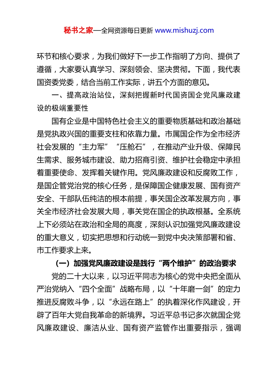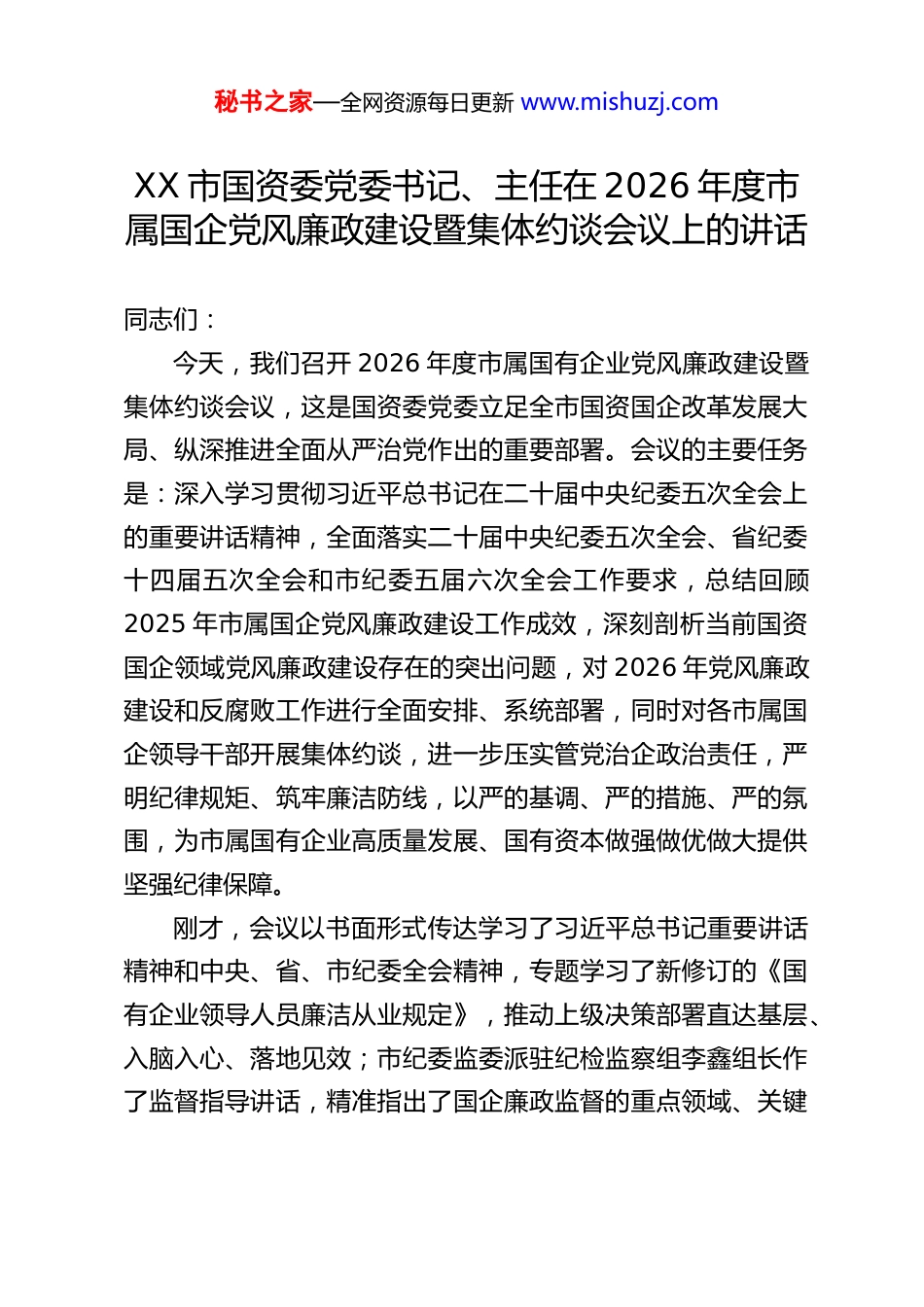 秘书之家—全网资源每日更新 www.mishuzj.comXX 市国资委党委书记、主任在 2026 年度市属国企党风廉政建设暨集体约谈会议上的讲话同志们:今天,我们召开 2026 年度市属国有企业党风廉政建设暨集体约谈会议,这是国资委党委立足全市国资国企改革发展大局、纵深推进全面从严治党作出的重要部署。会议的主要任务是:深入学习贯彻习近平总书记在二十届中央纪委五次全会上的重要讲话精神,全面落实二十届中央纪委五次全会、省纪委十四届五次全会和市纪委五届六次全会工作要求,总结回顾2025 年市属国企党风廉政建设工作成效,深刻剖析当前国资国企领域党风廉政建设存在的突出问题,对 2026 年党风廉政建设和反腐败工作进行全面安排、系统部署,同时对各市属国企领导干部开展集体约谈,进一步压实管党治企政治责任,严明纪律规矩、筑牢廉洁防线,以严的基调、严的措施、严的氛围,为市属国有企业高质量发展、国有资本做强做优做大提供坚强纪律保障。刚才,会议以书面形式传达学习了习近平总书记重要讲话精神和中央、省、市纪委全会精神,专题学习了新修订的《国有企业领导人员廉洁从业规定》,推动上级决策部署直达基层、入脑入心、落地见效;市纪委监委派驻纪检监察组李鑫组长作了监督指导讲话,精准指出了国企廉政监督的重点领域、关键秘书之家—全网资源每日更新 www.mishuzj.com环节和核心要求,为我们做好下一步工作指明了方向、提供了遵循,大家要认真学习、深刻领会、坚决贯彻。下面,我代表国资委党委,结合当前工作实际,讲五个方面的意见。一、提高政治站位,深刻把握新时代国资国企党风廉政建设的极端重要性国有企业是中国特色社会主义的重要物质基础和政治基础是党执政兴国的重要支柱和依靠力量。市属国企作为全市经济社会发展的“主力军”“压舱石”,在推动产业升级、保障民生需求、服务城市建设、助力招商引资、维护社会稳定中承担着重要使命、发挥着关键作用。党风廉政建设和反腐败工作,是国企管党治党的核心任务,是保障国企健康发展、国有资产安全、干部队伍纯洁的根本前提,事关国企改革发展方向,事关全市经济社会发展大局,事关党在国企的执政根基。全系统上下必须站在政治和全局的高度,深刻认识加强党风廉政建设的重大意义,切实把思想和行动统一到党中央决策部署和省、市工作要求上来。(一)加强党风廉政建设是践行“两个维护”的政治要求党的二十大以来,以习近平同志为核心的党中央把全面从严治党纳入“四个全面”战略布局,以“十年磨一剑”的定力推进反腐败斗争,以“永远在路上”的执着深化作风建设,开辟了百年大党自我革命的新境界。习近平总书记多次就国企党风廉政建设、廉洁从业、国有资产监管作出重要指示,强调秘书之家—全网资源每日更新 www.mishuzj.com“要加强国有企业党风廉政建设和反腐败工作,把纪律和规矩挺在前面”“要完善国有资产监管体制,防止国有资产流失”。国资国企系统是党领导下的政治机关、经济组织,必须把政治建设摆在首位,把党风廉政建设作为检验政治忠诚、践行“两个维护”的试金石,始终在思想上政治上行动上同以习近平同志为核心的党中央保持高度一致,确保国企发展始终沿着正确政治方向前进。(二)加强党风廉政建设是推动国企高质量发展的根本保障当前,我市正处在高质量发展的关键时期,市属国企承担着扩大有效投资、深化改革转型、提升核心竞争力的重要任务,肩负着服务全市招商引资、主动创稳、产业发展的重大使命。国企发展越迅速、规模越壮大、业务越多元,面临的廉政风险就越突出、越复杂。能源开发、工程招投标、物资采购、资产处置、投融资等领域,是廉政问题易发多发的“重灾区”,一旦出现监管漏洞、权力失控、行为失范,不仅会造成国有资产重大流失,更会扰乱市场秩序、阻碍改革进程、损害国企形象。只有以零容忍态度惩治腐败、以严紧硬措施防控风险、以常态化监督规范权力,才能为国企改革发展扫清障碍、保驾护航,让国有资本在健康轨道上做强做优做大。(三)加强党风廉政建设是维护群众切身利益的必然选择市属国企大多涉及供水、供电、交通、城建、公共服务等秘书之家—全网资源每日更新 w...
