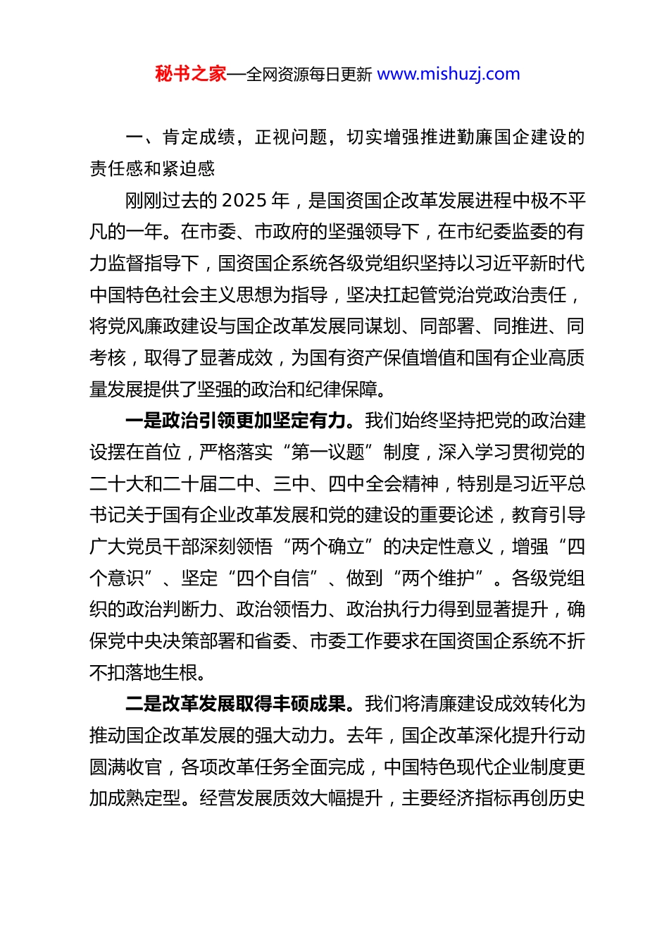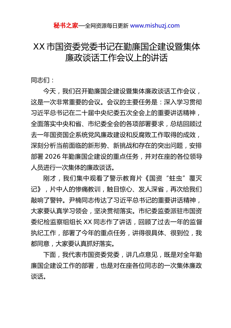 秘书之家—全网资源每日更新 www.mishuzj.comXX 市国资委党委书记在勤廉国企建设暨集体廉政谈话工作会议上的讲话同志们:今天,我们召开勤廉国企建设暨集体廉政谈话工作会议,这是一次非常重要的会议。会议的主要任务是:深入学习贯彻习近平总书记在二十届中央纪委五次全会上的重要讲话精神,全面落实中央和省、市纪委全会的各项部署要求,总结回顾过去一年国资国企系统党风廉政建设和反腐败工作取得的成效,深刻分析当前面临的新形势、新挑战和存在的突出问题,安排部署 2026 年勤廉国企建设的重点任务,并对在座的各位领导人员进行一次集体的廉政谈话。刚才,我们集中观看了警示教育片《国资“蛀虫”覆灭记》,片中人的惨痛教训,触目惊心、发人深省,再次给我们敲响了警钟。尹楠同志传达了习近平总书记的重要讲话精神,大家要认真学习领会,坚决贯彻落实。市纪委监委派驻市国资委纪检监察组组长 XX 同志作了讲话,回顾了过去一年的监督执纪工作,部署了今年的重点任务,讲得很具体、很到位,我都同意,大家要认真抓好落实。下面,我代表市国资委党委,讲几点意见,既是对全年勤廉国企建设工作的部署,也是对在座各位同志的一次集体廉政谈话。秘书之家—全网资源每日更新 www.mishuzj.com一、肯定成绩,正视问题,切实增强推进勤廉国企建设的责任感和紧迫感刚刚过去的 2025 年,是国资国企改革发展进程中极不平凡的一年。在市委、市政府的坚强领导下,在市纪委监委的有力监督指导下,国资国企系统各级党组织坚持以习近平新时代中国特色社会主义思想为指导,坚决扛起管党治党政治责任,将党风廉政建设与国企改革发展同谋划、同部署、同推进、同考核,取得了显著成效,为国有资产保值增值和国有企业高质量发展提供了坚强的政治和纪律保障。一是政治引领更加坚定有力。我们始终坚持把党的政治建设摆在首位,严格落实“第一议题”制度,深入学习贯彻党的二十大和二十届二中、三中、四中全会精神,特别是习近平总书记关于国有企业改革发展和党的建设的重要论述,教育引导广大党员干部深刻领悟“两个确立”的决定性意义,增强“四个意识”、坚定“四个自信”、做到“两个维护”。各级党组织的政治判断力、政治领悟力、政治执行力得到显著提升,确保党中央决策部署和省委、市委工作要求在国资国企系统不折不扣落地生根。二是改革发展取得丰硕成果。我们将清廉建设成效转化为推动国企改革发展的强大动力。去年,国企改革深化提升行动圆满收官,各项改革任务全面完成,中国特色现代企业制度更加成熟定型。经营发展质效大幅提升,主要经济指标再创历史秘书之家—全网资源每日更新 www.mishuzj.com新高,营业收入、利润总额、上缴税费均实现两位数增长,国有资本布局结构持续优化,在服务全市重大战略、保障和改善民生、构建现代化产业体系中发挥了“顶梁柱”“压舱石”的关键作用。我们以“勤”的作为创造了“优”的业绩。三是管党治党责任越压越实。各级党组织坚决扛起全面从严治党主体责任,党组织书记认真履行“第一责任人”职责,班子成员切实履行“一岗双责”,层层签订党风廉政建设责任书,形成了“横向到边、纵向到底”的责任体系。通过常态化开展约谈提醒、述责述廉、检查考核,推动责任压力向基层一线、向关键岗位持续传导,有效解决了责任落实“上热中温下冷”的问题。四是监督执纪问责持续强化。聚焦工程建设、物资采购、产权交易、投资并购等权力集中、资金密集、资源富集的重点领域和关键环节,深入开展专项整治和专项督查,一批风险隐患得到及时排查化解,一批违规违纪问题得到严肃查处。我们深化运用监督执纪“四种形态”,特别是第一种形态,抓早抓小、防微杜渐。制度笼子越扎越紧,权力运行更加规范透明,一体推进不敢腐、不能腐、不想腐的综合效应不断显现。五是干事创业氛围日益浓厚。我们坚持严管与厚爱结合、激励与约束并重,一方面对腐败问题零容忍,坚决清除“蛀虫”、惩治“蚁贪”,形成有力震慑;另一方面,健全完善容错纠错机制,为敢于担当、踏实做事的干部撑腰鼓劲,旗帜鲜秘书之家—全网资源每日更新 www.mishuzj.com明地为负责者负责、为担当者担...