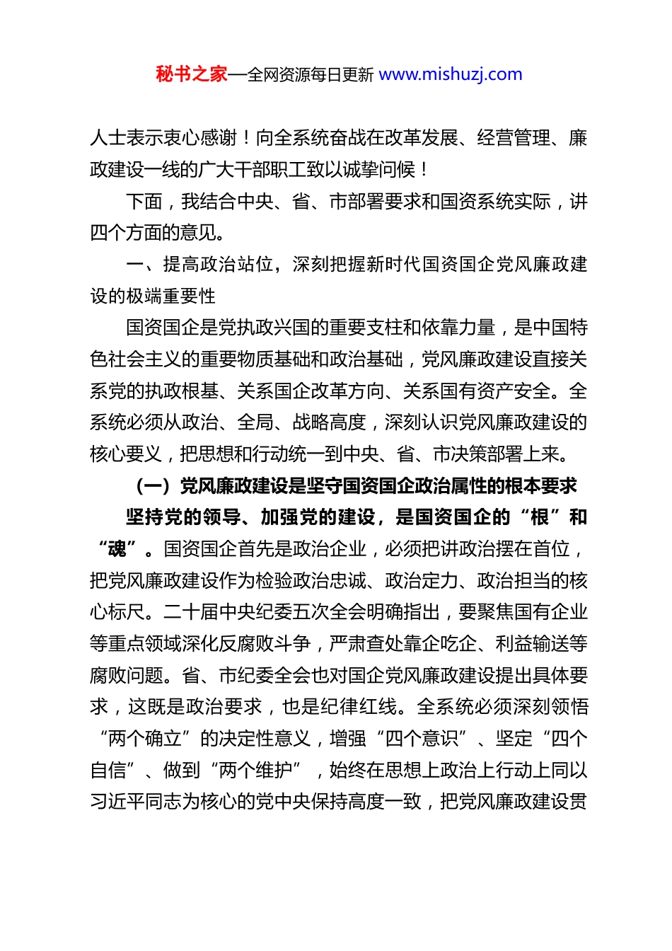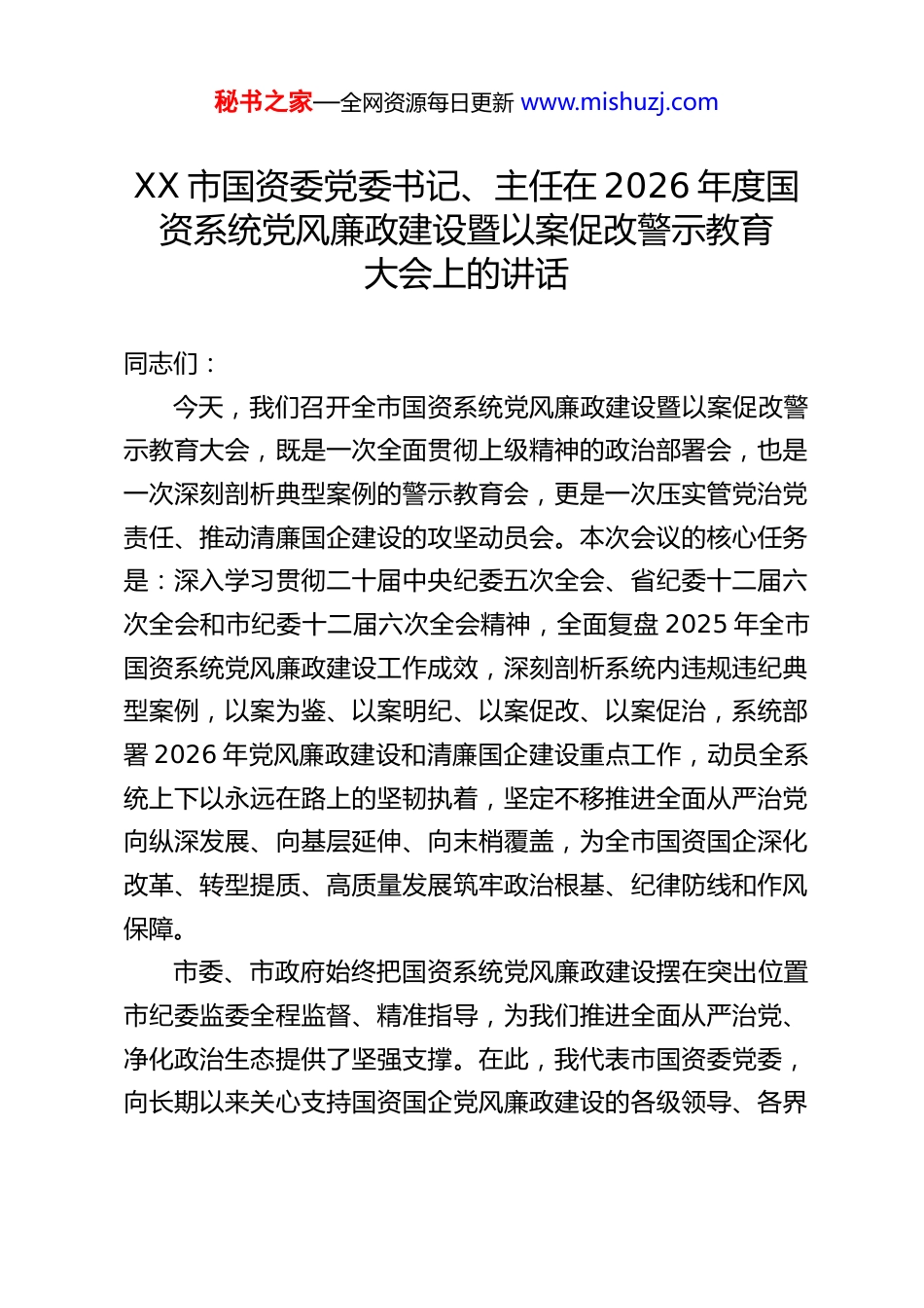 秘书之家—全网资源每日更新 www.mishuzj.comXX 市国资委党委书记、主任在 2026 年度国资系统党风廉政建设暨以案促改警示教育大会上的讲话同志们:今天,我们召开全市国资系统党风廉政建设暨以案促改警示教育大会,既是一次全面贯彻上级精神的政治部署会,也是一次深刻剖析典型案例的警示教育会,更是一次压实管党治党责任、推动清廉国企建设的攻坚动员会。本次会议的核心任务是:深入学习贯彻二十届中央纪委五次全会、省纪委十二届六次全会和市纪委十二届六次全会精神,全面复盘 2025 年全市国资系统党风廉政建设工作成效,深刻剖析系统内违规违纪典型案例,以案为鉴、以案明纪、以案促改、以案促治,系统部署 2026 年党风廉政建设和清廉国企建设重点工作,动员全系统上下以永远在路上的坚韧执着,坚定不移推进全面从严治党向纵深发展、向基层延伸、向末梢覆盖,为全市国资国企深化改革、转型提质、高质量发展筑牢政治根基、纪律防线和作风保障。市委、市政府始终把国资系统党风廉政建设摆在突出位置市纪委监委全程监督、精准指导,为我们推进全面从严治党、净化政治生态提供了坚强支撑。在此,我代表市国资委党委,向长期以来关心支持国资国企党风廉政建设的各级领导、各界秘书之家—全网资源每日更新 www.mishuzj.com人士表示衷心感谢!向全系统奋战在改革发展、经营管理、廉政建设一线的广大干部职工致以诚挚问候!下面,我结合中央、省、市部署要求和国资系统实际,讲四个方面的意见。一、提高政治站位,深刻把握新时代国资国企党风廉政建设的极端重要性国资国企是党执政兴国的重要支柱和依靠力量,是中国特色社会主义的重要物质基础和政治基础,党风廉政建设直接关系党的执政根基、关系国企改革方向、关系国有资产安全。全系统必须从政治、全局、战略高度,深刻认识党风廉政建设的核心要义,把思想和行动统一到中央、省、市决策部署上来。(一)党风廉政建设是坚守国资国企政治属性的根本要求坚持党的领导、加强党的建设,是国资国企的“根”和“魂”。国资国企首先是政治企业,必须把讲政治摆在首位,把党风廉政建设作为检验政治忠诚、政治定力、政治担当的核心标尺。二十届中央纪委五次全会明确指出,要聚焦国有企业等重点领域深化反腐败斗争,严肃查处靠企吃企、利益输送等腐败问题。省、市纪委全会也对国企党风廉政建设提出具体要求,这既是政治要求,也是纪律红线。全系统必须深刻领悟“两个确立”的决定性意义,增强“四个意识”、坚定“四个自信”、做到“两个维护”,始终在思想上政治上行动上同以习近平同志为核心的党中央保持高度一致,把党风廉政建设贯秘书之家—全网资源每日更新 www.mishuzj.com穿国资监管、国企改革、经营发展全过程,确保国资国企始终沿着正确政治方向前进。(二)党风廉政建设是护航“十五五”开局起步的关键保障2026 年是“十五五”规划开局之年,是全市国资国企深化改革、加快转型、提质增效的关键攻坚期。当前,我市国企改革进入深水区,国有资本布局优化、混合所有制改革、法人治理结构完善、市场化经营机制改革等任务繁重,投融资、产权交易、工程建设、物资采购、选人用人等重点领域廉政风险交织叠加。如果党风廉政建设抓得不紧、管得不严,就会出现腐败滋生、制度空转、作风涣散等问题,不仅会造成国有资产流失,更会贻误改革发展大局。必须以严的基调、严的措施、严的氛围,筑牢廉政防线,扫清发展障碍,为“十五五”开好局、起好步提供坚强纪律保障。(三)党风廉政建设是净化国资系统政治生态的核心举措本次会议通报的国资系统违规违纪典型案例,触目惊心、发人深省。这些案例中,有的党员干部理想信念坍塌、纪律意识淡薄,有的靠企吃企、权钱交易,有的履职不力、失职渎职,有的作风漂浮、顶风违纪。这些问题虽然发生在少数人身上,但严重损害了国资系统形象,侵蚀了国有资产安全,破坏了干事创业的政治生态。前车之覆,后车之鉴。全系统必须以典型案例为镜鉴,深刻汲取教训,时刻警钟长鸣,通过以案促改、秘书之家—全网资源每日更新 www.mishuzj.com以案促治,彻底铲除腐败滋生的土壤,持续巩固风清气正、担当实干...
