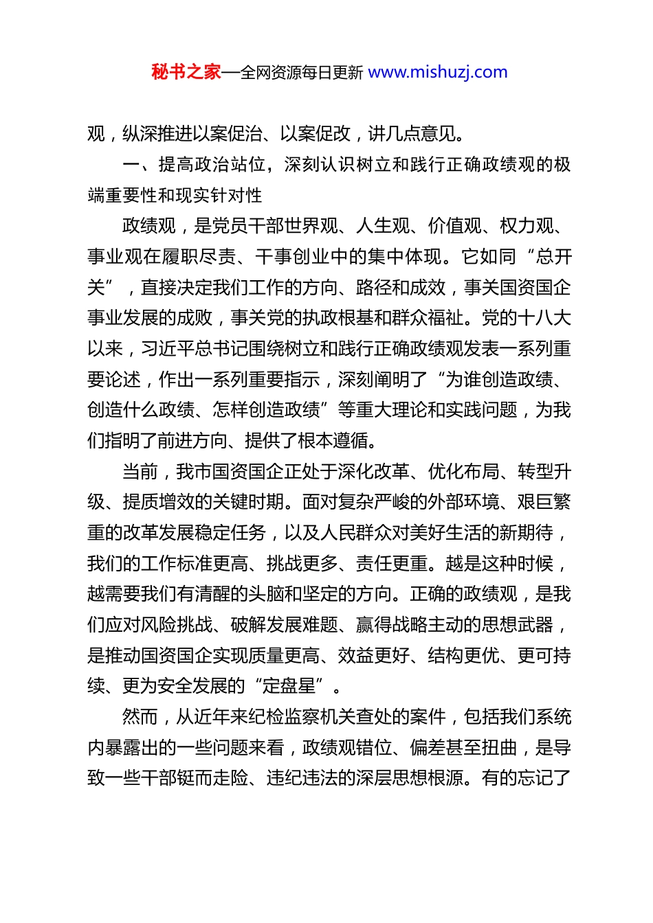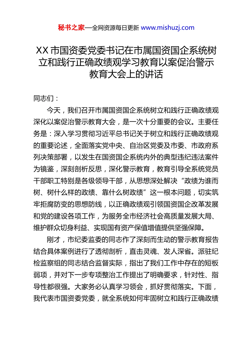 秘书之家—全网资源每日更新 www.mishuzj.comXX 市国资委党委书记在市属国资国企系统树立和践行正确政绩观学习教育以案促治警示教育大会上的讲话同志们:今天,我们召开市属国资国企系统树立和践行正确政绩观深化以案促治警示教育大会,是一次十分重要的会议。主要任务是:深入学习贯彻习近平总书记关于树立和践行正确政绩观的重要论述,全面落实党中央、自治区党委及市委、市政府系列决策部署,以发生在国资国企系统内外的典型违纪违法案件为镜鉴,深刻剖析反思,深化警示教育,教育引导全系统党员干部职工特别是各级领导干部,从思想深处解决“政绩为谁而树、树什么样的政绩、靠什么树政绩”这一根本问题,切实筑牢拒腐防变的思想防线,以正确政绩观引领国资国企改革发展和党的建设各项工作,为服务全市经济社会高质量发展大局、维护群众切身利益、实现国有资产保值增值提供坚强保障。刚才,市纪委监委的同志作了深刻而生动的警示教育报告结合具体案例进行了透彻剖析,直击灵魂、发人深省。派驻纪检监察组的同志结合监督实际,指出了我们工作中存在的短板弱项,并对下一步专项整治工作提出了明确要求,针对性、指导性都很强。大家务必认真学习领会,抓好贯彻落实。下面,我代表市国资委党委,就全系统如何牢固树立和践行正确政绩秘书之家—全网资源每日更新 www.mishuzj.com观,纵深推进以案促治、以案促改,讲几点意见。一、提高政治站位,深刻认识树立和践行正确政绩观的极端重要性和现实针对性政绩观,是党员干部世界观、人生观、价值观、权力观、事业观在履职尽责、干事创业中的集中体现。它如同“总开关”,直接决定我们工作的方向、路径和成效,事关国资国企事业发展的成败,事关党的执政根基和群众福祉。党的十八大以来,习近平总书记围绕树立和践行正确政绩观发表一系列重要论述,作出一系列重要指示,深刻阐明了“为谁创造政绩、创造什么政绩、怎样创造政绩”等重大理论和实践问题,为我们指明了前进方向、提供了根本遵循。当前,我市国资国企正处于深化改革、优化布局、转型升级、提质增效的关键时期。面对复杂严峻的外部环境、艰巨繁重的改革发展稳定任务,以及人民群众对美好生活的新期待,我们的工作标准更高、挑战更多、责任更重。越是这种时候,越需要我们有清醒的头脑和坚定的方向。正确的政绩观,是我们应对风险挑战、破解发展难题、赢得战略主动的思想武器,是推动国资国企实现质量更高、效益更好、结构更优、更可持续、更为安全发展的“定盘星”。然而,从近年来纪检监察机关查处的案件,包括我们系统内暴露出的一些问题来看,政绩观错位、偏差甚至扭曲,是导致一些干部铤而走险、违纪违法的深层思想根源。有的忘记了秘书之家—全网资源每日更新 www.mishuzj.com国企姓“党”属“国”的根本属性,在决策发展中偏离了为民造福的宗旨;有的好大喜功,热衷于搞“形象工程”“面子工程”,浪费国资资源,留下发展隐患;有的急功近利,为了短期数字好看,不顾客观规律,透支企业未来;有的担当精神不足,遇到矛盾绕道走,面对难题不作为,错失发展机遇;更有甚者,将手中掌握的国有资产资源作为谋取私利、进行利益交换的工具,严重损害国家利益和群众权益。这些问题的存在,不仅阻碍了企业健康发展,污染了政治生态,更侵蚀了党的执政基础,教训极其深刻。此次大会,就是要以案为鉴、以案明纪、以案促治,促使大家来一次思想深处的“大扫除”“大检修”,真正把正确的政绩观内化于心、外化于行。二、把握核心要义,全面理解正确政绩观的深刻内涵和实践要求树立和践行正确政绩观,首先要学懂弄通其核心要义。结合国资国企实际,我认为,正确的政绩观至少应包含以下几个方面的内涵:第一,必须坚持“政绩为人民”的根本立场。这是正确政绩观的出发点和落脚点。人民对美好生活的向往就是我们的奋斗目标。国有企业是中国特色社会主义的重要物质基础和政治基础,是党执政兴国的重要支柱和依靠力量,更是保障和改善民生、推进共同富裕的重要力量。这就决定了,国资国企创造的所有政绩,最终都要体现到实现好、维护好、发展好最广大秘书之家—全网资源每日更新 www.m...