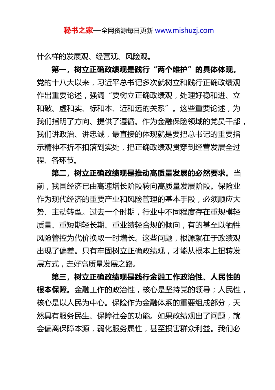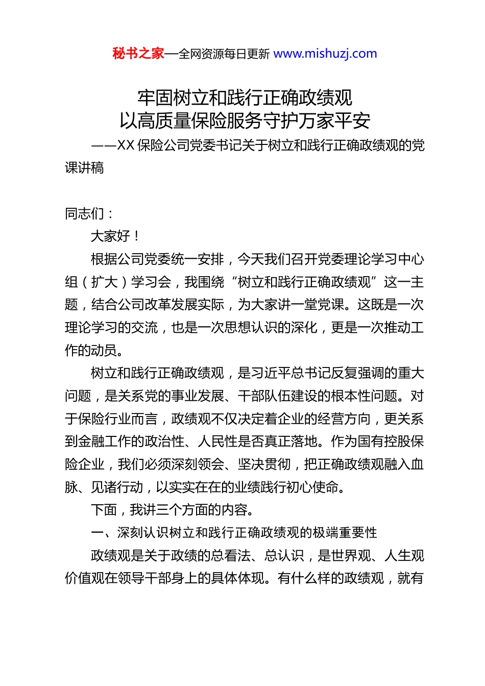 秘书之家—全网资源每日更新 www.mishuzj.com牢固树立和践行正确政绩观以高质量保险服务守护万家平安——XX 保险公司党委书记关于树立和践行正确政绩观的党课讲稿同志们:大家好!根据公司党委统一安排,今天我们召开党委理论学习中心组(扩大)学习会,我围绕“树立和践行正确政绩观”这一主题,结合公司改革发展实际,为大家讲一堂党课。这既是一次理论学习的交流,也是一次思想认识的深化,更是一次推动工作的动员。树立和践行正确政绩观,是习近平总书记反复强调的重大问题,是关系党的事业发展、干部队伍建设的根本性问题。对于保险行业而言,政绩观不仅决定着企业的经营方向,更关系到金融工作的政治性、人民性是否真正落地。作为国有控股保险企业,我们必须深刻领会、坚决贯彻,把正确政绩观融入血脉、见诸行动,以实实在在的业绩践行初心使命。下面,我讲三个方面的内容。一、深刻认识树立和践行正确政绩观的极端重要性政绩观是关于政绩的总看法、总认识,是世界观、人生观价值观在领导干部身上的具体体现。有什么样的政绩观,就有秘书之家—全网资源每日更新 www.mishuzj.com什么样的发展观、经营观、风险观。第一,树立正确政绩观是践行“两个维护”的具体体现。党的十八大以来,习近平总书记多次就树立和践行正确政绩观作出重要论述,强调“要树立正确政绩观,处理好稳和进、立和破、虚和实、标和本、近和远的关系”。这些重要论述,为我们指明了方向、提供了遵循。作为金融保险领域的党员干部,我们讲政治、讲忠诚,最直接的体现就是要把总书记的重要指示精神不折不扣落到实处,把正确政绩观贯穿到经营发展全过程、各环节。第二,树立正确政绩观是推动高质量发展的必然要求。当前,我国经济已由高速增长阶段转向高质量发展阶段。保险业作为现代经济的重要产业和风险管理的基本手段,必须顺应大势、主动转型。过去一个时期,行业中不同程度存在重规模轻质量、重短期轻长期、重业绩轻合规的倾向,有的甚至以牺牲风险管控为代价换取一时增长。这些问题,根源就在于政绩观出现了偏差。只有牢固树立正确政绩观,才能从根本上扭转发展方式,走好高质量发展之路。第三,树立正确政绩观是践行金融工作政治性、人民性的根本保障。金融工作的政治性,核心是坚持党的领导;人民性,核心是以人民为中心。保险作为金融体系的重要组成部分,天然具有服务民生、保障社会的功能。如果政绩观出了问题,就会偏离保障本源,弱化服务属性,甚至损害群众利益。我们必秘书之家—全网资源每日更新 www.mishuzj.com须始终牢记,保险姓“保”,保障是根本,服务是宗旨,任何时候都不能动摇。第四,树立正确政绩观是加强干部队伍建设的现实需要。政绩观是干部思想境界、党性修养、能力作风的集中反映。一个干部有没有正确的政绩观,直接决定了他能不能干出实实在在的业绩,能不能赢得群众的认可。我们要通过学习教育,引导全体干部员工特别是各级领导干部,把正确政绩观内化于心、外化于行,真正把心思用在干事创业上,把精力投到攻坚克难中。二、准确把握正确政绩观的科学内涵和实践要求正确政绩观内涵丰富、意蕴深刻。结合保险行业特点和公司实际,我们要重点把握好以下几个方面的要求。(一)坚持以人民为中心,把群众满意作为最高标准习近平总书记强调,“检验我们一切工作的成效,最终都要看人民是否真正得到了实惠,人民生活是否真正得到了改善。”对于保险公司来说,人民群众就是我们的服务对象,群众满意度就是我们衡量政绩的根本标尺。要把守护人民群众生命财产安全作为首要职责。保险的本质是风险保障,核心功能是在灾害事故发生后为群众提供经济补偿、减轻损失。我们要始终把保障人民群众生命财产安全放在第一位,无论是巨灾保险、农业保险,还是健康险、意外险,都要做到应赔尽赔、快赔优赔,真正让保险成为人民群众生产秘书之家—全网资源每日更新 www.mishuzj.com生活的“安全网”。要把助力人民美好生活作为工作出发点和落脚点。随着经济社会发展和人民生活水平提高,人民群众对保险的需求日益多元,从传统的风险保障向健康管理、养老规划、财富传承等延伸。我们要紧跟需求变...