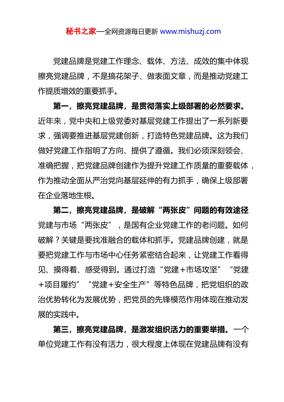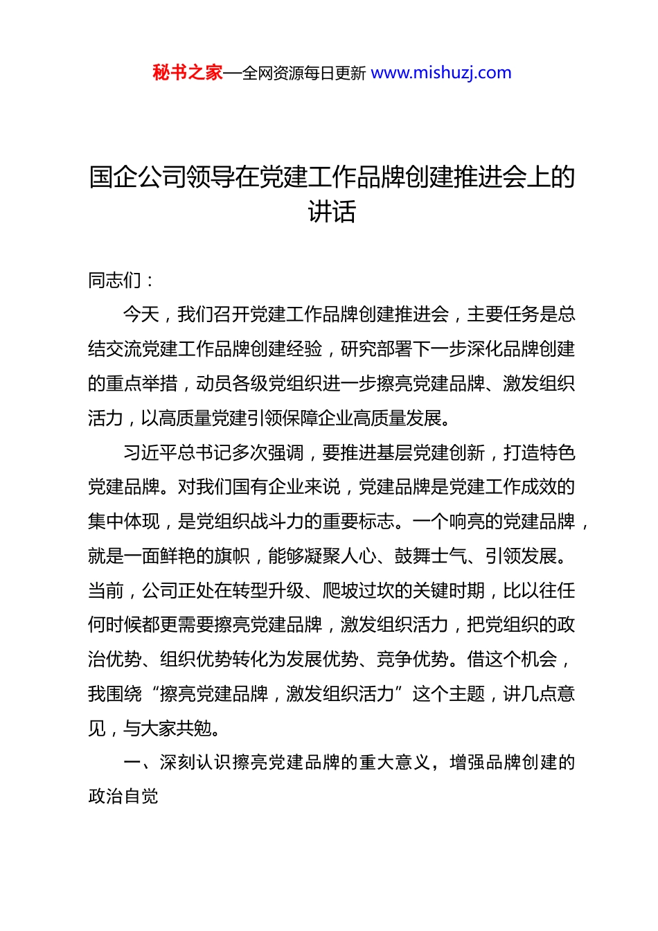 秘书之家—全网资源每日更新 www.mishuzj.com国企公司领导在党建工作品牌创建推进会上的讲话同志们:今天,我们召开党建工作品牌创建推进会,主要任务是总结交流党建工作品牌创建经验,研究部署下一步深化品牌创建的重点举措,动员各级党组织进一步擦亮党建品牌、激发组织活力,以高质量党建引领保障企业高质量发展。习近平总书记多次强调,要推进基层党建创新,打造特色党建品牌。对我们国有企业来说,党建品牌是党建工作成效的集中体现,是党组织战斗力的重要标志。一个响亮的党建品牌,就是一面鲜艳的旗帜,能够凝聚人心、鼓舞士气、引领发展。当前,公司正处在转型升级、爬坡过坎的关键时期,比以往任何时候都更需要擦亮党建品牌,激发组织活力,把党组织的政治优势、组织优势转化为发展优势、竞争优势。借这个机会,我围绕“擦亮党建品牌,激发组织活力”这个主题,讲几点意见,与大家共勉。一、深刻认识擦亮党建品牌的重大意义,增强品牌创建的政治自觉秘书之家—全网资源每日更新 www.mishuzj.com党建品牌是党建工作理念、载体、方法、成效的集中体现擦亮党建品牌,不是搞花架子、做表面文章,而是推动党建工作提质增效的重要抓手。第一,擦亮党建品牌,是贯彻落实上级部署的必然要求。近年来,党中央和上级党委对基层党建工作提出了一系列新要求,强调要推进基层党建创新,打造特色党建品牌。这为我们做好党建工作指明了方向、提供了遵循。我们必须深刻领会、准确把握,把党建品牌创建作为提升党建工作质量的重要载体,作为推动全面从严治党向基层延伸的有力抓手,确保上级部署在企业落地生根。第二,擦亮党建品牌,是破解“两张皮”问题的有效途径党建与市场“两张皮”,是国有企业党建工作的老问题。如何破解?关键是要找准融合的载体和抓手。党建品牌创建,就是要把党建工作与市场中心任务紧密结合起来,让党建工作看得见、摸得着、感受得到。通过打造“党建+市场攻坚”“党建+项目履约”“党建+安全生产”等特色品牌,把党组织的政治优势转化为发展优势,把党员的先锋模范作用体现在推动发展的实践中。第三,擦亮党建品牌,是激发组织活力的重要举措。一个单位党建工作有没有活力,很大程度上体现在党建品牌有没有秘书之家—全网资源每日更新 www.mishuzj.com特色、有没有影响。有活力的党建品牌,能够凝聚党员、吸引群众、推动工作。通过品牌创建,可以激发基层党组织的创新活力,增强党员的责任意识和荣誉感,提升党组织的凝聚力和战斗力。要让党建品牌成为展示党员风采的窗口,成为激发组织活力的引擎。第四,擦亮党建品牌,是提升企业形象的有力抓手。党建品牌是党建工作成效的集中体现,也是企业软实力的重要组成部分。一个叫得响、立得住、传得开的党建品牌,能够为企业赢得声誉、树立形象。在市场竞争中,党建品牌也是企业的一张名片。客户在选择合作伙伴时,不仅看技术实力、项目业绩,也看企业信誉、品牌形象。一个有特色、有影响的党建品牌,能够为企业加分增色。二、准确把握党建品牌的内涵特征,明确品牌创建的方向路径党建品牌不是凭空想象的,而是根植于实践、来源于基层的。我们要准确把握党建品牌的内涵特征,明确品牌创建的方向路径。第一,政治性是党建品牌的灵魂。党建品牌首先是党的品牌,政治性是第一属性。无论叫什么名字、搞什么载体,都必须把讲政治摆在首位。要体现党的宗旨,彰显党的性质,传播秘书之家—全网资源每日更新 www.mishuzj.com党的声音。要通过品牌创建,教育引导党员干部深刻领悟“两个确立”的决定性意义,增强“四个意识”、坚定“四个自信”、做到“两个维护”。要让党建品牌成为加强思想政治引领的阵地,成为筑牢理想信念根基的载体。第二,融合性是党建品牌的生命。党建品牌的生命力在于与中心工作的深度融合。如果品牌创建自拉自唱、自我循环,与市场工作“两张皮”,就难以持久、难以见效。要把品牌创建与市场承揽、项目履约、技术创新、风险防控等中心任务紧密结合起来,找准切入点和着力点。市场口的品牌要围绕市场开拓、客户维护来创建;项目上的品牌要围绕质量安全、进度管控来创建;技术口的品牌要围绕技术攻...