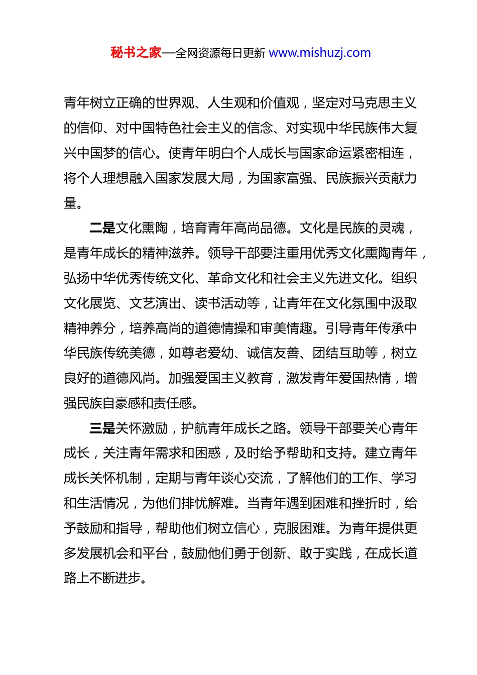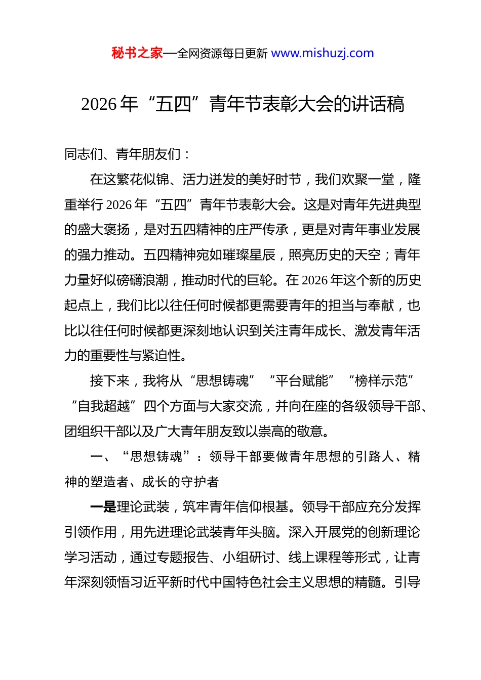秘书之家—全网资源每日更新 www.mishuzj.com2026 年“五四”青年节表彰大会的讲话稿 同志们、青年朋友们:在这繁花似锦、活力迸发的美好时节,我们欢聚一堂,隆重举行 2026 年“五四”青年节表彰大会。这是对青年先进典型的盛大褒扬,是对五四精神的庄严传承,更是对青年事业发展的强力推动。五四精神宛如璀璨星辰,照亮历史的天空;青年力量好似磅礴浪潮,推动时代的巨轮。在 2026 年这个新的历史起点上,我们比以往任何时候都更需要青年的担当与奉献,也比以往任何时候都更深刻地认识到关注青年成长、激发青年活力的重要性与紧迫性。接下来,我将从“思想铸魂”“平台赋能”“榜样示范”“自我超越”四个方面与大家交流,并向在座的各级领导干部、团组织干部以及广大青年朋友致以崇高的敬意。一、“思想铸魂”:领导干部要做青年思想的引路人、精神的塑造者、成长的守护者一是理论武装,筑牢青年信仰根基。领导干部应充分发挥引领作用,用先进理论武装青年头脑。深入开展党的创新理论学习活动,通过专题报告、小组研讨、线上课程等形式,让青年深刻领悟习近平新时代中国特色社会主义思想的精髓。引导秘书之家—全网资源每日更新 www.mishuzj.com青年树立正确的世界观、人生观和价值观,坚定对马克思主义的信仰、对中国特色社会主义的信念、对实现中华民族伟大复兴中国梦的信心。使青年明白个人成长与国家命运紧密相连,将个人理想融入国家发展大局,为国家富强、民族振兴贡献力量。二是文化熏陶,培育青年高尚品德。文化是民族的灵魂,是青年成长的精神滋养。领导干部要注重用优秀文化熏陶青年,弘扬中华优秀传统文化、革命文化和社会主义先进文化。组织文化展览、文艺演出、读书活动等,让青年在文化氛围中汲取精神养分,培养高尚的道德情操和审美情趣。引导青年传承中华民族传统美德,如尊老爱幼、诚信友善、团结互助等,树立良好的道德风尚。加强爱国主义教育,激发青年爱国热情,增强民族自豪感和责任感。三是关怀激励,护航青年成长之路。领导干部要关心青年成长,关注青年需求和困惑,及时给予帮助和支持。建立青年成长关怀机制,定期与青年谈心交流,了解他们的工作、学习和生活情况,为他们排忧解难。当青年遇到困难和挫折时,给予鼓励和指导,帮助他们树立信心,克服困难。为青年提供更多发展机会和平台,鼓励他们勇于创新、敢于实践,在成长道路上不断进步。秘书之家—全网资源每日更新 www.mishuzj.com二、“平台赋能”:团组织要做青年发展的推动者、资源的整合者、梦想的助力者一是搭建学习平台,让青年学有所成。团组织要整合各类学习资源,为青年搭建多元化学习平台。举办培训班、讲座、研讨会等,邀请专家学者、行业精英传授知识和技能。利用互联网技术,开发线上学习课程,让青年随时随地学习。鼓励青年自主学习和交流学习,组织学习小组、读书社团等,营造良好学习氛围。通过搭建学习平台,帮助青年提升知识水平和能力素质,为未来发展奠定基础。二是搭建实践平台,让青年行有所获。实践是青年成长的重要途径。团组织要为青年提供丰富的实践机会,组织青年参与志愿服务、社会调研、创新创业等活动,让青年在实践中了解社会、服务社会,增强社会责任感和使命感。加强与企业、高校、科研机构合作,为青年提供实习、实训、项目合作机会,让青年在实践中积累经验、提升能力。通过搭建实践平台,让青年在实践中实现自我价值,为社会发展贡献力量。三是搭建交流平台,让青年心有所通。团组织要搭建青年交流平台,促进青年之间的沟通与交流。举办青年论坛、沙龙、联谊会等活动,让青年在交流中分享经验、碰撞思想、增进友谊。利用互联网平台,建立青年交流社区、微信群等,方便青秘书之家—全网资源每日更新 www.mishuzj.com年随时随地交流。通过搭建交流平台,让青年拓宽视野、增长见识,建立良好人际关系网络,为成长发展创造有利条件。三、“榜样示范”:先进典型要做青年奋斗的楷模、精神的灯塔、行动的标杆一是树立奋斗榜样,激发青年进取精神。先进典型是青年奋斗的楷模。他们在各自领域取得优异成绩,凭借不懈努力和顽强拼搏实现人生价值。他们的奋...