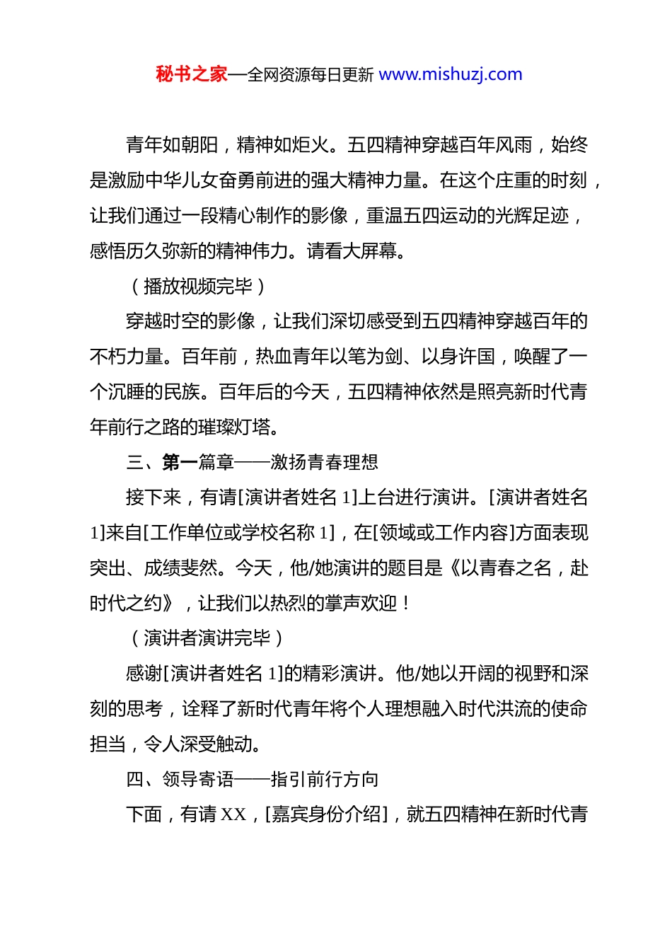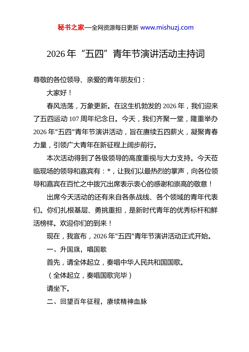 秘书之家—全网资源每日更新 www.mishuzj.com2026 年“五四”青年节演讲活动主持词 尊敬的各位领导、亲爱的青年朋友们:大家好!春风浩荡,万象更新。在这生机勃发的 2026 年,我们迎来了五四运动 107 周年纪念日。今天,我们齐聚一堂,隆重举办2026 年"五四"青年节演讲活动,旨在赓续五四薪火,凝聚青春力量,引领广大青年在新征程上阔步前行。本次活动得到了各级领导的高度重视与大力支持。今天莅临现场的领导和嘉宾有:*,让我们以最热烈的掌声,向各位领导和嘉宾在百忙之中拨冗出席表示衷心的感谢和崇高的敬意!出席今天活动的还有来自各条战线、各个领域的青年代表们。你们扎根基层、勇挑重担,是新时代青年的优秀标杆和鲜活榜样。欢迎你们的到来!现在,我宣布,2026 年"五四"青年节演讲活动正式开始。一、升国旗,唱国歌首先,请全体起立,奏唱中华人民共和国国歌。(全体起立,奏唱国歌完毕)请坐下。二、回望百年征程,赓续精神血脉秘书之家—全网资源每日更新 www.mishuzj.com青年如朝阳,精神如炬火。五四精神穿越百年风雨,始终是激励中华儿女奋勇前进的强大精神力量。在这个庄重的时刻,让我们通过一段精心制作的影像,重温五四运动的光辉足迹,感悟历久弥新的精神伟力。请看大屏幕。(播放视频完毕)穿越时空的影像,让我们深切感受到五四精神穿越百年的不朽力量。百年前,热血青年以笔为剑、以身许国,唤醒了一个沉睡的民族。百年后的今天,五四精神依然是照亮新时代青年前行之路的璀璨灯塔。三、第一篇章——激扬青春理想接下来,有请[演讲者姓名 1]上台进行演讲。[演讲者姓名1]来自[工作单位或学校名称 1],在[领域或工作内容]方面表现突出、成绩斐然。今天,他/她演讲的题目是《以青春之名,赴时代之约》,让我们以热烈的掌声欢迎!(演讲者演讲完毕)感谢[演讲者姓名 1]的精彩演讲。他/她以开阔的视野和深刻的思考,诠释了新时代青年将个人理想融入时代洪流的使命担当,令人深受触动。四、领导寄语——指引前行方向下面,有请 XX,[嘉宾身份介绍],就五四精神在新时代青秘书之家—全网资源每日更新 www.mishuzj.com年成长发展中的引领作用作重要讲话。(嘉宾发言完毕)感谢 XX 的殷切嘱托。谆谆教诲,语重心长,为我们青年指明了奋斗方向,注入了前行的不竭动力。五、第二篇章——勇担青春使命接下来,有请*上台演讲。*来自[工作单位或学校名称 2],长期扎根[相关领域],以实际行动展现了新时代青年的责任与担当。他/她演讲的题目是《奋斗是青春最亮丽的底色》,掌声有请!(演讲者演讲完毕)*的演讲真挚有力、振奋人心,让我们看到了青年一代不负韶华、奋发有为的精神风貌。六、前辈指引——点亮奋进之路下面,有请*,[嘉宾身份介绍],为青年朋友们如何在各自岗位上传承践行五四精神传经送宝、指点迷津。(嘉宾发言完毕)感谢*的悉心指导。高屋建瓴的见解和务实恳切的建议,必将成为广大青年砥砺前行的宝贵财富。七、总结致辞与五点希望刚才,我们聆听了两场精彩的演讲,也收获了嘉宾领导的秘书之家—全网资源每日更新 www.mishuzj.com真知灼见。在这个过程中,我们更加深刻地感悟到五四精神的时代内涵,也更加坚定了砥砺奋进的决心和信心。借此机会,我代表团市委,向全市各级团组织和广大青年朋友提出以下五点希望:一是筑牢信仰之基,做理想坚定的有志青年。全市各级团组织要把学习习近平新时代中国特色社会主义思想作为首要政治任务,以五四精神为生动教材,持续深化青年理想信念教育。广大青年要自觉将个人追求融入党和国家事业大局,在大是大非面前立场坚定,在风险挑战面前意志如钢,以坚定的理想信念筑牢青春之魂。二是练就过硬本领,做勤学善思的有才青年。青年时期是增长才干的黄金时期。广大青年要珍惜韶华、不负青春,树立终身学习理念,主动拥抱科技变革和产业转型,在数字经济、人工智能、绿色低碳等新兴领域深耕细作。各级团组织要搭建学习交流平台,组织技能培训、岗位练兵、导师带教等活动,助力青年成长成才。三是勇于创新创业,做开拓进取的有为青年。创新是引领发展的第一动力,青年是创新创业的生力军。广大青年要敢...