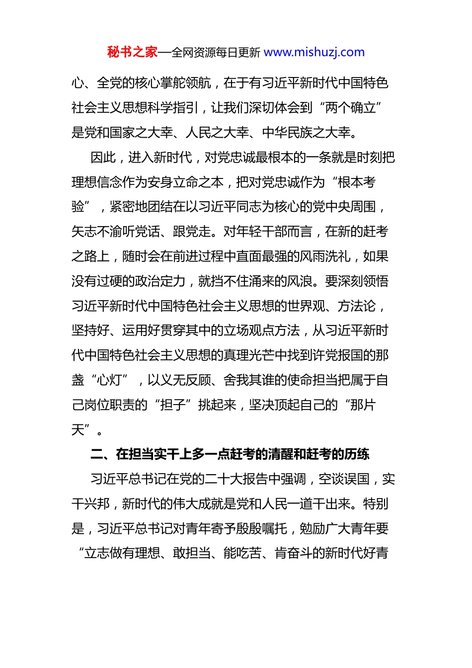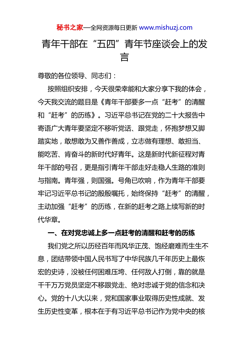 秘书之家—全网资源每日更新 www.mishuzj.com青年干部在“五四”青年节座谈会上的发言尊敬的各位领导、同志们:按照组织安排,今天很荣幸能和大家分享下我的体会,今天我交流的题目是《青年干部要多一点“赶考”的清醒和“赶考”的历练》。习近平总书记在党的二十大报告中寄语广大青年要坚定不移听党话、跟党走,怀抱梦想又脚踏实地,敢想敢为又善作善成,立志做有理想、敢担当、能吃苦、肯奋斗的新时代好青年。这是新时代新征程对青年干部的号召,更是指引青年干部走好走稳人生路的准则与指南。青年强,则国强。号角已吹响,作为青年干部要牢记习近平总书记的殷殷嘱托,始终保持“赶考”的清醒,主动加强“赶考”的历练,在新的赶考之路上续写新的时代华章。一、在对党忠诚上多一点赶考的清醒和赶考的历练我们党之所以历经百年而风华正茂、饱经磨难而生生不息,团结带领中国人民书写了中华民族几千年历史上最恢宏的史诗,没被任何困难压垮、任何敌人打倒,靠的就是千千万万党员坚定不移跟党走、绝对忠诚于党的信念和决心。党的十八大以来,党和国家事业取得历史性成就、发生历史性变革,根本在于有习近平总书记作为党中央的核秘书之家—全网资源每日更新 www.mishuzj.com心、全党的核心掌舵领航,在于有习近平新时代中国特色社会主义思想科学指引,让我们深切体会到“两个确立”是党和国家之大幸、人民之大幸、中华民族之大幸。因此,进入新时代,对党忠诚最根本的一条就是时刻把理想信念作为安身立命之本,把对党忠诚作为“根本考验”,紧密地团结在以习近平同志为核心的党中央周围,矢志不渝听党话、跟党走。对年轻干部而言,在新的赶考之路上,随时会在前进过程中直面最强的风雨洗礼,如果没有过硬的政治定力,就挡不住涌来的风浪。要深刻领悟习近平新时代中国特色社会主义思想的世界观、方法论,坚持好、运用好贯穿其中的立场观点方法,从习近平新时代中国特色社会主义思想的真理光芒中找到许党报国的那盏“心灯”,以义无反顾、舍我其谁的使命担当把属于自己岗位职责的“担子”挑起来,坚决顶起自己的“那片天”。二、在担当实干上多一点赶考的清醒和赶考的历练习近平总书记在党的二十大报告中强调,空谈误国,实干兴邦,新时代的伟大成就是党和人民一道干出来。特别是,习近平总书记对青年寄予殷殷嘱托,勉励广大青年要“立志做有理想、敢担当、能吃苦、肯奋斗的新时代好青秘书之家—全网资源每日更新 www.mishuzj.com年,让青春在全面建设社会主义现代化国家的火热实践中绽放绚丽之花”。愿以吾辈之青春,捍卫盛世之中华。年轻干部恰逢盛世、何其幸福。有梦想、有机会、有奋斗,江山壮丽、人民豪迈、前程远大。要始终胸怀“两个大局”、牢记“国之大者”,心怀梦想、踏歌前行,时时处处对标对表,实实在在落实推进,努力在服务改革发展稳定的大事上干出彩,在关注群众天天有感的小事上求实效。年轻干部朝气蓬勃、充满活力,一定要珍惜大好时光、大好机遇,把时间和精力用到干事创业上,保持一流状态、瞄准一流标准,努力干出新时代“第一等的工作”。尤其是不能当“温室型”干部,一离开温室大棚就蔫了,一到基层和艰苦地区就怂了;不能当“玻璃型”干部,心理脆弱,一摔打就碎了,一遇到挫折就崩溃了。要主动接受摔打磨练,把实践锻炼作为成长成才的“练兵场”和“试金石”,多经历几次“热锅上的蚂蚁”,练就干事创业的“几把刷子”,以“百尺竿头需进步”的闯劲、“长风破浪会有时”的干劲、“不破楼兰终不还”的韧劲,积极投身于担当实干这一“最好考场”。三、在心系群众上多一点赶考的清醒和赶考的历练秘书之家—全网资源每日更新 www.mishuzj.com党的二十大报告中,“人民”二字出现 105 次。江山就是人民,人民就是江山。坚持人民至上是党百年奋斗的成功经验,也是中国共产党人的最高价值追求。“江山就是人民,人民就是江山。中国共产党领导人民打江山、守江山,守的是人民的心。”习近平总书记在党的二十大报告中这一句铿锵话语直抵人心,现场掌声经久不息,这是赢得亿万中国人民信任和拥护的“掌声”。一切为了人民,一切依靠人民。年轻干部要坚持与人民...