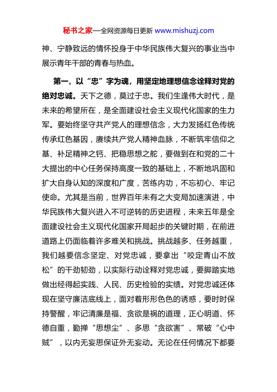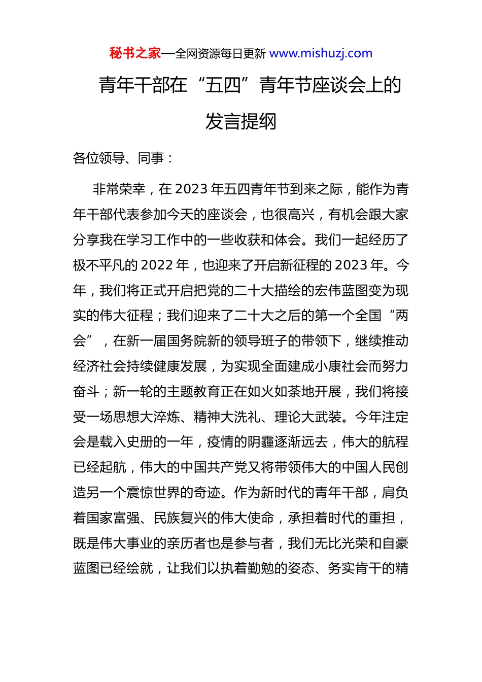 秘书之家—全网资源每日更新 www.mishuzj.com 青年干部在“五四”青年节座谈会上的发言提纲各位领导、同事:非常荣幸,在 2023 年五四青年节到来之际,能作为青年干部代表参加今天的座谈会,也很高兴,有机会跟大家分享我在学习工作中的一些收获和体会。我们一起经历了极不平凡的 2022 年,也迎来了开启新征程的 2023 年。今年,我们将正式开启把党的二十大描绘的宏伟蓝图变为现实的伟大征程;我们迎来了二十大之后的第一个全国“两会”,在新一届国务院新的领导班子的带领下,继续推动经济社会持续健康发展,为实现全面建成小康社会而努力奋斗;新一轮的主题教育正在如火如荼地开展,我们将接受一场思想大淬炼、精神大洗礼、理论大武装。今年注定会是载入史册的一年,疫情的阴霾逐渐远去,伟大的航程已经起航,伟大的中国共产党又将带领伟大的中国人民创造另一个震惊世界的奇迹。作为新时代的青年干部,肩负着国家富强、民族复兴的伟大使命,承担着时代的重担,既是伟大事业的亲历者也是参与者,我们无比光荣和自豪蓝图已经绘就,让我们以执着勤勉的姿态、务实肯干的精秘书之家—全网资源每日更新 www.mishuzj.com神、宁静致远的情怀投身于中华民族伟大复兴的事业当中展示青年干部的青春与热血。第一,以“忠”字为魂,用坚定地理想信念诠释对党的绝对忠诚。天下之德,莫过于忠。我们生逢伟大时代,是未来的希望所在,是全面建设社会主义现代化国家的生力军。要始终坚守共产党人的理想信念,大力发扬红色传统传承红色基因,赓续共产党人精神血脉,不断筑牢信仰之基、补足精神之钙、把稳思想之舵,要做到在和党的二十大提出的中心任务保持高度一致的基础上,不断地巩固和扩大自身认知的深度和广度,苦练内功,不忘初心、牢记使命。尤其是当前,世界百年未有之大变局加速演进,中华民族伟大复兴进入不可逆转的历史进程,未来五年是全面建设社会主义现代化国家开局起步的关键时期,在前进道路上仍面临着许多难关和挑战。挑战越多、任务越重,我们越要信念坚定、对党忠诚,要拿出“咬定青山不放松”的干劲韧劲,以实际行动诠释对党忠诚,要脚踏实地做出经得起实践、人民、历史检验的实绩。对党忠诚还体现在坚守廉洁底线上,面对着形形色色的诱惑,要时时保持警醒,牢记清廉是福、贪欲是祸的道理,正心明道、怀德自重,勤掸“思想尘”、多思“贪欲害”、常破“心中贼”,以内无妄思保证外无妄动。无论在任何情况下都要秘书之家—全网资源每日更新 www.mishuzj.com坚守原则,保持对纪律和规矩的敬畏之心,自觉抵制各种不正之风,始终做到清正廉洁自律。第二,以“学”字为基,不断提高能力本领更好为民群众服务。学习是提高工作能力的唯一路径。年轻干部精力充沛、思维活跃、接受能力强,正处在长本事、长才干的大好时期,加强学习能使领导和决策体现时代性、把握规律性、富于创造性,增强工作的科学性、预见性、主动性要把学习作为一种追求、一种爱好、一种健康的生活方式做到好学乐学;要学会独立思考,通过深入思考得到知识认识规律、掌握方法。把实践作为增强本领的根本途径,发扬实干苦干精神,坚持在干中学、学中干,做到学、思用贯通,知、信、行统一,不断在解决实际问题的过程中提高运用科学理论和丰富知识的能力。要利用主题教育的机会,自觉践行新思想,用新思想改造客观世界、推动事业发展,用新思想观察时代、把握时代、引领时代,从新思想汲取奋发进取的智慧和力量,以实干担当、奋斗姿态努力创造经得起历史和人民检验的实绩。第三,以“干”字为先,在真抓实干中展现才华实现人生的理想。奋斗成就梦想,实干铸就伟业。真抓实干是做好工作的关键,也是把工作蓝图变为现实的关键步骤。新时代下,我们青年干部要发扬求真务实的作风、鼓足真抓秘书之家—全网资源每日更新 www.mishuzj.com实干的劲头,砥砺奋斗,在本职岗位上干出一番事业。要始终胸怀“两个大局”、牢记“国之大者”,心怀梦想、踏歌前行,时时处处对标对表,实实在在落实推进,努力在服务改革发展稳定的大事上干出彩,在关注群众天天有感的小事上求实效。我们既要发扬“钉钉子”精神,俯下身,静...
