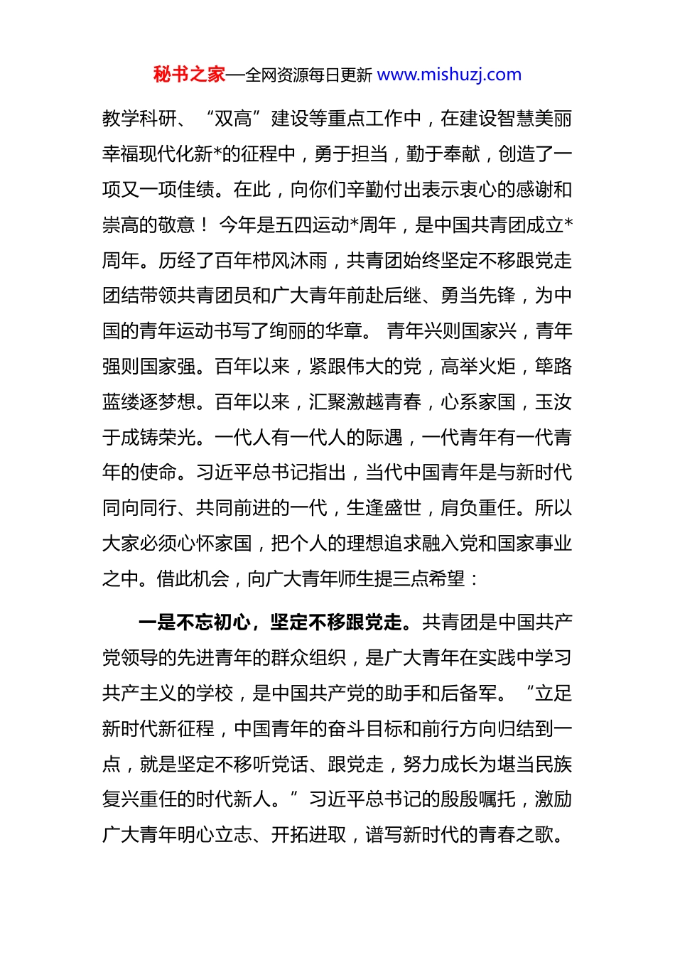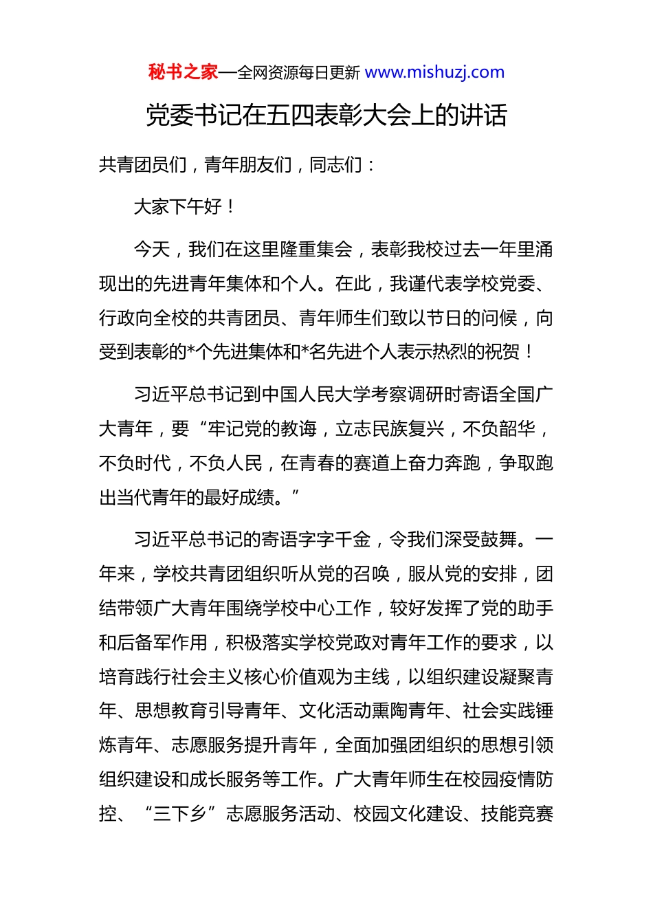 秘书之家—全网资源每日更新 www.mishuzj.com党委书记在五四表彰大会上的讲话共青团员们,青年朋友们,同志们:大家下午好!今天,我们在这里隆重集会,表彰我校过去一年里涌现出的先进青年集体和个人。在此,我谨代表学校党委、行政向全校的共青团员、青年师生们致以节日的问候,向受到表彰的*个先进集体和*名先进个人表示热烈的祝贺!习近平总书记到中国人民大学考察调研时寄语全国广大青年,要“牢记党的教诲,立志民族复兴,不负韶华,不负时代,不负人民,在青春的赛道上奋力奔跑,争取跑出当代青年的最好成绩。”习近平总书记的寄语字字千金,令我们深受鼓舞。一年来,学校共青团组织听从党的召唤,服从党的安排,团结带领广大青年围绕学校中心工作,较好发挥了党的助手和后备军作用,积极落实学校党政对青年工作的要求,以培育践行社会主义核心价值观为主线,以组织建设凝聚青年、思想教育引导青年、文化活动熏陶青年、社会实践锤炼青年、志愿服务提升青年,全面加强团组织的思想引领组织建设和成长服务等工作。广大青年师生在校园疫情防控、“三下乡”志愿服务活动、校园文化建设、技能竞赛秘书之家—全网资源每日更新 www.mishuzj.com教学科研、“双高”建设等重点工作中,在建设智慧美丽幸福现代化新*的征程中,勇于担当,勤于奉献,创造了一项又一项佳绩。在此,向你们辛勤付出表示衷心的感谢和崇高的敬意! 今年是五四运动*周年,是中国共青团成立*周年。历经了百年栉风沐雨,共青团始终坚定不移跟党走团结带领共青团员和广大青年前赴后继、勇当先锋,为中国的青年运动书写了绚丽的华章。 青年兴则国家兴,青年强则国家强。百年以来,紧跟伟大的党,高举火炬,筚路蓝缕逐梦想。百年以来,汇聚激越青春,心系家国,玉汝于成铸荣光。一代人有一代人的际遇,一代青年有一代青年的使命。习近平总书记指出,当代中国青年是与新时代同向同行、共同前进的一代,生逢盛世,肩负重任。所以大家必须心怀家国,把个人的理想追求融入党和国家事业之中。借此机会,向广大青年师生提三点希望:一是不忘初心,坚定不移跟党走。共青团是中国共产党领导的先进青年的群众组织,是广大青年在实践中学习共产主义的学校,是中国共产党的助手和后备军。“立足新时代新征程,中国青年的奋斗目标和前行方向归结到一点,就是坚定不移听党话、跟党走,努力成长为堪当民族复兴重任的时代新人。”习近平总书记的殷殷嘱托,激励广大青年明心立志、开拓进取,谱写新时代的青春之歌。秘书之家—全网资源每日更新 www.mishuzj.com我们要高举习近平新时代中国特色社会主义思想伟大旗帜全面贯彻党的十九大和历次全会精神,不忘跟党初心,牢记青春使命,奋发务实进取,勇于自我革命,为全面建设社会主义现代化国家、实现中华民族伟大复兴的中国梦努力奋斗。希望我校青年师生继续发扬“党有号召,团有行动”的优良传统,在技能比拼中尽显青春风采,在社会实践中贡献智慧力量,在志愿活动中播撒热情。二是树立理想,传承奋斗担当。新时代中国的发展进步,如同一堂堂生动而深刻的“大思政课”,让广大青年更好地读懂中国、把握未来。各项事业发展的傲人成就,让青年见证“中国之治”的独特优势;全面小康的千年梦圆,让青年感知“一个都不能少”的发展温度;疫情来袭时的果毅决策,让青年理解“人民至上、生命至上”的价值追求;人类命运共同体理念的生动实践,让青年拥有“平视世界”的自信从容。每一个奇迹的创造,每一个难关的跨越,都在坚定青年对党的爱戴与忠诚、对中国道路的认同、对民族复兴前景的信心。我们生逢“伟大的国家”和“最好的时代”,一定要牢固树立远大理想,坚定走建设有中国特色社会主义道路的信念,树立正确的世界观、人生观、价值观。按照习近平总书记对青年提出的“青春寄语录”的要求,志存高远,正己修德,争做栋梁秘书之家—全网资源每日更新 www.mishuzj.com为实现党所确定的宏伟目标而努力奋斗;要大力弘扬“忠诚、干净、担当,科学、求真、创新”的新时代水利精神争做新时代水利青年人,普及水知识、传播水文化、奉献水利事业,助力乡村振兴中继续书写不负党和人民殷切...