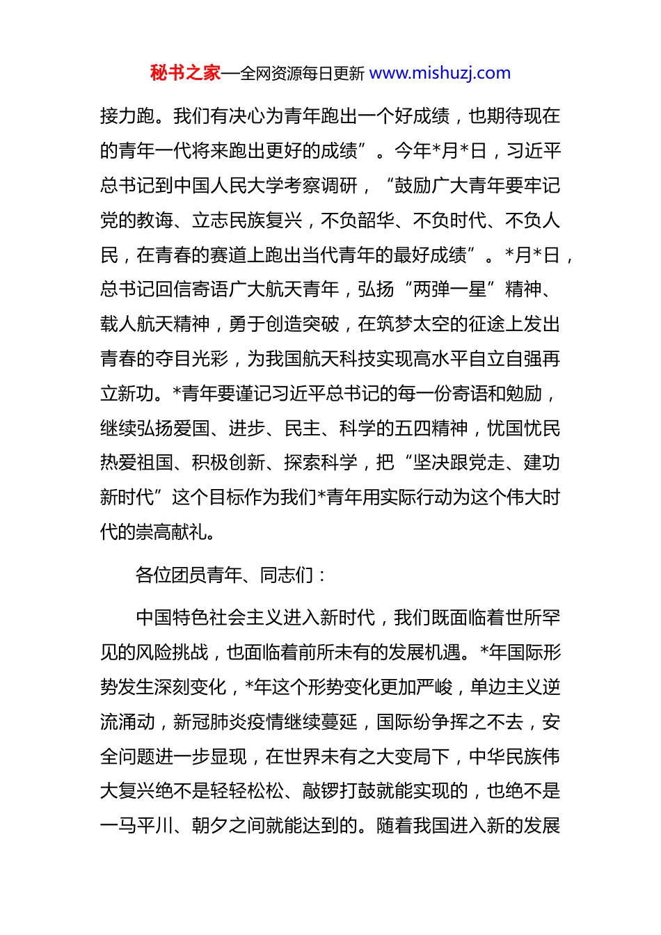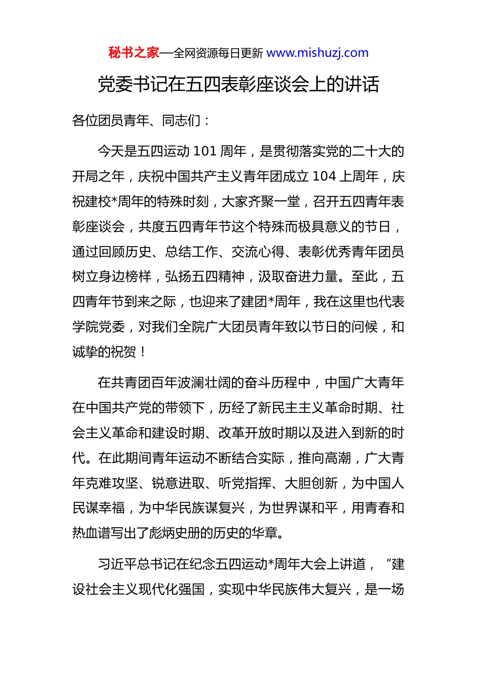 秘书之家—全网资源每日更新 www.mishuzj.com党委书记在五四表彰座谈会上的讲话各位团员青年、同志们:今天是五四运动 101 周年,是贯彻落实党的二十大的开局之年,庆祝中国共产主义青年团成立 104 上周年,庆祝建校*周年的特殊时刻,大家齐聚一堂,召开五四青年表彰座谈会,共度五四青年节这个特殊而极具意义的节日,通过回顾历史、总结工作、交流心得、表彰优秀青年团员树立身边榜样,弘扬五四精神,汲取奋进力量。至此,五四青年节到来之际,也迎来了建团*周年,我在这里也代表学院党委,对我们全院广大团员青年致以节日的问候,和诚挚的祝贺!在共青团百年波澜壮阔的奋斗历程中,中国广大青年在中国共产党的带领下,历经了新民主主义革命时期、社会主义革命和建设时期、改革开放时期以及进入到新的时代。在此期间青年运动不断结合实际,推向高潮,广大青年克难攻坚、锐意进取、听党指挥、大胆创新,为中国人民谋幸福,为中华民族谋复兴,为世界谋和平,用青春和热血谱写出了彪炳史册的历史的华章。习近平总书记在纪念五四运动*周年大会上讲道,“建设社会主义现代化强国,实现中华民族伟大复兴,是一场秘书之家—全网资源每日更新 www.mishuzj.com接力跑。我们有决心为青年跑出一个好成绩,也期待现在的青年一代将来跑出更好的成绩”。今年*月*日,习近平总书记到中国人民大学考察调研,“鼓励广大青年要牢记党的教诲、立志民族复兴,不负韶华、不负时代、不负人民,在青春的赛道上跑出当代青年的最好成绩”。*月*日,总书记回信寄语广大航天青年,弘扬“两弹一星”精神、载人航天精神,勇于创造突破,在筑梦太空的征途上发出青春的夺目光彩,为我国航天科技实现高水平自立自强再立新功。*青年要谨记习近平总书记的每一份寄语和勉励,继续弘扬爱国、进步、民主、科学的五四精神,忧国忧民热爱祖国、积极创新、探索科学,把“坚决跟党走、建功新时代”这个目标作为我们*青年用实际行动为这个伟大时代的崇高献礼。各位团员青年、同志们:中国特色社会主义进入新时代,我们既面临着世所罕见的风险挑战,也面临着前所未有的发展机遇。*年国际形势发生深刻变化,*年这个形势变化更加严峻,单边主义逆流涌动,新冠肺炎疫情继续蔓延,国际纷争挥之不去,安全问题进一步显现,在世界未有之大变局下,中华民族伟大复兴绝不是轻轻松松、敲锣打鼓就能实现的,也绝不是一马平川、朝夕之间就能达到的。随着我国进入新的发展秘书之家—全网资源每日更新 www.mishuzj.com阶段,在坚持传统产业转型升级与战略性新兴产业培育并举的经济发展形势下,作为拥有全球最完备工业产业体系的国家,无论是从国际环境还是国内发展来看,国家都需要一支庞大、稳定的职业技术人才队伍,以适应未来综合国力竞争的需要。职业教育为青年主动融入国家发展大局实现人生价值提供了和其他普通教育同等重要的广阔舞台习近平总书记在去年全国职业教育大会的重要批示中提到“职业教育前途广阔、大有可为”,今年全国人大通过了职业教育法,进一步明确了职业教育和普通教育同等重要要推进中国特色职业教育体系建立”,当前我们已经进入到全面建设中国特色社会主义现代化新征程,全省正在积极推进民族团结进步示范区,生态文明建设排头兵,面向*辐射中心的建设,*要和全国同基本实现现代化,*一年要多干五年的活,我们才可能和全国同步实现这样的目标,学校现在正处于双高建设的关键期,多重任务的叠加期,高质量发展的攻坚期,在这样一个关键时刻,我们通过回顾我们党的历史,回顾我们五四运动走过的历程,主要是要从中挖掘精神元素与红色基因。作为党的助手和后备军,作为党领导的先进青年的群团组织,要从党史学习教育中传承党的光荣传统和优良作风,赓续红色血脉,汲取坚实的信仰力量、丰富的理论滋秘书之家—全网资源每日更新 www.mishuzj.com养和奋进的勇气担当,广大*青年要将党史学习教育成果拓展到提升自身政治站位、综合素质、和工作能力上,要用实际行动来践行“请党放心,强国有我”的青春誓言,要把国之大者转化为我们的时代之思,把报国之志转化为我们的行动之实,努力成为高素质技术技能人才,大...