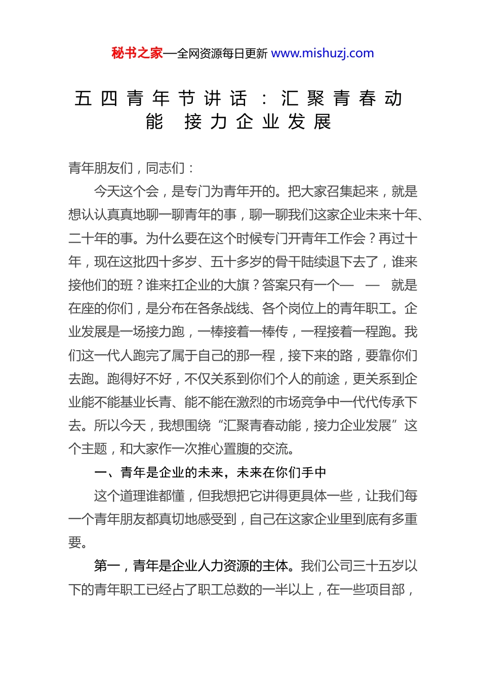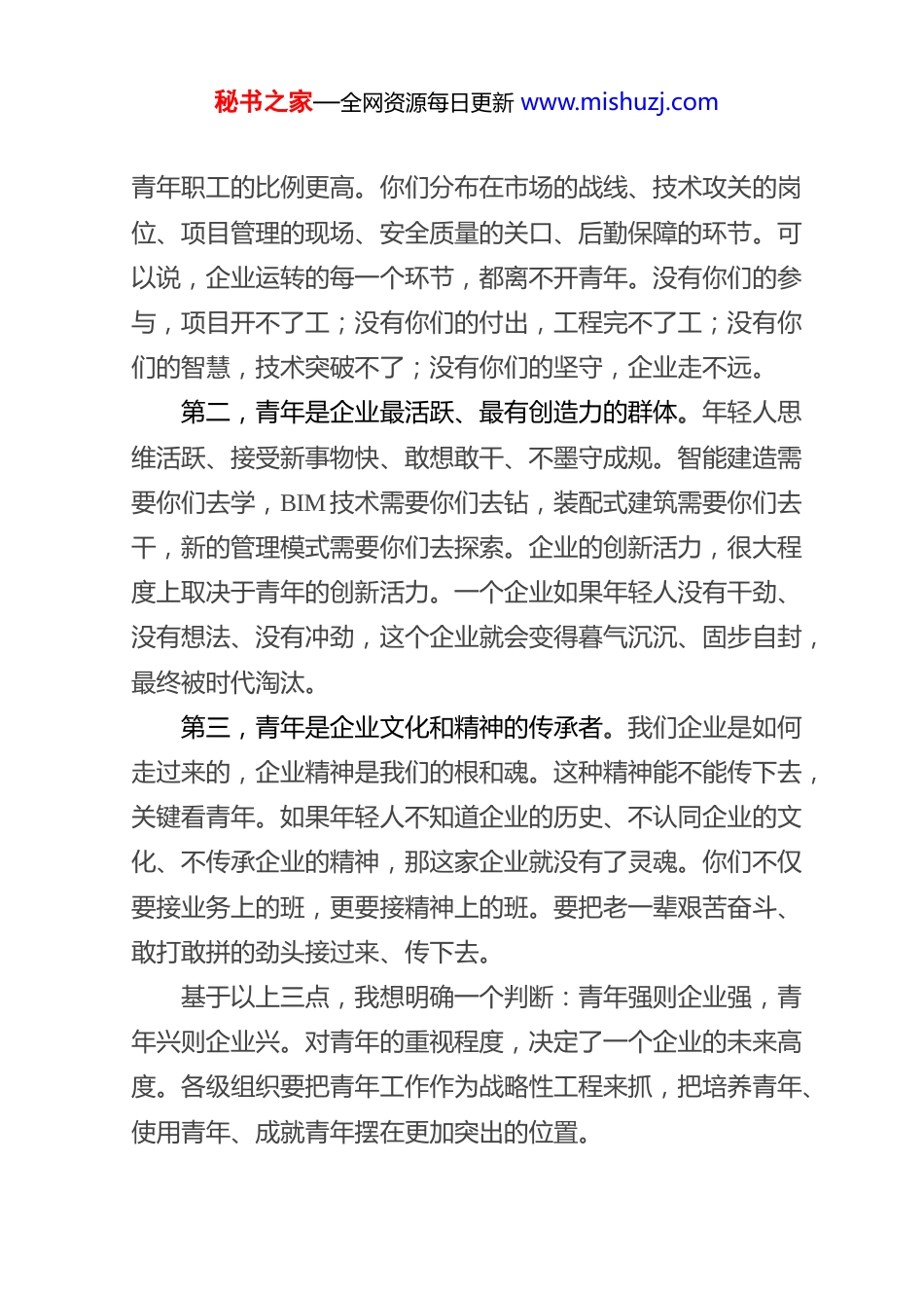 秘书之家—全网资源每日更新 www.mishuzj.com五 四 青 年 节 讲 话 : 汇 聚 青 春 动能 接 力 企 业 发 展青年朋友们,同志们:今天这个会,是专门为青年开的。把大家召集起来,就是想认认真真地聊一聊青年的事,聊一聊我们这家企业未来十年、二十年的事。为什么要在这个时候专门开青年工作会?再过十年,现在这批四十多岁、五十多岁的骨干陆续退下去了,谁来接他们的班?谁来扛企业的大旗?答案只有一个——就是在座的你们,是分布在各条战线、各个岗位上的青年职工。企业发展是一场接力跑,一棒接着一棒传,一程接着一程跑。我们这一代人跑完了属于自己的那一程,接下来的路,要靠你们去跑。跑得好不好,不仅关系到你们个人的前途,更关系到企业能不能基业长青、能不能在激烈的市场竞争中一代代传承下去。所以今天,我想围绕“汇聚青春动能,接力企业发展”这个主题,和大家作一次推心置腹的交流。一、青年是企业的未来,未来在你们手中这个道理谁都懂,但我想把它讲得更具体一些,让我们每一个青年朋友都真切地感受到,自己在这家企业里到底有多重要。第一,青年是企业人力资源的主体。我们公司三十五岁以下的青年职工已经占了职工总数的一半以上,在一些项目部,秘书之家—全网资源每日更新 www.mishuzj.com青年职工的比例更高。你们分布在市场的战线、技术攻关的岗位、项目管理的现场、安全质量的关口、后勤保障的环节。可以说,企业运转的每一个环节,都离不开青年。没有你们的参与,项目开不了工;没有你们的付出,工程完不了工;没有你们的智慧,技术突破不了;没有你们的坚守,企业走不远。第二,青年是企业最活跃、最有创造力的群体。年轻人思维活跃、接受新事物快、敢想敢干、不墨守成规。智能建造需要你们去学,BIM技术需要你们去钻,装配式建筑需要你们去干,新的管理模式需要你们去探索。企业的创新活力,很大程度上取决于青年的创新活力。一个企业如果年轻人没有干劲、没有想法、没有冲劲,这个企业就会变得暮气沉沉、固步自封,最终被时代淘汰。第三,青年是企业文化和精神的传承者。我们企业是如何走过来的,企业精神是我们的根和魂。这种精神能不能传下去,关键看青年。如果年轻人不知道企业的历史、不认同企业的文化、不传承企业的精神,那这家企业就没有了灵魂。你们不仅要接业务上的班,更要接精神上的班。要把老一辈艰苦奋斗、敢打敢拼的劲头接过来、传下去。基于以上三点,我想明确一个判断:青年强则企业强,青年兴则企业兴。对青年的重视程度,决定了一个企业的未来高度。各级组织要把青年工作作为战略性工程来抓,把培养青年、使用青年、成就青年摆在更加突出的位置。秘书之家—全网资源每日更新 www.mishuzj.com二、正视青年成长中的现实问题,不让一个青年掉队肯定青年的重要性,也要正视青年成长中面临的困难和问题。实事求是地讲,我们的青年工作还存在不少短板,青年的成长环境还有不少需要改善的地方。第一,部分青年的归属感不强。行业工作地点流动、条件艰苦、远离家人,年轻人刚来的时候满腔热情,时间一长,容易产生漂泊感和孤独感。有些项目上的青年,一年到头回不了几次家,个人婚恋问题解决不了,家庭照顾不上,心里难免会有波动。如果组织上关心不够、温暖不够,他们就可能产生“干几年就走”的想法。第二,部分青年的成长路径不清晰。有些青年同志反映,来了几年,不知道自己的发展方向在哪里,不知道往哪个方向努力。技术路线怎么走?管理路线怎么走?技能路线怎么走?通道是有,但不够清晰、不够畅通。再加上有些项目对青年重使用、轻培养,只让干活、不教本事,年轻人就会觉得没有盼头。第三,部分青年的能力素质跟不上。一方面是知识结构老化,学校里学的东西和现场实际脱节,来了以后适应周期长。另一方面是实践经验不足,有些年轻人理论功底不错,但动手能力差,解决实际问题的能力弱。再加上学习主动性不够,等着组织来培训、等着师傅来教,自己钻研的劲头不足,成长速度就慢了。秘书之家—全网资源每日更新 www.mishuzj.com第四,部分青年的价值取向有偏差。有的年轻同志心浮气躁,干了两年就觉得什么都...