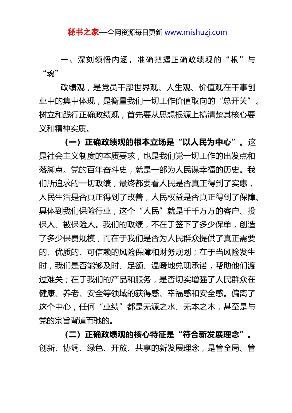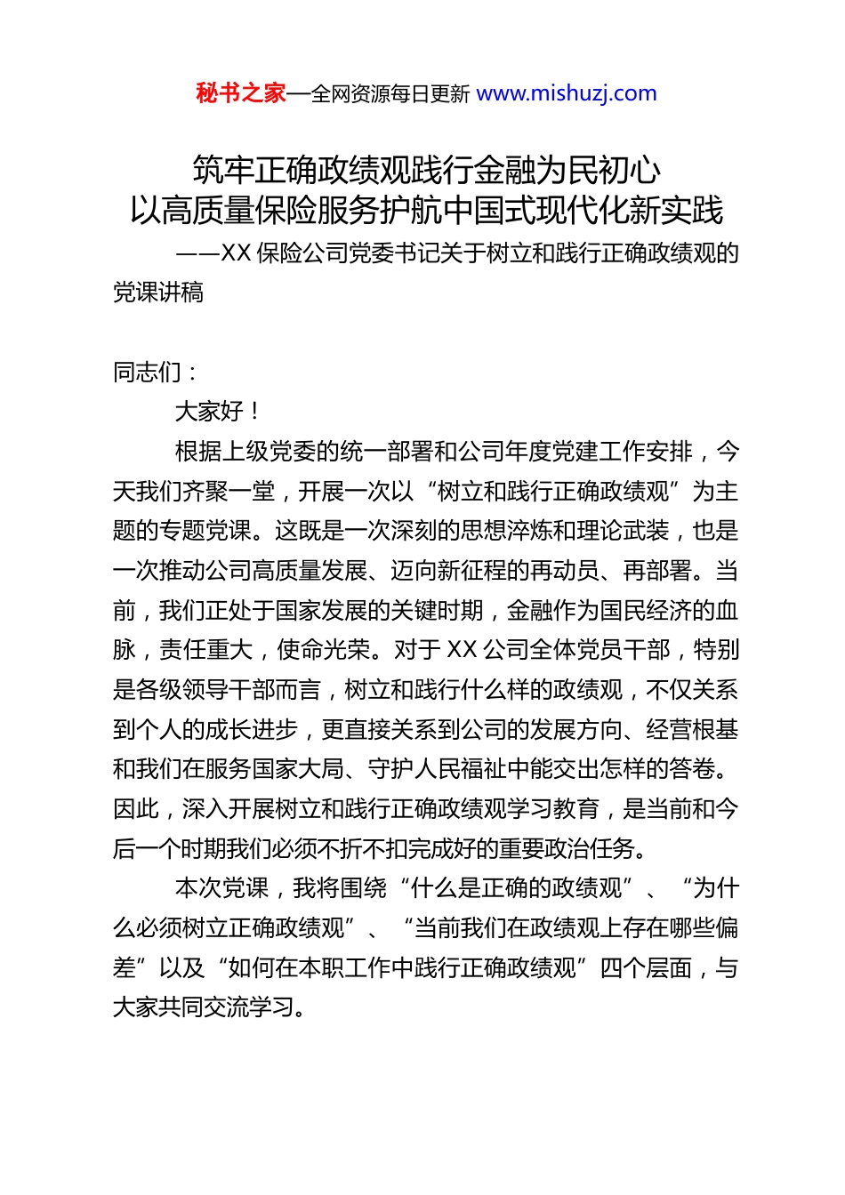 秘书之家—全网资源每日更新 www.mishuzj.com筑牢正确政绩观践行金融为民初心以高质量保险服务护航中国式现代化新实践——XX 保险公司党委书记关于树立和践行正确政绩观的党课讲稿同志们:大家好!根据上级党委的统一部署和公司年度党建工作安排,今天我们齐聚一堂,开展一次以“树立和践行正确政绩观”为主题的专题党课。这既是一次深刻的思想淬炼和理论武装,也是一次推动公司高质量发展、迈向新征程的再动员、再部署。当前,我们正处于国家发展的关键时期,金融作为国民经济的血脉,责任重大,使命光荣。对于 XX 公司全体党员干部,特别是各级领导干部而言,树立和践行什么样的政绩观,不仅关系到个人的成长进步,更直接关系到公司的发展方向、经营根基和我们在服务国家大局、守护人民福祉中能交出怎样的答卷。因此,深入开展树立和践行正确政绩观学习教育,是当前和今后一个时期我们必须不折不扣完成好的重要政治任务。本次党课,我将围绕“什么是正确的政绩观”、“为什么必须树立正确政绩观”、“当前我们在政绩观上存在哪些偏差”以及“如何在本职工作中践行正确政绩观”四个层面,与大家共同交流学习。秘书之家—全网资源每日更新 www.mishuzj.com一、深刻领悟内涵,准确把握正确政绩观的“根”与“魂”政绩观,是党员干部世界观、人生观、价值观在干事创业中的集中体现,是衡量我们一切工作价值取向的“总开关”。树立和践行正确政绩观,首先要从思想根源上搞清楚其核心要义和精神实质。(一)正确政绩观的根本立场是“以人民为中心”。这是社会主义制度的本质要求,也是我们党一切工作的出发点和落脚点。党的百年奋斗史,就是一部为人民谋幸福的历史。我们所追求的一切政绩,最终都要看人民是否真正得到了实惠,人民生活是否真正得到了改善,人民权益是否真正得到了保障。具体到我们保险行业,这个“人民”就是千千万万的客户、投保人、被保险人。我们的政绩,不在于签下了多少保单,创造了多少保费规模,而在于我们是否为人民群众提供了真正需要的、优质的、可信赖的风险保障和财务规划;在于当风险发生时,我们是否能够及时、足额、温暖地兑现承诺,帮助他们渡过难关;在于我们的产品和服务,是否切实增强了人民群众在健康、养老、安全等领域的获得感、幸福感和安全感。偏离了这个中心,任何“业绩”都是无源之水、无本之木,甚至是与党的宗旨背道而驰的。(二)正确政绩观的核心特征是“符合新发展理念”。创新、协调、绿色、开放、共享的新发展理念,是管全局、管秘书之家—全网资源每日更新 www.mishuzj.com根本、管长远的指挥棒。我们的政绩,必须是贯彻新发展理念的政绩。这意味着:1.创新驱动。我们的政绩,要体现在产品服务的创新上,能否运用科技手段提升服务效率和体验;体现在管理模式和风险管控技术的创新上,能否更好地识别和化解新兴风险。2.协调平衡。要处理好规模与效益、发展与风险、当前与长远、总部与基层、各业务线之间的协调发展关系,不能畸轻畸重、顾此失彼。3.绿色导向。要在绿色保险、环境污染责任险、气候风险管理等方面主动作为,服务“双碳”目标,这既是社会责任,也是未来新的业务增长点和政绩来源。4.开放共赢。在合规前提下,以更开放的姿态学习借鉴国际先进经验,在跨境业务、再保险等领域寻求合作,提升国际竞争力。5.共享成果。发展的成果要惠及更广大的人民群众和全体员工,要大力发展普惠金融,让保险保障覆盖更多低收入群体和弱势领域,同时也要让为公司发展做出贡献的员工共享发展红利。(三)正确政绩观的关键标准是“经得起历史、实践和人民的检验”。真正的、好的政绩,绝不是昙花一现的表面文章,更不是急功近利的“形象工程”。它必须具备三个维度上的“耐用性”:秘书之家—全网资源每日更新 www.mishuzj.com1.历史检验。我们所做的决策、推进的项目、制定的策略,在若干年后再回头看,是否依然站得住脚,是否符合行业发展趋势和公司长远利益?是否能成为公司基业长青的坚实基石,而不是需要后人“填坑”的隐患?2.实践检验。业绩好不好,最终要由市场说了算,由经营结果说了算。但这种结果必须是健康的、可持续的...