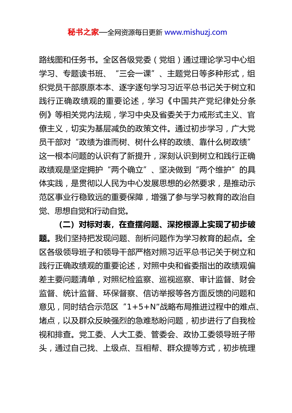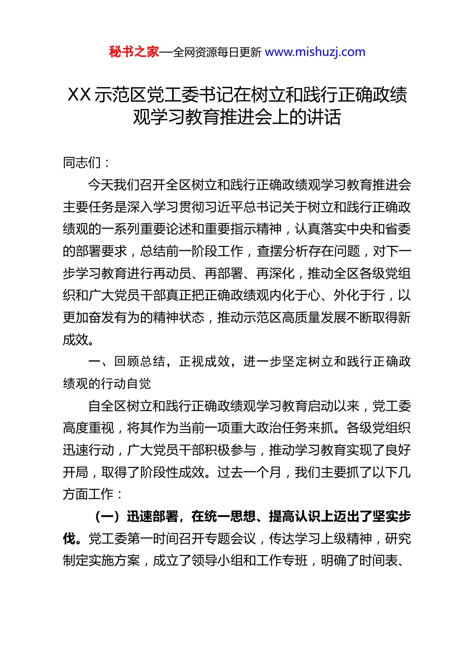 秘书之家—全网资源每日更新 www.mishuzj.comXX 示范区党工委书记在树立和践行正确政绩观学习教育推进会上的讲话同志们:今天我们召开全区树立和践行正确政绩观学习教育推进会主要任务是深入学习贯彻习近平总书记关于树立和践行正确政绩观的一系列重要论述和重要指示精神,认真落实中央和省委的部署要求,总结前一阶段工作,查摆分析存在问题,对下一步学习教育进行再动员、再部署、再深化,推动全区各级党组织和广大党员干部真正把正确政绩观内化于心、外化于行,以更加奋发有为的精神状态,推动示范区高质量发展不断取得新成效。一、回顾总结,正视成效,进一步坚定树立和践行正确政绩观的行动自觉自全区树立和践行正确政绩观学习教育启动以来,党工委高度重视,将其作为当前一项重大政治任务来抓。各级党组织迅速行动,广大党员干部积极参与,推动学习教育实现了良好开局,取得了阶段性成效。过去一个月,我们主要抓了以下几方面工作:(一)迅速部署,在统一思想、提高认识上迈出了坚实步伐。党工委第一时间召开专题会议,传达学习上级精神,研究制定实施方案,成立了领导小组和工作专班,明确了时间表、秘书之家—全网资源每日更新 www.mishuzj.com路线图和任务书。全区各级党委(党组)通过理论学习中心组学习、专题读书班、“三会一课”、主题党日等多种形式,组织党员干部原原本本、逐字逐句学习习近平总书记关于树立和践行正确政绩观的重要论述,学习《中国共产党纪律处分条例》等相关党内法规,学习中央及省委关于力戒形式主义、官僚主义,切实为基层减负的政策文件。通过初步学习,广大党员干部对“政绩为谁而树、树什么样的政绩、靠什么树政绩”这一根本问题的认识有了新提升,深刻认识到树立和践行正确政绩观是坚定拥护“两个确立”、坚决做到“两个维护”的具体实践,是贯彻以人民为中心发展思想的必然要求,是推动示范区事业行稳致远的重要保障,增强了参与学习教育的政治自觉、思想自觉和行动自觉。(二)对标对表,在查摆问题、深挖根源上实现了初步破题。我们坚持把发现问题、剖析问题作为学习教育的起点。全区各级领导班子和领导干部严格对照习近平总书记关于树立和践行正确政绩观的重要论述,对照中央和省委指出的政绩观偏差主要问题清单,对照纪检监察、巡视巡察、审计监督、财会监督、统计监督、环保督察、信访举报等各方面反馈的问题和意见,同时结合示范区“1+5+N”战略布局推进过程中的难点、堵点,以及群众反映强烈的急难愁盼问题,初步进行了自我检视和排查。党工委、人大工委、管委会、政协工委领导班子带头,通过自己找、上级点、互相帮、群众提等方式,初步梳理秘书之家—全网资源每日更新 www.mishuzj.com了在决策科学性、工作持续性、发展协调性、群众获得感等方面可能存在的政绩观偏差苗头或表现,建立了初步的问题清单。一些单位还结合实际,开展了“政绩观大家谈”、“纠偏正向案例剖析”等活动,引导干部从思想深处检视自身是否存在“重显绩轻潜绩”、“重场面轻实效”、“重形式轻内容”、“重当前轻长远”等倾向,为下一步深入整改奠定了基础。(三)边学边改,在纠偏正向、推动落实上见到了早期实效。我们强调学习教育的实践性,坚持学做结合、查改贯通。针对初步查摆和群众反映的问题,特别是那些违背发展规律、损害群众利益、增加基层负担的具体工作或决策苗头,我们不等不拖,立行立改、即知即改。例如,针对部分项目前期论证不够充分、急于上马的问题,我们进一步完善了重大项目科学决策和风险评估机制;针对一些检查考核过多过频、过度留痕的现象,我们着手清理规范,推动整合精简;针对民生领域某些“老大难”问题,我们明确了牵头领导和责任部门,限时推动解决。通过一个月的初步整改,一些形式主义、官僚主义的做法得到遏制,一些脱离实际、好大喜功的倾向得到纠正,推动各级干部把更多精力投入到打基础、利长远、惠民生的工作中去,学习教育初步显现了推动工作的效果。(四)统筹结合,在推动发展、服务民生上实现了同频共振。我们坚持把学习教育的落脚点放在推动高质量发展和增进民生福祉上。过去一个月,全区上下将激发出来...