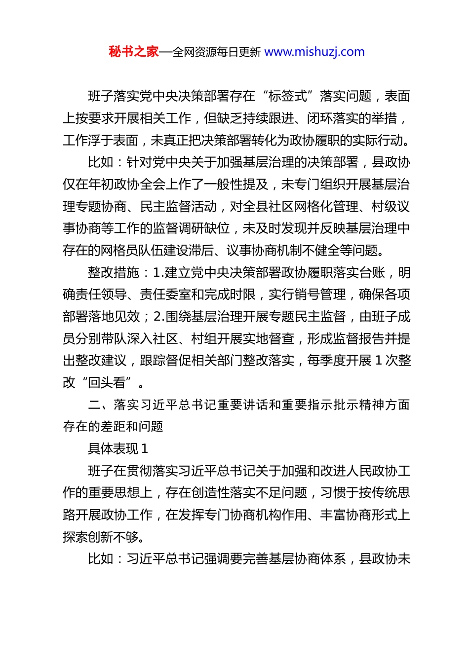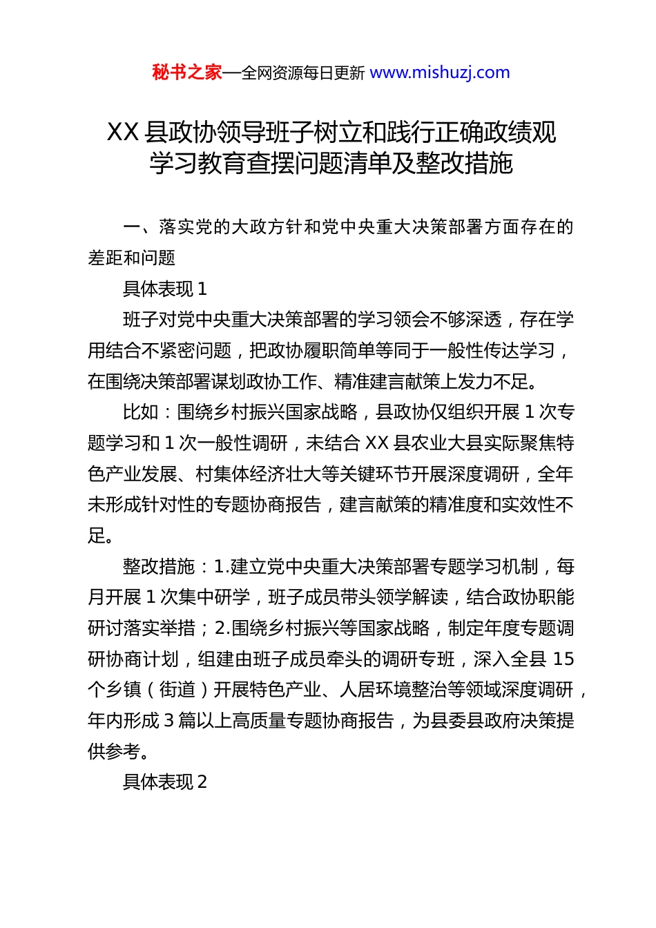 秘书之家—全网资源每日更新 www.mishuzj.comXX 县政协领导班子树立和践行正确政绩观学习教育查摆问题清单及整改措施一、落实党的大政方针和党中央重大决策部署方面存在的差距和问题具体表现 1班子对党中央重大决策部署的学习领会不够深透,存在学用结合不紧密问题,把政协履职简单等同于一般性传达学习,在围绕决策部署谋划政协工作、精准建言献策上发力不足。比如:围绕乡村振兴国家战略,县政协仅组织开展 1 次专题学习和 1 次一般性调研,未结合 XX 县农业大县实际聚焦特色产业发展、村集体经济壮大等关键环节开展深度调研,全年未形成针对性的专题协商报告,建言献策的精准度和实效性不足。整改措施:1.建立党中央重大决策部署专题学习机制,每月开展 1 次集中研学,班子成员带头领学解读,结合政协职能研讨落实举措;2.围绕乡村振兴等国家战略,制定年度专题调研协商计划,组建由班子成员牵头的调研专班,深入全县 15个乡镇(街道)开展特色产业、人居环境整治等领域深度调研,年内形成 3 篇以上高质量专题协商报告,为县委县政府决策提供参考。具体表现 2秘书之家—全网资源每日更新 www.mishuzj.com班子落实党中央决策部署存在“标签式”落实问题,表面上按要求开展相关工作,但缺乏持续跟进、闭环落实的举措,工作浮于表面,未真正把决策部署转化为政协履职的实际行动。比如:针对党中央关于加强基层治理的决策部署,县政协仅在年初政协全会上作了一般性提及,未专门组织开展基层治理专题协商、民主监督活动,对全县社区网格化管理、村级议事协商等工作的监督调研缺位,未及时发现并反映基层治理中存在的网格员队伍建设滞后、议事协商机制不健全等问题。整改措施:1.建立党中央决策部署政协履职落实台账,明确责任领导、责任委室和完成时限,实行销号管理,确保各项部署落地见效;2.围绕基层治理开展专题民主监督,由班子成员分别带队深入社区、村组开展实地督查,形成监督报告并提出整改建议,跟踪督促相关部门整改落实,每季度开展 1 次整改“回头看”。二、落实习近平总书记重要讲话和重要指示批示精神方面存在的差距和问题具体表现 1班子在贯彻落实习近平总书记关于加强和改进人民政协工作的重要思想上,存在创造性落实不足问题,习惯于按传统思路开展政协工作,在发挥专门协商机构作用、丰富协商形式上探索创新不够。比如:习近平总书记强调要完善基层协商体系,县政协未秘书之家—全网资源每日更新 www.mishuzj.com结合县域实际打造基层协商品牌,全县仅 3 个乡镇建立政协委员联络站,且联络站仅开展政策宣传等基础工作,未常态化组织委员与群众开展面对面协商,全年基层协商活动开展不足 5次,协商成果转化机制不健全。整改措施:1.班子成员带头深入学习习近平总书记关于人民政协工作的重要思想,每季度开展 1 次专题研讨,结合 XX县实际探索协商工作新路径;2.加快推进全县 15 个乡镇(街道)政协委员联络站标准化建设,年内实现全覆盖,制定联络站工作规则,明确协商议题收集、组织开展、成果转化等流程,每月组织开展 1 次基层协商活动,打造“XX 政协基层协商”品牌。具体表现 2班子对习近平总书记关于民生保障、生态保护等重要指示批示精神的贯彻落实,存在结合政协民主监督职能跟进不够及时的问题,监督缺乏针对性和有效性,未形成常态化监督机制。比如:针对习近平总书记关于生态环境保护的重要指示批示精神,县政协仅组织开展 1 次生态环境整治专项视察,未对全县河流污染治理、农村生活垃圾处理等重点问题开展持续跟踪监督,对视察中发现的 XX 河支流沿岸畜禽养殖污染、乡镇垃圾中转站运行不畅等问题,未形成专项监督意见并跟踪整改,问题整改成效不明显。整改措施:1.建立习近平总书记重要指示批示精神贯彻落秘书之家—全网资源每日更新 www.mishuzj.com实专项监督机制,班子成员分工负责,围绕生态保护、民生保障等领域制定年度监督计划;2.围绕 XX 河生态治理、农村环境整治等开展持续跟踪监督,每两个月开展 1 次实地督查,形成监督意见书报送县委县政府,督促相关部门限期整改,及时向社会公开整改结果,...