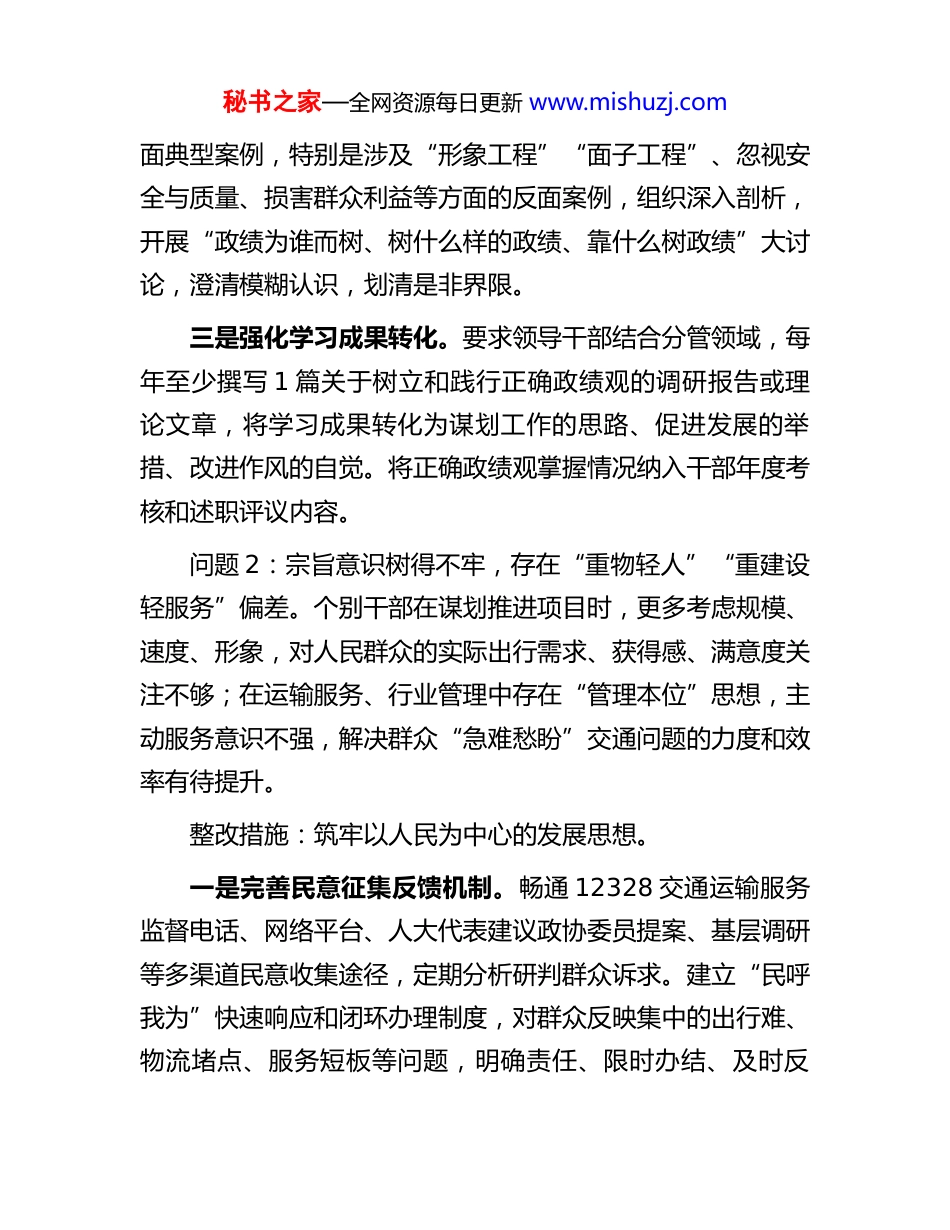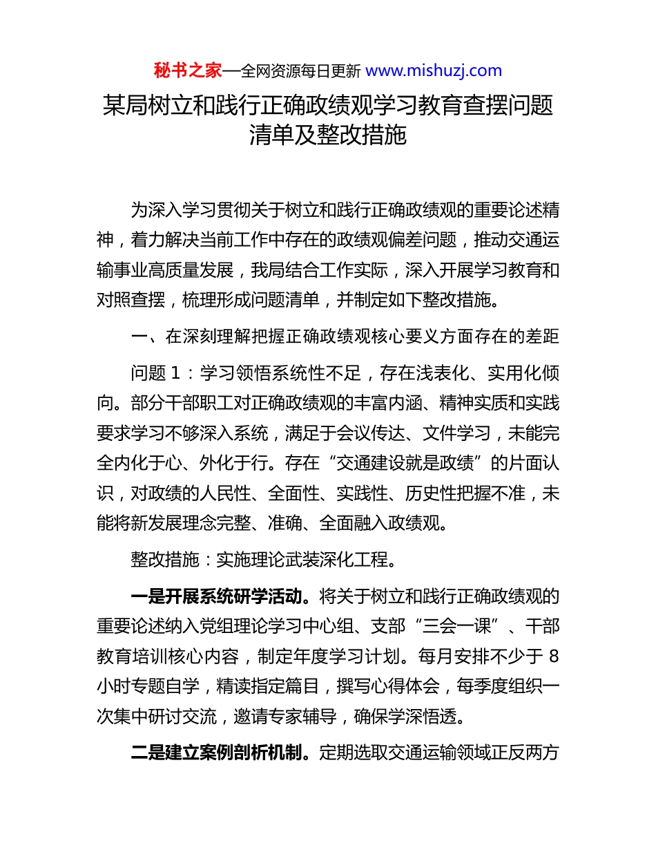 秘书之家—全网资源每日更新 www.mishuzj.com某局树立和践行正确政绩观学习教育查摆问题清单及整改措施为深入学习贯彻关于树立和践行正确政绩观的重要论述精神,着力解决当前工作中存在的政绩观偏差问题,推动交通运输事业高质量发展,我局结合工作实际,深入开展学习教育和对照查摆,梳理形成问题清单,并制定如下整改措施。一、在深刻理解把握正确政绩观核心要义方面存在的差距问题 1:学习领悟系统性不足,存在浅表化、实用化倾向。部分干部职工对正确政绩观的丰富内涵、精神实质和实践要求学习不够深入系统,满足于会议传达、文件学习,未能完全内化于心、外化于行。存在“交通建设就是政绩”的片面认识,对政绩的人民性、全面性、实践性、历史性把握不准,未能将新发展理念完整、准确、全面融入政绩观。整改措施:实施理论武装深化工程。一是开展系统研学活动。将关于树立和践行正确政绩观的重要论述纳入党组理论学习中心组、支部“三会一课”、干部教育培训核心内容,制定年度学习计划。每月安排不少于 8小时专题自学,精读指定篇目,撰写心得体会,每季度组织一次集中研讨交流,邀请专家辅导,确保学深悟透。二是建立案例剖析机制。定期选取交通运输领域正反两方秘书之家—全网资源每日更新 www.mishuzj.com面典型案例,特别是涉及“形象工程”“面子工程”、忽视安全与质量、损害群众利益等方面的反面案例,组织深入剖析,开展“政绩为谁而树、树什么样的政绩、靠什么树政绩”大讨论,澄清模糊认识,划清是非界限。三是强化学习成果转化。要求领导干部结合分管领域,每年至少撰写 1 篇关于树立和践行正确政绩观的调研报告或理论文章,将学习成果转化为谋划工作的思路、促进发展的举措、改进作风的自觉。将正确政绩观掌握情况纳入干部年度考核和述职评议内容。问题 2:宗旨意识树得不牢,存在“重物轻人”“重建设轻服务”偏差。个别干部在谋划推进项目时,更多考虑规模、速度、形象,对人民群众的实际出行需求、获得感、满意度关注不够;在运输服务、行业管理中存在“管理本位”思想,主动服务意识不强,解决群众“急难愁盼”交通问题的力度和效率有待提升。整改措施:筑牢以人民为中心的发展思想。一是完善民意征集反馈机制。畅通 12328 交通运输服务监督电话、网络平台、人大代表建议政协委员提案、基层调研等多渠道民意收集途径,定期分析研判群众诉求。建立“民呼我为”快速响应和闭环办理制度,对群众反映集中的出行难、物流堵点、服务短板等问题,明确责任、限时办结、及时反秘书之家—全网资源每日更新 www.mishuzj.com馈。二是实施服务品质提升行动。聚焦公共交通、农村客运、货运物流、出行信息服务等重点领域,每年确定并实施一批“交通惠民”实事项目。优化公交线网,提升城乡客运一体化水平,推进“司机之家”建设,改善出行体验。强化窗口单位、执法队伍服务规范,整治“冷硬横推”现象。三是健全民生福祉评价体系。在项目评估、政策制定、考核评价中,加大群众满意度、出行便利度、服务可及性等指标的权重。探索引入第三方评估,客观真实反映交通运输发展给人民群众带来的实际福祉。二、在推动交通运输高质量发展方面存在的偏差问题 3:发展理念存在惯性思维,创新驱动、绿色低碳意识不强。部分工作仍习惯于传统路径依赖,对智慧交通、绿色交通等新业态新模式研究不够、推动乏力;在项目规划建设中,对生态环境保护、资源节约集约利用考虑不足;推动多式联运、运输结构调整等深度不够。整改措施:贯彻新发展理念,转变发展方式。一是加强前瞻性战略性研究。组建专班,加强对智慧交通(如车路协同、自动驾驶)、绿色交通(如新能源装备推广、绿色基础设施建设)、交通强国建设重点任务等方面的政策研究和技术储备。制定出台相关发展规划和行动计划,明确时间秘书之家—全网资源每日更新 www.mishuzj.com表、路线图。二是强化规划建设生态环保约束。严格执行项目环境影响评价制度,在交通基础设施规划、设计、建设、运营全生命周期落实生态保护、节能减排要求。推广使用节能环保材料、工艺和技术,加大废旧材料循环利用力度。对在建和拟建项目开展...