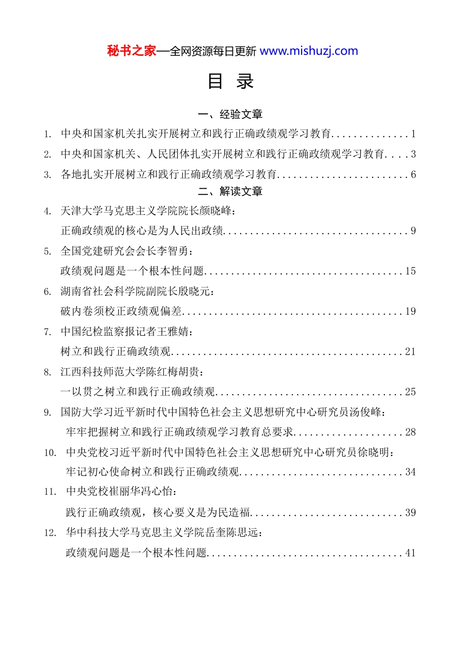 秘书之家—全网资源每日更新 www.mishuzj.com目 录一、经验文章1. 中央和国家机关扎实开展树立和践行正确政绩观学习教育..............1 2. 中央和国家机关、人民团体扎实开展树立和践行正确政绩观学习教育....3 3. 各地扎实开展树立和践行正确政绩观学习教育........................6 二、解读文章4. 天津大学马克思主义学院院长颜晓峰: 正确政绩观的核心是为人民出政绩..................................9 5. 全国党建研究会会长李智勇: 政绩观问题是一个根本性问题.....................................15 6. 湖南省社会科学院副院长殷晓元: 破内卷须校正政绩观偏差.........................................19 7. 中国纪检监察报记者王雅婧: 树立和践行正确政绩观...........................................21 8. 江西科技师范大学陈红梅胡贵: 一以贯之树立和践行正确政绩观...................................25 9. 国防大学习近平新时代中国特色社会主义思想研究中心研究员汤俊峰: 牢牢把握树立和践行正确政绩观学习教育总要求....................28 10. 中央党校习近平新时代中国特色社会主义思想研究中心研究员徐晓明: 牢记初心使命树立和践行正确政绩观..............................34 11. 中央党校崔丽华冯心怡: 践行正确政绩观,核心要义是为民造福............................39 12. 华中科技大学马克思主义学院岳奎陈思远: 政绩观问题是一个根本性问题....................................41 秘书之家—全网资源每日更新 www.mishuzj.com13. 复旦大学马克思主义学院教授杨德山: 党性起决定性作用..............................................43 14. 中央党校(国家行政学院)二级教授刘炳香: 坚持高质量发展要成为领导干部政绩观的重要内容..................46 15. 中国社会科学院马克思主义研究院研究员任洁: 以实干出政绩..................................................48 16. 中央党校习近平新时代中国特色社会主义思想研究中心研究员银元: 用好考核指挥棒................................................51 17. 中国社会科学院马正立: 推动管党治党责任落实到位......................................53 18. 甘肃省社会科学院马克思主义研究所副教授王宝贵: 树立和践行正确政绩观..........................................56 19. 东华大学教授: 功成不必在我,功成必定有我:深刻认识“正确政绩观”............59 20. 北京第二外国语学院马克思主义学院朱慧勇: 政绩观,是衡量党员干部履职尽责、干事创业的标尺................62 21. 西南财经大学法学院副教授李振贤: 政法系统树立和践行正确政绩观要答好三道题......................66 22. 上海财经大学马克思主义学院教授: 从四个维度理解和把握正确政绩观................................68 23. 河北省委党史研究室主任刘笑乙: 自觉树立和践行正确政绩观......................................71 24. 中国浦东干部学院基层社会治理创新研究中心主任: 立足“两个事关”,树立和践行正确政绩观........................75 25. 广东开放大学科学技术部部长陈东英: 全民终身学习高质量发展需要正确政绩观引领......................78 秘书之家—全网资源每日更新 www.mishuzj.com26. 山东财经大学党委书记查玉喜: 正确政绩观是落实立德树人根本任务的保障........................80 27. 天津银行董事长于建忠: 以中国特色金融文化引领树立和践行正确政绩观....................82 28. 中央党校(国家行政学院)党的建设教研部教授赵绪生: 为什么说政绩观问题是一个根本性问题............................85 29. 李步前: 习近平总书记强调的“政绩观”:牢牢把握正确政绩观的根本要求……89 三、访谈文章30. 中央党校(国家行政学院)科研部副主任洪向华: 接受专访:关键是政绩观一定要对头..............................93 31. 曾峻刘靖北沈斐: ...