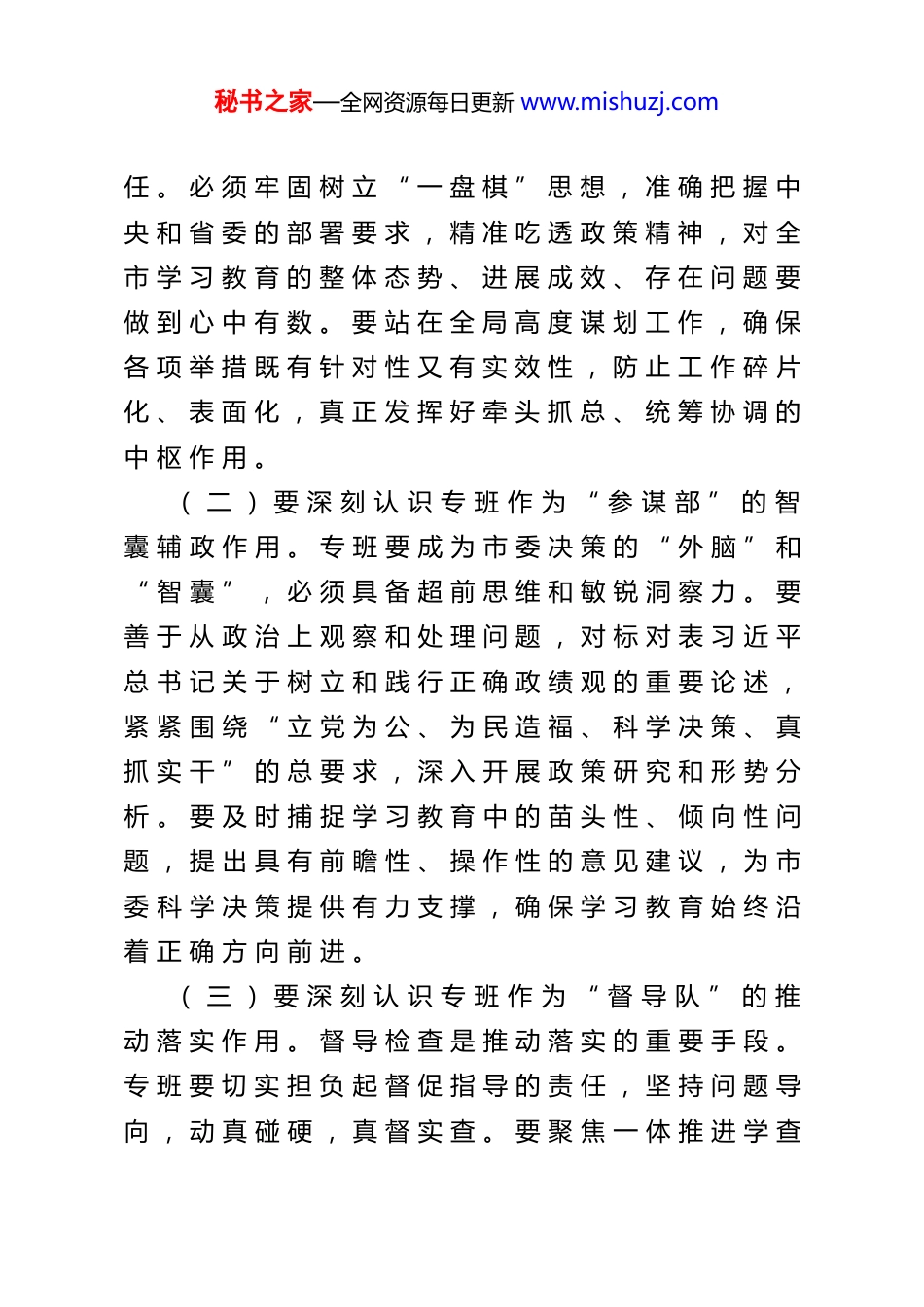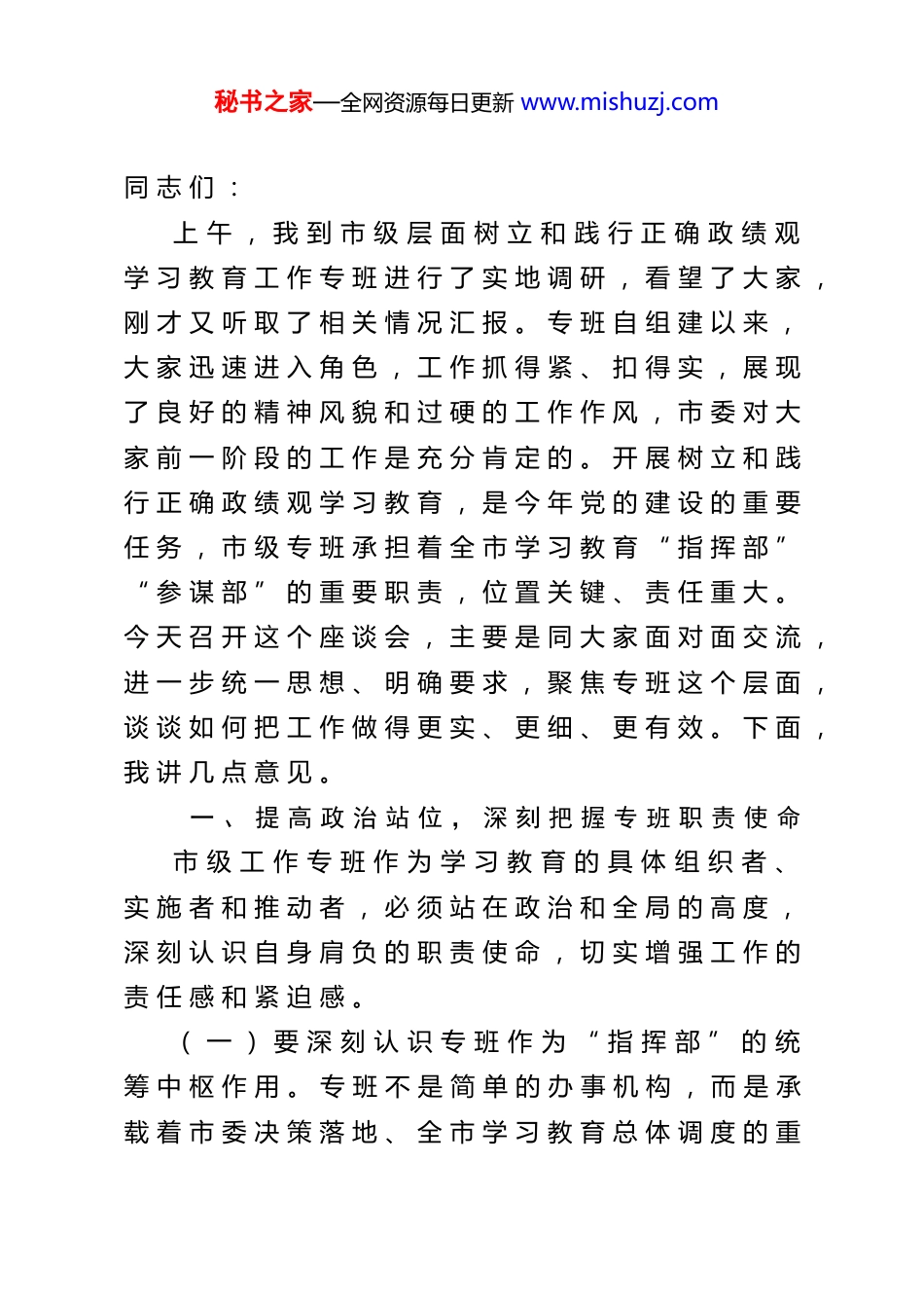 秘书之家—全网资源每日更新 www.mishuzj.com同 志 们 :上 午 , 我 到 市 级 层 面 树 立 和 践 行 正 确 政 绩 观学 习 教 育 工 作 专 班 进 行 了 实 地 调 研 , 看 望 了 大 家 ,刚 才 又 听 取 了 相 关 情 况 汇 报 。 专 班 自 组 建 以 来 ,大 家 迅 速 进 入 角 色 , 工 作 抓 得 紧 、 扣 得 实 , 展 现了 良 好 的 精 神 风 貌 和 过 硬 的 工 作 作 风 , 市 委 对 大家 前 一 阶 段 的 工 作 是 充 分 肯 定 的 。 开 展 树 立 和 践行 正 确 政 绩 观 学 习 教 育 , 是 今 年 党 的 建 设 的 重 要任 务 , 市 级 专 班 承 担 着 全 市 学 习 教 育 “ 指 挥 部 ”“ 参 谋 部 ” 的 重 要 职 责 , 位 置 关 键 、 责 任 重 大 。今 天 召 开 这 个 座 谈 会 , 主 要 是 同 大 家 面 对 面 交 流 ,进 一 步 统 一 思 想 、 明 确 要 求 , 聚 焦 专 班 这 个 层 面 ,谈 谈 如 何 把 工 作 做 得 更 实 、 更 细 、 更 有 效 。 下 面 ,我 讲 几 点 意 见 。一 、 提 高 政 治 站 位 , 深 刻 把 握 专 班 职 责 使 命市 级 工 作 专 班 作 为 学 习 教 育 的 具 体 组 织 者 、实 施 者 和 推 动 者 , 必 须 站 在 政 治 和 全 局 的 高 度 ,深 刻 认 识 自 身 肩 负 的 职 责 使 命 , 切 实 增 强 工 作 的责 任 感 和 紧 迫 感 。( 一 ) 要 深 刻 认 识 专 班 作 为 “ 指 挥 部 ” 的 统筹 中 枢 作 用 。 专 班 不 是 简 单 的 办 事 机 构 , 而 是 承载 着 市 委 决 策 落 地 、 全 市 学 习 教 育 总 体 调 度 的 重秘书之家—全网资源每日更新 www.mishuzj.com任 。 必 须 牢 固 树 立 “ 一 盘 棋 ” 思 想 , 准 确 把 握 中央 和 省 委 的 部 署 要 求 , 精 准 吃 透 政 策 精 神 , 对 全市 学 习 教 育 的 整 体 态 势 、 进 展 成 效 、 存 在 问 题 要做 到 心 中 有 数 。 要 站 在 全 局 高 度 谋 划 工 作 , 确 保各 项 举 措 既 有 针 对 性 又 有 实 效 性 , 防 止 工 作 碎 片化 、 表 面 化 , 真 正 发 挥 好 牵 头 抓 总 、 统 筹 协 调 的中 枢 作 用 。( 二 ) 要 深 刻 认 识 专 班 作 为 “ 参 谋 部 ” 的 智囊 辅 政 作 用 。 专 班 要 成 为 市 委 决 策 的 “ 外 脑 ” 和“ 智 囊 ” , 必 须 具 备 超 前 思 维 和 敏 锐 洞 察 力 。 要善 于 从 政 治 上 观 察 和 处 理 问 题 , 对 标 对 表 习 近 平总 书 记 关 于 树 立 和 践 行 正 确 政 绩 观 的 重 要 论 述 ,紧 紧 围 绕 “ 立 党 为 公 、 为 民 造 福 、 科 学 决 策 、 真抓 实 干 ” 的 总 要 求 , 深 入 开 展 政 策 研 究 和 形 势 分析 。 要 及 时 捕 捉 学 习 教 育 中 的 苗 头 性 、 倾 向 性 问题 , 提 出 具 有 前 瞻 性 、 操 作 性 的 意 见 建 议 , 为 市委 科 学 决 策 提 供 有 力 支 撑 , 确 保 学 习 教 育 始 终 沿着 正 确 方 向 前 进 。( 三 ) 要 深 刻 认 识 专 班 作 为 “ 督 导 队 ” 的 推动 落 实 作 用 。 督 导 检 查 是 推 动 落 实 的 重 要 手 段 。专 班 要 切 实 担 负 起 督 促 指 导 的 责 任 , 坚 持 问 题 导向 , 动 真 碰 硬 , 真 督 实 查...