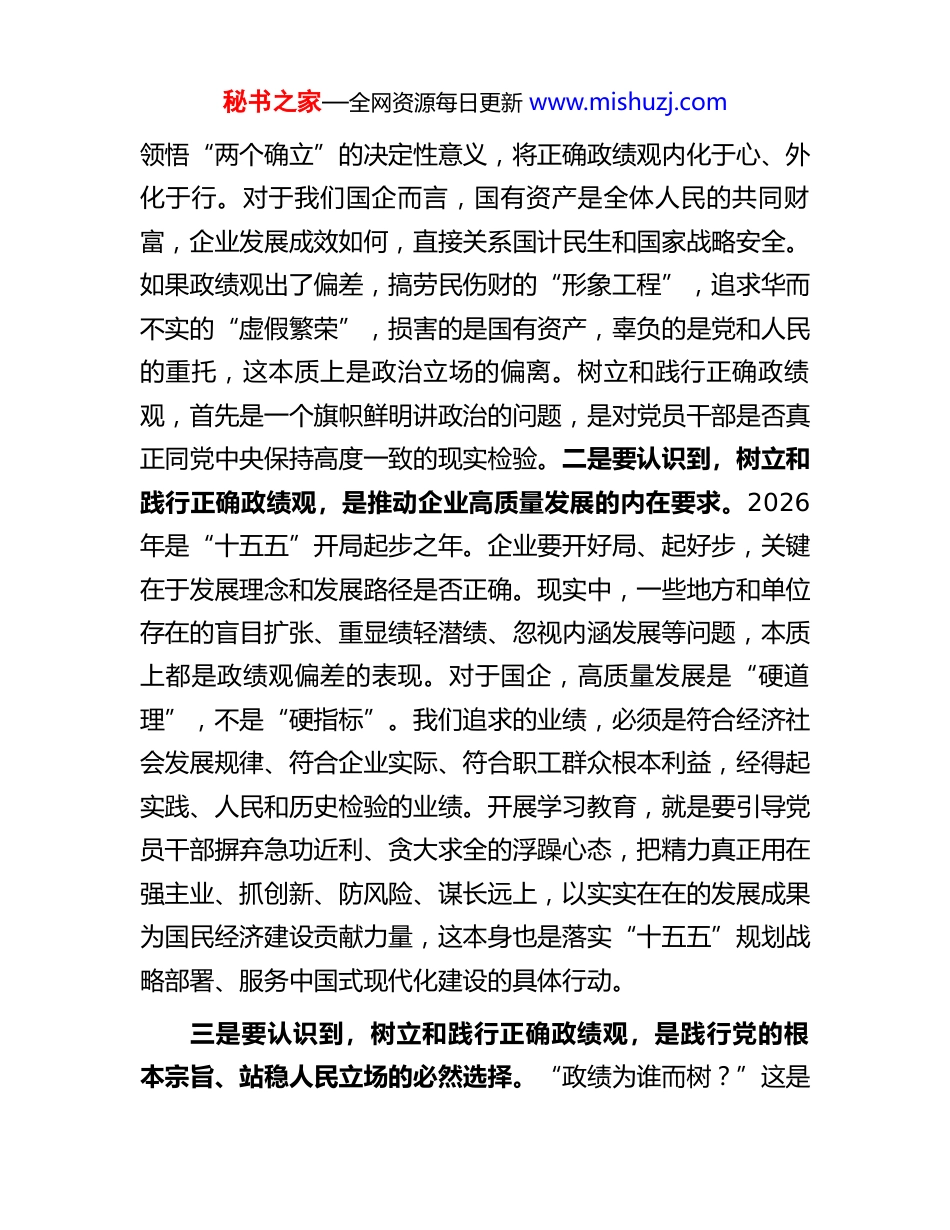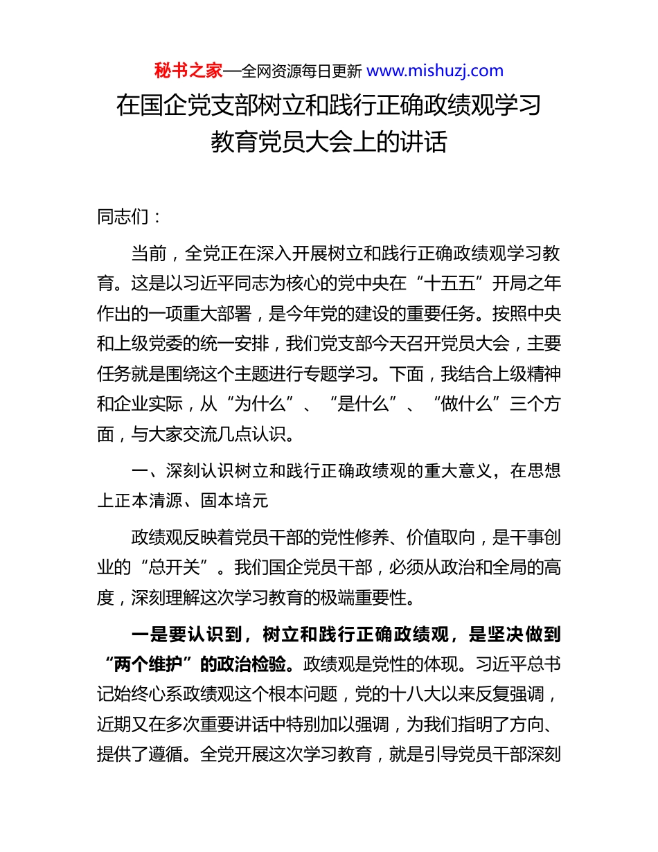秘书之家—全网资源每日更新 www.mishuzj.com在国企党支部树立和践行正确政绩观学习教育党员大会上的讲话同志们:当前,全党正在深入开展树立和践行正确政绩观学习教育。这是以习近平同志为核心的党中央在“十五五”开局之年作出的一项重大部署,是今年党的建设的重要任务。按照中央和上级党委的统一安排,我们党支部今天召开党员大会,主要任务就是围绕这个主题进行专题学习。下面,我结合上级精神和企业实际,从“为什么”、“是什么”、“做什么”三个方面,与大家交流几点认识。一、深刻认识树立和践行正确政绩观的重大意义,在思想上正本清源、固本培元政绩观反映着党员干部的党性修养、价值取向,是干事创业的“总开关”。我们国企党员干部,必须从政治和全局的高度,深刻理解这次学习教育的极端重要性。一是要认识到,树立和践行正确政绩观,是坚决做到“两个维护”的政治检验。政绩观是党性的体现。习近平总书记始终心系政绩观这个根本问题,党的十八大以来反复强调,近期又在多次重要讲话中特别加以强调,为我们指明了方向、提供了遵循。全党开展这次学习教育,就是引导党员干部深刻秘书之家—全网资源每日更新 www.mishuzj.com领悟“两个确立”的决定性意义,将正确政绩观内化于心、外化于行。对于我们国企而言,国有资产是全体人民的共同财富,企业发展成效如何,直接关系国计民生和国家战略安全。如果政绩观出了偏差,搞劳民伤财的“形象工程”,追求华而不实的“虚假繁荣”,损害的是国有资产,辜负的是党和人民的重托,这本质上是政治立场的偏离。树立和践行正确政绩观,首先是一个旗帜鲜明讲政治的问题,是对党员干部是否真正同党中央保持高度一致的现实检验。二是要认识到,树立和践行正确政绩观,是推动企业高质量发展的内在要求。2026年是“十五五”开局起步之年。企业要开好局、起好步,关键在于发展理念和发展路径是否正确。现实中,一些地方和单位存在的盲目扩张、重显绩轻潜绩、忽视内涵发展等问题,本质上都是政绩观偏差的表现。对于国企,高质量发展是“硬道理”,不是“硬指标”。我们追求的业绩,必须是符合经济社会发展规律、符合企业实际、符合职工群众根本利益,经得起实践、人民和历史检验的业绩。开展学习教育,就是要引导党员干部摒弃急功近利、贪大求全的浮躁心态,把精力真正用在强主业、抓创新、防风险、谋长远上,以实实在在的发展成果为国民经济建设贡献力量,这本身也是落实“十五五”规划战略部署、服务中国式现代化建设的具体行动。三是要认识到,树立和践行正确政绩观,是践行党的根本宗旨、站稳人民立场的必然选择。“政绩为谁而树?”这是秘书之家—全网资源每日更新 www.mishuzj.com根本的出发点。我们党没有自己特殊的利益,党的根基在人民、血脉在人民、力量在人民。国企姓“党”,国企的“绩”终究要体现在造福人民上。职工群众是企业的主人翁,他们的急难愁盼问题解决得怎么样,获得感、幸福感、安全感是否充实,是企业一切工作的“晴雨表”。学习教育明确要求坚持开门搞教育,查摆问题听取群众意见,整改整治接受群众监督,检验成效接受群众评判。这昭示我们,真正的政绩在群众口碑里,在实实在在的民生改善中。如果我们眼睛只向上看,搞对上有交代、对下无交代的“政绩工程”,那就是忘记了初心使命,动摇了党的执政根基。必须时刻牢记,为民造福是最大政绩。四是要认识到,树立和践行正确政绩观,是深化全面从严治党、涵养优良政治生态的关键举措。形式主义、官僚主义是党和人民事业的大敌,其根源在于政绩观扭曲。有的干部重部署轻落实,有的热衷于打造“盆景”,有的面对难题绕道走,这些都是政绩观错位的表现。持之以恒推进全面从严治党,必须从思想深处解决“总开关”问题。这次学习教育,与持续深化整治形式主义为基层减负、巩固拓展党内集中学习教育成果一脉相承、有机衔接,旨在从党性根子上纠偏正向,引导党员干部树立和践行正确政绩观,弘扬实事求是、真抓实干的优良作风,营造风清气正、干事创业的良好政治生态。对于企业党组织,这更是锻造忠诚干净担当干部队伍、保障企业行秘书之家—全网资源每日更新 www.mis...