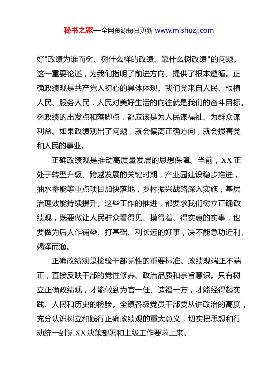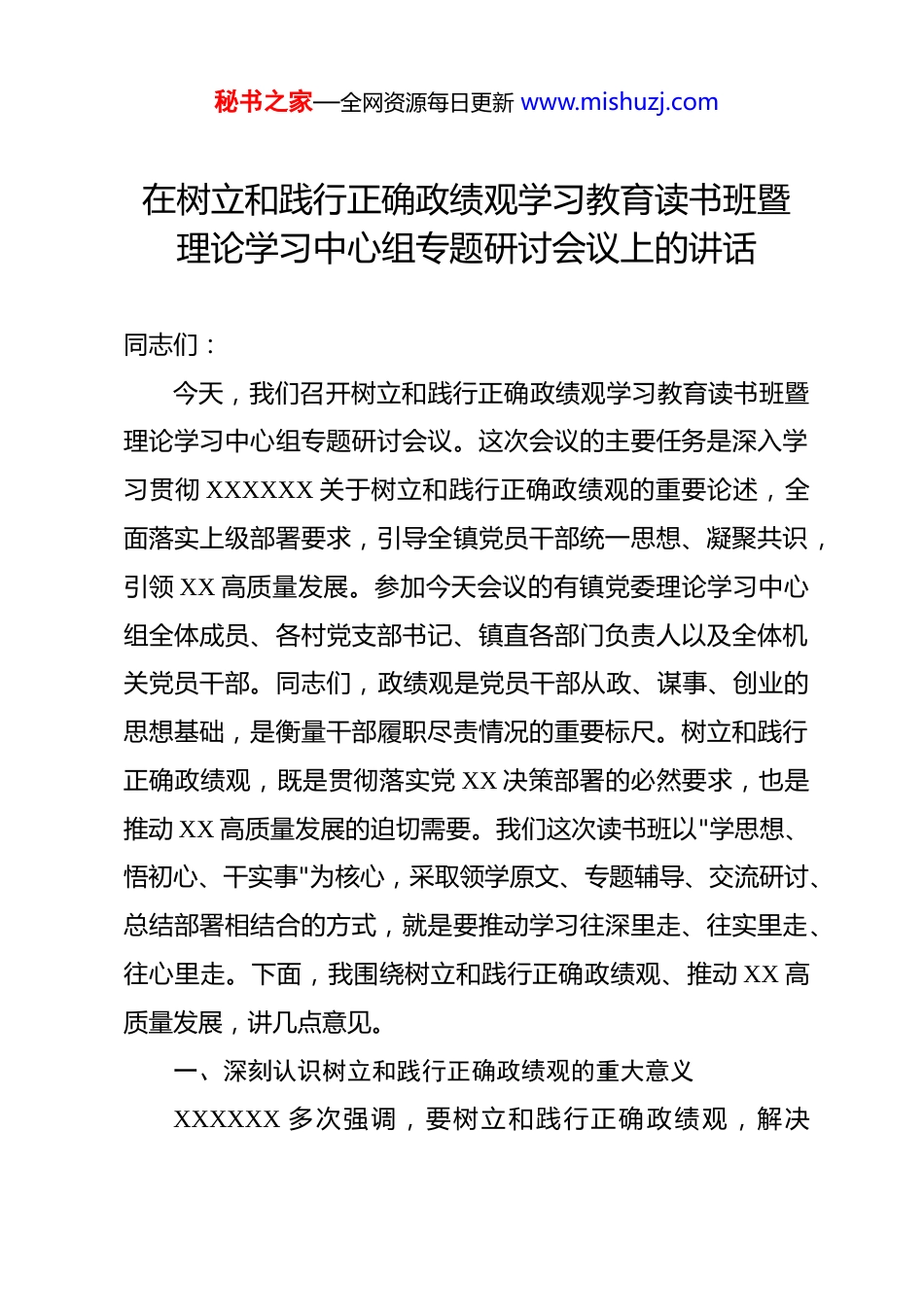 秘书之家—全网资源每日更新 www.mishuzj.com在树立和践行正确政绩观学习教育读书班暨理论学习中心组专题研讨会议上的讲话 同志们:今天,我们召开树立和践行正确政绩观学习教育读书班暨理论学习中心组专题研讨会议。这次会议的主要任务是深入学习贯彻 XXXXXX 关于树立和践行正确政绩观的重要论述,全面落实上级部署要求,引导全镇党员干部统一思想、凝聚共识,引领 XX 高质量发展。参加今天会议的有镇党委理论学习中心组全体成员、各村党支部书记、镇直各部门负责人以及全体机关党员干部。同志们,政绩观是党员干部从政、谋事、创业的思想基础,是衡量干部履职尽责情况的重要标尺。树立和践行正确政绩观,既是贯彻落实党 XX 决策部署的必然要求,也是推动 XX 高质量发展的迫切需要。我们这次读书班以"学思想、悟初心、干实事"为核心,采取领学原文、专题辅导、交流研讨、总结部署相结合的方式,就是要推动学习往深里走、往实里走、往心里走。下面,我围绕树立和践行正确政绩观、推动 XX 高质量发展,讲几点意见。一、深刻认识树立和践行正确政绩观的重大意义XXXXXX 多次强调,要树立和践行正确政绩观,解决秘书之家—全网资源每日更新 www.mishuzj.com好"政绩为谁而树、树什么样的政绩、靠什么树政绩"的问题。这一重要论述,为我们指明了前进方向、提供了根本遵循。正确政绩观是共产党人初心的具体体现。我们党来自人民、根植人民、服务人民,人民对美好生活的向往就是我们的奋斗目标。树政绩的出发点和落脚点,都应该是为人民谋福祉、为群众谋利益。如果政绩观出了问题,就会偏离正确方向,就会损害党和人民的事业。正确政绩观是推动高质量发展的思想保障。当前,XX 正处于转型升级、跨越发展的关键时期,产业园建设稳步推进,抽水蓄能等重点项目加快落地,乡村振兴战略深入实施,基层治理效能持续提升。这些工作的推进,都要求我们树立正确政绩观,既要做让人民群众看得见、摸得着、得实惠的实事,也要做为后人作铺垫、打基础、利长远的好事,决不能急功近利、竭泽而渔。正确政绩观是检验干部党性的重要标准。政绩观端正不端正,直接反映干部的党性修养、政治品质和宗旨意识。只有树立正确政绩观,才能做到为官一任、造福一方,才能经得起实践、人民和历史的检验。全镇各级党员干部要从讲政治的高度,充分认识树立和践行正确政绩观的重大意义,切实把思想和行动统一到党 XX 决策部署和上级工作要求上来。秘书之家—全网资源每日更新 www.mishuzj.com二、准确把握树立和践行正确政绩观的实践要求树立和践行正确政绩观,关键在于落实到具体行动中,体现在工作成效上。我们要从以下几个方面抓好落实。一是要筑牢思想根基,强化理论武装,提升政治能力。理论上的清醒是政治上坚定的前提。全镇党员干部要把学习XXXXXX 关于树立和践行正确政绩观的重要论述作为重要政治任务,坚持读原著、学原文、悟原理,深刻领会其精神实质和实践要求。要结合当前正在开展的主题教育,持续深化理论学习,不断增强政治判断力、政治领悟力、政治执行力。要建立健全学习长效机制,党委理论学习中心组要发挥示范带头作用,各党支部要落实"三会一课"制度,推动理论学习常态化制度化。通过学习,切实解决思想上的模糊认识,破除行动上的障碍阻力,以理论清醒保证政治坚定,以思想自觉引领行动自觉。二是要站稳人民立场,聚焦民生实事,增进民生福祉。政绩好不好,人民群众说了算。我们要始终把人民放在心中最高位置,把群众满意不满意作为检验工作成效的第一标准。在就业方面,要落实就业优先政策,拓宽就业渠道,加强技能培训,促进高校毕业生、农民工、退役军人等重点群体就业创业,确保就业形势总体稳定。在教育方面,要优化教育资源配置,改善办学条件,提升教育教学质量,让每一个孩子都能享受公平秘书之家—全网资源每日更新 www.mishuzj.com而有质量的教育。在医疗方面,要完善基层医疗卫生服务体系,提升医疗服务能力,让群众在家门口就能享受优质医疗服务。在养老方面,要健全养老服务体系,推进养老服务设施建设,让老年人老有所养、老有所依、老有所乐、老有所安。同时,要...