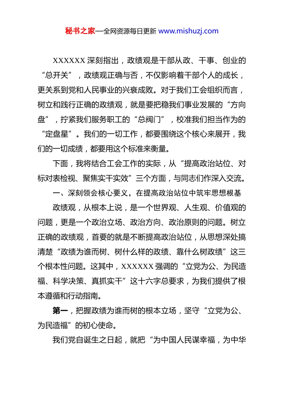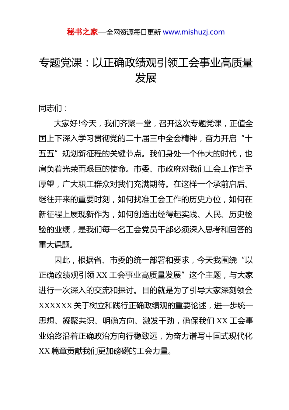 秘书之家—全网资源每日更新 www.mishuzj.com专题党课:以正确政绩观引领工会事业高质量发展 同志们:大家好!今天,我们齐聚一堂,召开这次专题党课,正值全国上下深入学习贯彻党的二十届三中全会精神,奋力开启“十五五”规划新征程的关键节点。我们身处一个伟大的时代,也肩负着光荣而艰巨的使命。市委、市政府对我们工会工作寄予厚望,广大职工群众对我们充满期待。在这样一个承前启后、继往开来的重要时刻,如何找准工会工作的历史方位,如何在新征程上展现新作为,如何创造出经得起实践、人民、历史检验的业绩,是我们每一名工会党员干部必须深入思考和回答的重大课题。因此,根据省、市委的统一部署和要求,今天我围绕“以正确政绩观引领 XX 工会事业高质量发展”这个主题,与大家进行一次深入的交流和探讨。目的就是为了引导大家深刻领会XXXXXX 关于树立和践行正确政绩观的重要论述,进一步统一思想、凝聚共识、明确方向、激发干劲,确保我们 XX 工会事业始终沿着正确政治方向行稳致远,为奋力谱写中国式现代化XX 篇章贡献我们更加磅礴的工会力量。秘书之家—全网资源每日更新 www.mishuzj.comXXXXXX 深刻指出,政绩观是干部从政、干事、创业的“总开关”,政绩观正确与否,不仅影响着干部个人的成长,更关系到党和人民事业的兴衰成败。对于我们工会组织而言,树立和践行正确的政绩观,就是要把稳我们事业发展的“方向盘”,拧紧我们服务职工的“总阀门”,校准我们担当作为的“定盘星”。我们的一切工作,都要围绕这个核心来展开,我们的一切成绩,都要用这个标准来衡量。下面,我将结合工会工作的实际,从“提高政治站位、对标对表检视、聚焦实干实效”三个方面,与同志们作深入交流。一、深刻领会核心要义,在提高政治站位中筑牢思想根基政绩观,从根本上说,是一个世界观、人生观、价值观的问题,更是一个政治立场、政治方向、政治原则的问题。树立正确的政绩观,首要的就是不断提高政治站位,从思想深处搞清楚“政绩为谁而树、树什么样的政绩、靠什么树政绩”这三个根本性问题。这其中,XXXXXX 强调的“立党为公、为民造福、科学决策、真抓实干”这十六字总要求,为我们提供了根本遵循和行动指南。第一,把握政绩为谁而树的根本立场,坚守“立党为公、为民造福”的初心使命。我们党自诞生之日起,就把“为中国人民谋幸福,为中华秘书之家—全网资源每日更新 www.mishuzj.com民族谋复兴”镌刻在了自己的旗帜上。“立党为公”是我们的政治本色,“为民造福”是我们的不懈追求。对于我们工会干部而言,这个“民”就是我们所联系、所服务的亿万职工群众。我们手中的权力、我们所做的工作,都是党和人民赋予的,只能用来为职工群众谋利益、办实事。那么,什么是我们工会工作的最大政绩?是建了多少高楼大厦,还是搞了多少场面热闹的活动?都不是。我以为,我们工会工作的最大政绩,就是 XXX 所说的“为民造福”,具体到我们工作中,就是把解决职工群众的急难愁盼问题作为我们最大的政绩。当一个困难职工家庭因为我们的帮扶而走出困境,脸上露出笑容时;当一名农民工兄弟因为我们的介入而拿回被拖欠的工资,能够安心回家过年时;当一名普通职工通过我们的技能竞赛平台成长为技术能手,实现人生价值时;当职工群众遇到法律纠纷,工会是他们第一个想到、也最信赖的“娘家人”时——同志们,这才是我们工作中最闪亮、最厚重、最值得骄傲的政绩!这样的政绩,不是虚的,不是空的,它有温度、有质感,直接关系到职工群众的获得感、幸福感、安全感,也直接关系到党在职工群众中的执政根基。因此,我们每一位工会干部都必须在内心深处进行一次深刻的灵魂拷问:我们的工作出发点秘书之家—全网资源每日更新 www.mishuzj.com是为了谁?我们的工作成果最终由谁来评判?我们是否真正做到了与职工群众心连心、同呼吸、共命运?只有把这个问题想清楚、弄明白,我们的政绩观才不会偏航,我们的事业才会有牢固的根基。第二,明确政绩怎么样树的实践要求,遵循“科学决策、真抓实干”的科学方法。“为民造福”不是一句口号,它需要我们用科学的方法和务实的作风去实现。这就要求我们...