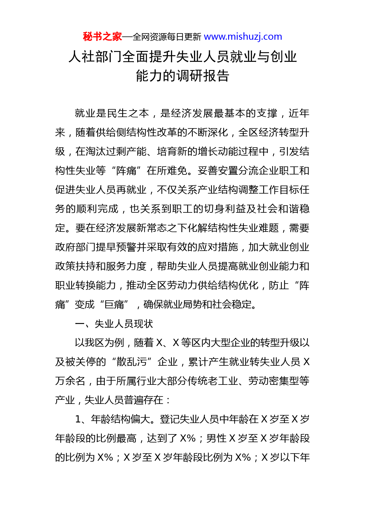 秘书之家—全网资源每日更新www.mishuzj.com人社部门全面提升失业人员就业与创业能力的调研报告就业是民生之本,是经济发展最基本的支撑,近年来,随着供给侧结构性改革的不断深化,全区经济转型升级,在淘汰过剩产能、培育新的增长动能过程中,引发结构性失业等“阵痛”在所难免。妥善安置分流企业职工和促进失业人员再就业,不仅关系产业结构调整工作目标任务的顺利完成,也关系到职工的切身利益及社会和谐稳定。要在经济发展新常态之下化解结构性失业难题,需要政府部门提早预警并采取有效的应对措施,加大就业创业政策扶持和服务力度,帮助失业人员提高就业创业能力和职业转换能力,推动全区劳动力供给结构优化,防止“阵痛”变成“巨痛”,确保就业局势和社会稳定。一、失业人员现状以我区为例,随着X、X等区内大型企业的转型升级以及被关停的“散乱污”企业,累计产生就业转失业人员X万余名,由于所属行业大部分传统老工业、劳动密集型等产业,失业人员普遍存在:1、年龄结构偏大。登记失业人员中年龄在X岁至X岁年龄段的比例最高,达到了X%;男性X岁至X岁年龄段的比例为X%;X岁至X岁年龄段比例为X%;X岁以下年秘书之家—全网资源每日更新www.mishuzj.com龄段比例X%,导致再就业过程中缺乏年龄优势。2、技能素质偏低。由于传统产业的技术装备水平较低,对大多数职工的知识文化、专业技能要求不高,加之职工对提高自身素质的重要性认识不够,不能主动提高自己的技能和知识水平,导致专业技术单一、老化,普遍无法达到一些新兴产业和高技术产业发展的要求,即使有着强烈的就业愿望,也很难在劳动力市场找到相适应的就业岗位3、择业观念成旧。一是受传统观念影响,分流职工要在国营企业工作才算正式工作,而在民营经济、个体经济中从业只是临时工,过去社会上曾流传着这样的顺口溜:“一国有,二集体,不三不四干个体”,这种落后的就业观念使失业人员不太接受灵活就业。二是家庭环境的影响。下岗失业人员大多数为“X”人员,上有老、下有小,家庭负担较重,他们不得不放弃外出打工的机会在家照顾老人和孩子。二、建议与对策“就业是最大的民生”。我们要进一步提高对做好职工安置分流和再就业工作重要性的认识,把思想和行动统一到中央和省、市、区委的决策部署要求上来,切实增强大局意识、责任意识和服务意识,把妥善做好职工分流安置和失业人员再就业工作作为保障和改善民生的一项重要工作来抓,坚持总量与结构并重、供需两端发力、就业政策秘书之家—全网资源每日更新www.mishuzj.com与宏观政策协调、统筹发挥市场与政府作用、普惠性与差别化相结合的基本原则,进一步促进就业鼓励创业,以稳就业惠民生助推全区发展。(一)坚持实施就业优先战略要切实贯彻劳动者自主就业、市场调节就业、政府促进就业和鼓励创业的方针,实施就业优先战略和更加积极的就业政策。在调结构、稳增长的同时,应进一步强化政府促进就业的责任,健全完善失业人员再就业和创业的长效机制,加大“X”人员、“零就业家庭”成员、困难家庭成员、被征地农民等就业困难人员的帮扶力度,确保“零就业家庭”动态消除,同时通过调整和优化产业结构、着力发展吸纳就业能力强的第三产业,实现经济增长和扩大就业的良性互动发展,不断促进经济的长期健康可持续发展。(二)加大就业失业动态监测健全就业和失业监测报告制度,密切关注辖区内各类企业从业人员及外出务工人员的就业失业状况,重点监测企业关闭破产情况、企业职工失业情况以及返乡农民工数量等优化监测企业样本结构,有计划地把产业结构调整涉及企业纳入监测范围,提高监测数据质量和分析利用水平,对涉及职工人数多、安置分流任务重、稳定压力大的行业、企业,实施重点监控,为预防规模性失业提供预秘书之家—全网资源每日更新www.mishuzj.com警。(三)加大宣传强化就业引导一是加强就业相关法律法规及各项再就业优惠政策的宣传力度,尤其应加强下岗失业人员的普法教育,以更好保障劳动者享有平等就业的权利。二是积极引导企业分流职工重塑就业思维,树立“有劳动收入就视为就业”的新理念,抓住新行业、新业态的蓬勃涌现,鼓励下岗失业人员自谋职业和自主创业。(四)加强服务落实扶持政策一是全面落实就业技能培训、职业介绍服务、企业吸纳就业、劳务输出转移就业、公益岗位安置就业和自主创业、灵活就业、自主择业等方面的优惠政策和专项补贴,充分发挥政策激励作用,鼓励和促进中小企业、民营经济及各种服务业加快发展,吸纳城乡劳动力。二是进一步完善人力资源市场公共就业服务功能,做好人力资源供求监测分析和用工调控工作。依托区人力资源市场和乡镇(街道)、村(社区)就业和社会保障服务平台,挖掘民营企业、工业园区以及村(社区)就业岗位,为失业人员、返乡农民工、高校毕业生、城镇零就业家庭、农村低保家庭劳动力、被征地农民等群体开展主题招聘活动和发布就业岗位。三是相关部门要切实转变职能,简化有关手续,提高秘书之家—全网资源每日更新www.mishuzj.com服务效率。积极与银行、工商、税务等部门协调、配合,建立下岗失业人员再就业优惠政策的监督机制,做好失业保险基金支持企业稳岗补贴、吸纳就业困难人员社