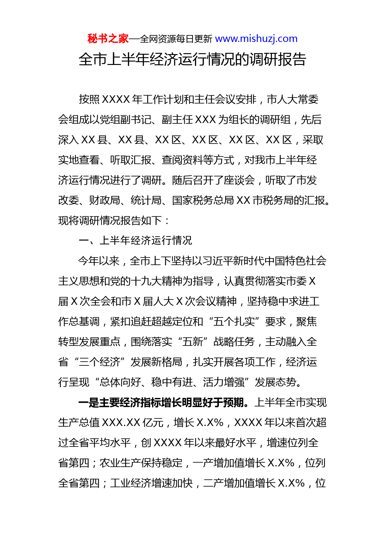 秘书之家—全网资源每日更新www.mishuzj.com全市上半年经济运行情况的调研报告按照XXXX年工作计划和主任会议安排,市人大常委会组成以党组副书记、副主任XXX为组长的调研组,先后深入XX县、XX县、XX区、XX区、XX区、XX区,采取实地查看、听取汇报、查阅资料等方式,对我市上半年经济运行情况进行了调研。随后召开了座谈会,听取了市发改委、财政局、统计局、国家税务总局XX市税务局的汇报。现将调研情况报告如下:一、上半年经济运行情况今年以来,全市上下坚持以习近平新时代中国特色社会主义思想和党的十九大精神为指导,认真贯彻落实市委X届X次全会和市X届人大X次会议精神,坚持稳中求进工作总基调,紧扣追赶超越定位和“五个扎实”要求,聚焦转型发展重点,围绕落实“五新”战略任务,主动融入全省“三个经济”发展新格局,扎实开展各项工作,经济运行呈现“总体向好、稳中有进、活力增强”发展态势。一是主要经济指标增长明显好于预期。上半年全市实现生产总值XXX.XX亿元,增长X.X%,XXXX年以来首次超过全省平均水平,创XXXX年以来最好水平,增速位列全省第四;农业生产保持稳定,一产增加值增长X.X%,位列全省第四;工业经济增速加快,二产增加值增长X.X%,位秘书之家—全网资源每日更新www.mishuzj.com列全省第四,创X年来最好水平;服务业平稳增长,三产增加值增长X.X%,位列全省第六。主要经济指标实现时间任务“双过半”目标。二是转型发展取得实质性突破。XX县油煤气资源综合利用项目正式试车,大唐热电联产双机双投,金风发电机组装备制造、兴业调光玻璃建成投产,彩虹光伏玻璃顺利点火,XX轻烃综合利用项目即将建成。航空煤油产量增长XX.X%,XX卷烟产量平稳增长。新的经济增长点加速形成,XX家新经济企业注册落地,累计达到XXX家。大力推进苹果产业后整理,建成智能选果线XX条、冷气库X.X万吨、苹果专卖店XX个。“XX苹果”“梁家河苹果”品牌标准正式发布,形成了XX苹果三大品牌。红色旅游持续升温,来延游客、旅游综合收入分别增长XX.X%和XX.X%。非能工业增加值增长XX.X%,同比提XXX.X个百分点。三是重大项目加快实施。全市XXX个重点项目开复工率达到XX%,创近年新高,完成投资XXX亿元,占年计划的XX.X%.固定资产投资增长X.X%,其中制造业、采矿业实现两位数增长。民间投资增长XX.X%,房地产开发投资增长X.X倍。XX新机场顺利通过投产校飞,延大新校区、棚户区改造、延河综合治理、黄河引水、X条通县高速公路加快推进。四是重点领域改革不断深入。完成XX户国企改制任务,秘书之家—全网资源每日更新www.mishuzj.com并实现国有资产移交统一运营管理。水务一体化、国有林场、农村产权制度及“三变”改革不断向纵深推进。“电子社保卡”实现移动支付。城区城市管理执法体制改革基本完成。工程建设项目审批制度改革国家试点、首批国家守信激励创新试点城市和XX、XXX、南泥湾开发区管理体制改革加快推进,预决算公开、预算绩效管理改革不断深化。五是财政预算执行情况良好。上半年全市地方财政收入完成XX.X亿元,增长XX.X%,高于全省各市区平均增幅X.X个百分点,位居全省第二;全市财政支出完成XXX.XX亿元,增长XX.X%.市本级地方财政收入完成XX.XX亿元,增长X.X%;市本级财政支出XX.XX亿元,增长XX.X%.六是民生保障水平不断提升。举全市之力抓精准脱贫,“八个一批”脱贫工程取得阶段性成果。计划脱贫人口实现产业全覆盖,农村道路硬化、安全饮水提升、光伏扶贫加快实施。“民生十件实事”加快落实,XX所中小学、幼儿园开工建设。保障性住房建设走在全省前列,信访和农村人居环境综合整治工作局全省第一。深入践行“绿水青山就是金山银山”理念,基本消除主要河流劣V类水质,生态环境保护力度持续加大。二、经济运行中存在的主要问题一是转型发展任务依然繁重。虽然全市上半年主要经济秘书之家—全网资源每日更新www.mishuzj.com指标增长明显好于预期,经济发展初步显现出结构优化、动能转换、活力增强、新经济新业态逐渐发挥支撑作用的态势,但必须清醒看到,实现高质量持续发展的基础还很不稳固,现代经济体系建设中新兴产业和现代服务业仍处于较低发展水平,短期内对经济增长的拉动支撑作用还十分有限,能源工业产品产量增加特别是油煤价格上涨仍然是拉动全市经济增长的主导因素,全市经济要彻底摆脱油煤路径依赖、形成多点多业支撑的合理结构依然任重道远。二是三大战役攻坚任务艰巨。脱贫攻坚还不精准、不扎实,农村基础设施“三提升”仍有部分县不达标,贫困村集体经济底子薄、规模小,贫困户长效产业短期内难以见效,X月底前完成年度脱贫任务还需付出更大努力。生态环境依然脆弱,延河等主要河流水污染被动局面还未彻底扭转。政府债务特别是隐性债务风险不容忽视,政府债务管理需要强化。三是完成全年固定资产投资增长目标压力较大。上半年全市在建项目、新开工项目和计划投资明显减少,下半年缺乏新的大项目、好项目接续。招商引资项目谋划储备不充分、前期工作不扎实,落地少、推进慢。受国家棚改贷款政策调整和严控债务风险等因素影响,重点项目融资难度进一步加大,完成全年固定资产投资XXXX亿元、增长XX%的目标难度依然较大。秘书之家—全网资源每日更新www.mishuzj.com四是农业增产和农民