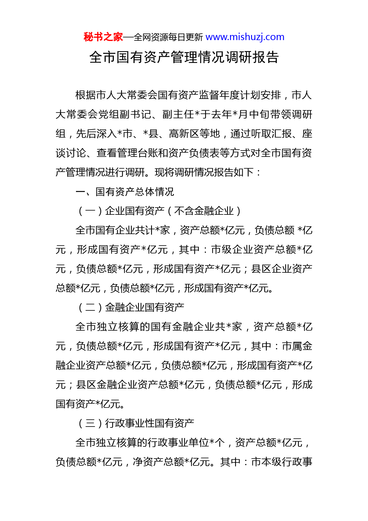 秘书之家—全网资源每日更新www.mishuzj.com全市国有资产管理情况调研报告根据市人大常委会国有资产监督年度计划安排,市人大常委会党组副书记、副主任于去年月中旬带领调研组,先后深入市、县、高新区等地,通过听取汇报、座谈讨论、查看管理台账和资产负债表等方式对全市国有资产管理情况进行调研。现将调研情况报告如下:一、国有资产总体情况(一)企业国有资产(不含金融企业)全市国有企业共计家,资产总额亿元,负债总额亿元,形成国有资产亿元,其中:市级企业资产总额亿元,负债总额亿元,形成国有资产亿元;县区企业资产总额亿元,负债总额亿元,形成国有资产亿元。(二)金融企业国有资产全市独立核算的国有金融企业共家,资产总额亿元,负债总额亿元,形成国有资产亿元,其中:市属金融企业资产总额亿元,负债总额亿元,形成国有资产亿元;县区金融企业资产总额亿元,负债总额亿元,形成国有资产亿元。(三)行政事业性国有资产全市独立核算的行政事业单位个,资产总额亿元,负债总额亿元,净资产总额亿元。其中:市本级行政事秘书之家—全网资源每日更新www.mishuzj.com业单位个,资产总额亿元,负债总额亿元,净资产总额亿元;县区行政事业单位个,资产总额亿元,负债总额亿元,净资产总额亿元。全市公共基础设施等行政事业性国有资产总额亿元,其中:公共基础设施(主要是公路、机场、航道、水库等)亿元;市政基础设施(主要是园林绿化、地下管网、供水供气供热等)亿元;政府储备物资亿元;保障性住房亿元;受托代理资产亿元;其他资产亿元;全市文物万件。(四)国有自然资源资产全市总土地面积万亩,其中:农用地万亩,建设用地万亩,未利用地万亩。全市林地面积万亩,占国土面积的%。全市矿产资源有石油、天然气、煤炭、页岩气等种,其中:石油储量亿吨,煤炭储量亿吨,天然气储量亿立方米,紫砂陶土储量多万吨。全市水资源总量亿立方米。二、国有资产管理总体情况市政府贯彻落实国有资产管理情况向人大报告制度,加强国有资产管理制度机制建设,加大国有资产底数摸排统计力度,推进国有资产规范化管理,狠抓生态环境保护,提升管理信息化水平,提高国有资产使用效率,增强管理公开透明度,国有资产治理体系和治理能力现代化水平不断提高。秘书之家—全网资源每日更新www.mishuzj.com(一)优化国有资本布局,深入推进国资国企改革市属经营性国有资产集中统一监管和重组整合加快推进,混改、股改继续深化,剥离企业办社会职能取得显著成效。家集团公司全部控制在三级以内,“一企一策”制定压减方案,对“+”户市属国有企业实行脱钩改革。制定《市属国有企业工资总额管理办法》《进一步推进市属国有企业薪酬制度改革的指导意见》,企业薪酬制度改革稳步推进。按月对企业融资、还本付息等情况摸底,每季度末对企业重大财务风险隐患进行排查,风险预警机制和融资担保动态管理持续强化,企业风险防控能力不断提高。(二)提高风险管控水平,发挥金融服务实体作用国有金融企业改革有序推进,企业运营效益明显改善,金融企业市场竞争力和抗风险能力进一步提升。财政部门集中统一履行国有金融资本出资人职责深入推进,国有金融企业逐步纳入产权登记管理系统和绩效评价体系,各级财政部门及金融机构国有金融资本产权登记工作主体责任进一步明确。通过财务快报、专项汇报、财务决算等手段,加强国有金融企业各项指标监测分析,国有金融资产监管不断强化。出台应对疫情支持中小企业发展金融方面扶持政策,控制担保费率不超过%,构建政银企复工复产对接平台,企业融资成本进一步降低,金融服务实体经秘书之家—全网资源每日更新www.mishuzj.com济能力持续增强。(三)促进资产合理配置,规范行政事业性国有资产管理出台《市行政事业单位国有资产管理实施办法》,全市行政事业单位国有资产清查取得实效。印发《市级行政事业单位经营性资产集中统一管理实施办法》,将市级行政事业单位管理的各类经营性资产统一移交市国资中心集中监管。在建工程转固和公共基础设施入账工作深入推进,固定资产条码化管理持续加强,管理信息化水平稳步提升,资产管理基础不断强化。对超标配置、低效运转或长期闲置资产在不同部门和单位之间调剂、共享使用,对老城区闲置政府公寓楼、干部周转房和涉案资产通过公共资源交易平台实行公开拍卖。减免中小企业房租政策落实有力,对承租行政事业单位房屋的中小企业给予个月房租减免,共计万元。(四)强化自然资源保护,推动自然资源高效能管理一是加强土地资源管理。结合新一轮土地利用总体规划试点,有序推进国土空间规划体系重构,“城市双修双改”不断加强,城市环境持续改善。国土“三调”工作扎实推进,全市全民所有自然资源资产清查深入开展。统筹安排项目用地,推动重点项目及时落地,年全市共完成国有土地供应宗万亩,出让宗亩、成交价款亿元。二是秘书之家—全网资源每日更新www.mishuzj.com规范矿产资源管理。制定《延安市自然资源领域矿产资源管理制度》,矿业开发布局持续优化,矿产资源用途管控不断加强。废弃矿山拉网式地质环境综合调查深入开展,废弃矿山生态修复持续加强,先后创建绿色矿山个,矿产资源开发与保护协调发展、同频共振新格局初步形成。三是强