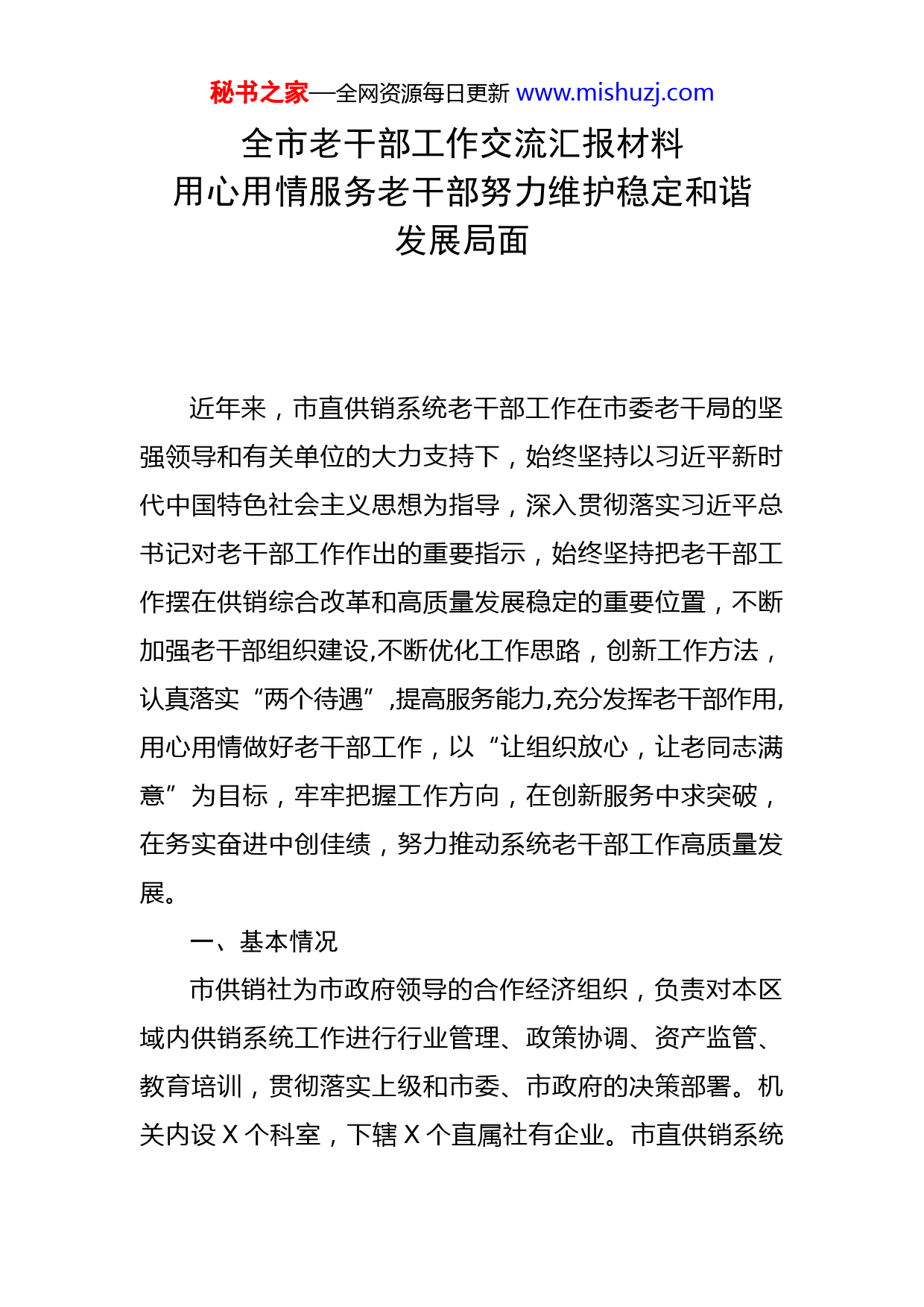 秘书之家—全网资源每日更新www.mishuzj.com全市老干部工作交流汇报材料用心用情服务老干部努力维护稳定和谐发展局面近年来,市直供销系统老干部工作在市委老干局的坚强领导和有关单位的大力支持下,始终坚持以习近平新时代中国特色社会主义思想为指导,深入贯彻落实习近平总书记对老干部工作作出的重要指示,始终坚持把老干部工作摆在供销综合改革和高质量发展稳定的重要位置,不断加强老干部组织建设,不断优化工作思路,创新工作方法,认真落实“两个待遇”,提高服务能力,充分发挥老干部作用,用心用情做好老干部工作,以“让组织放心,让老同志满意”为目标,牢牢把握工作方向,在创新服务中求突破,在务实奋进中创佳绩,努力推动系统老干部工作高质量发展。一、基本情况市供销社为市政府领导的合作经济组织,负责对本区域内供销系统工作进行行业管理、政策协调、资产监管、教育培训,贯彻落实上级和市委、市政府的决策部署。机关内设X个科室,下辖X个直属社有企业。市直供销系统秘书之家—全网资源每日更新www.mishuzj.com共有干部职工X人,在职人员X人(其中,直属社有企业有在职人员X人、机关干部X人)、离退休人员X人(其中,机关离退休X人、企业离退休X人)。离休干部X人。离退休占X%;现有各级党组织X个(X个直属机关党委、X个党总支、X个党支部),X个党支部中X个为在职党支部、X个为离退休党支部,现有党员X名,其中:在职党员X名,X名离退休党员(机关离退休党员X人,X个社有企业离退休党员X人)。离退休党员占X%。二、主要做法老干部党执政兴国的重要资源,是党和国家的宝贵财富,是推进中国特色社会主义伟大事业的重要力量,做好市直供销系统老干部工作,对于维护系统供销综合改革稳定局面,推进新时代供销事业高质量发展有着十分重要的意义。1、加强党的建设。按照新时代党的建设总要求,坚持把政治建设摆在老干部工作的首位,着力引导教育广大离退休干部增强“四个意识”、坚定“四个自信”、做到“两个维护”,旗帜鲜明讲政治。坚持把老干部工作列入党建工作重要内容,统一安排、统一检查、统一考核,切实推进老干部工作政治思想建设、组织建设、队伍建设和作风建设、不断提升组织凝聚力。牢固树立党的一切工作到支部的鲜明导向,按照有利于老干部学习教育、服务管秘书之家—全网资源每日更新www.mishuzj.com理、发挥作用的原则,在组织设置上,考虑到老干部们年龄普遍偏大、居住分散、行动不便的客观原因,安排在职年轻同志担任委员和兼职工作人员,协助老干支部共同做好管理服务工作。采取单独建、联合建、进社区、优化设置单独离退休干部党支部X个,混合离退休合党支部X个。选配X名“党性强、威信高、经验丰富、乐于奉献”的老党员和X名在职党员担任党支部书记,老干部活动阵地为所有离退休人员开放,从组织上、阵地上实现集中服务管理。为方便联系开展工作,每个支部还明确X名在职人员开展日常联系服务,积极做好学习教育、组织生活、党费收缴、关爱帮扶等服务保障工作,确保老同志学习、活动、作用发挥、组织生活和工作开展正常。近年来,先后有X个退休支部被评定为X星级支部、X个退休支部评定为X星级支部。先后对X名符合条件的党员颁发了“光荣在党50年”纪念章,党员荣誉感和使命感得到增强。X名离休干部的体会文章被省供销社《关于X的调研报告》收录编印入册。退休干部X、X、X等多名老同志被评为优秀共产党员、X抗洪抢险典型和“X好人”。2、引导发挥作用。结合社区共筑共建,组织引导老干部积极参与所在社区创文和城市建设工作,在老旧小区选配德高望重、乐于服务的老干部负责小区自管委员会工作,着力打造自我服务、共建文明城市老干部工作品牌,秘书之家—全网资源每日更新www.mishuzj.com多名老干部量力而行,积极参与乡村振兴、帮教关爱、环境美化和社区志愿服务活动,得到社区的高度评价。X、X等老党员积极参与我市有关社团活动,常年组织开展文化下乡、文艺演出、诗词朗诵等大型活动。2022年,X担任X职务的X学社利用各种方式开展“抗疫朗诵会”“戏台搭在馆门口”“清明祭先烈崇德X行”“巾帼心向党喜迎二十大”“朗诵艺术的语言发声辅导学习”“戏曲进乡村文化润民心”“欢庆二十大永远跟党走”等“线上+线下”活动X次,成为本系统乃至全市老干部发挥作用的典型。3、创新服务管理。结合实际,在服务管理上创新建立上门送学习、送宣传、送温暖《上门三送制度》,定期安排年轻党员给他们送去学习资料,在老干部家中辅导学习,与他们共同学习,宣传宣讲党的理论政策,切实解决老干部学习教育引导中的具体问题。每逢春节、建党节、重阳节都按规定看望慰问老干部,使老干部们深感温暖,倍感亲切。老干部们说“原以为人走茶凉,单位不再管了,现在看来你们年轻一代没有忘记我们呀!”围绕生活待遇落实,着力解决X公司军转干部待遇问题,帮助多名老干部解决生活具体问题。经过深入细致的思想工作,解释做好企业老干部待遇诉求问题,均收到良好效果。常态化“上门三送”既在服务中促进了管理,又融洽了感情、落实了工作,更能通过面对面交流随时发现掌握老干部的思想动态和实际问题,秘书之家—全网资源每日更新www.mishuzj.com成为面对老系统老干
