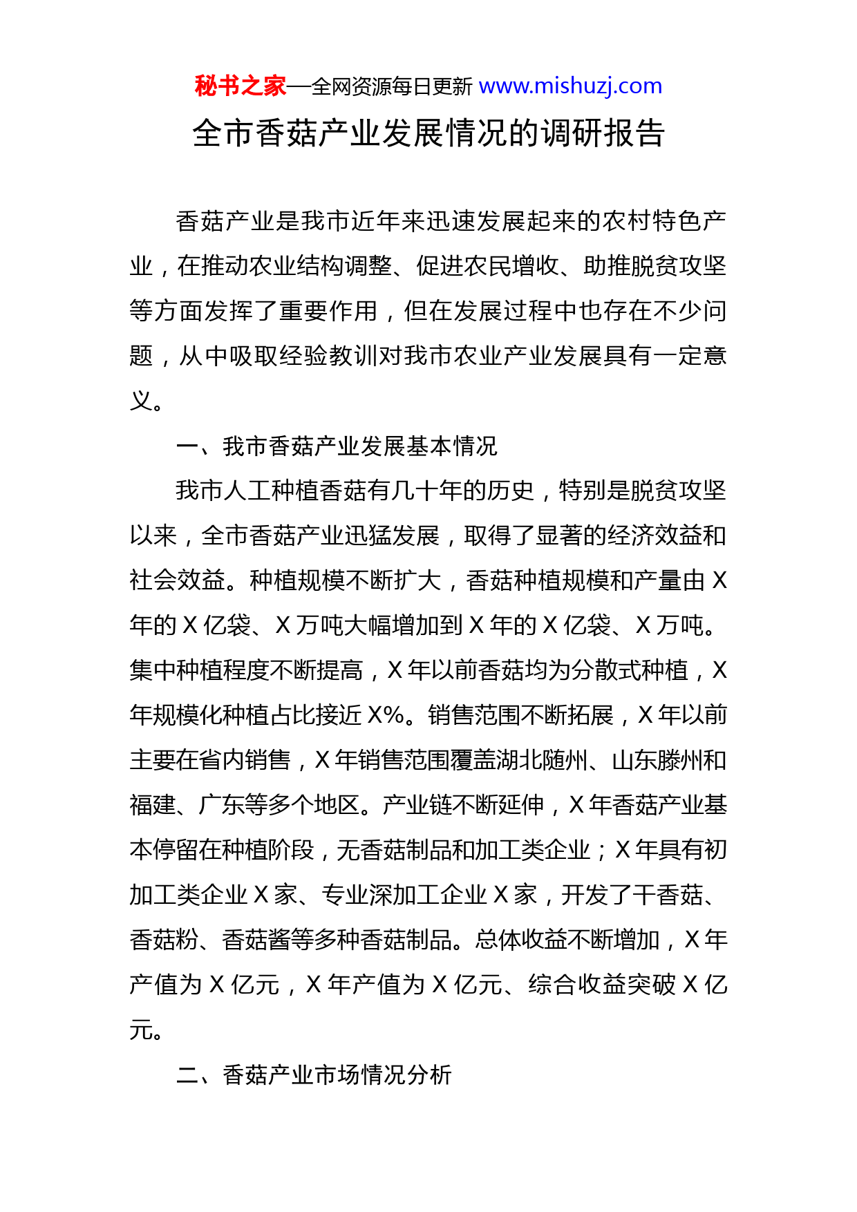 秘书之家—全网资源每日更新www.mishuzj.com全市香菇产业发展情况的调研报告香菇产业是我市近年来迅速发展起来的农村特色产业,在推动农业结构调整、促进农民增收、助推脱贫攻坚等方面发挥了重要作用,但在发展过程中也存在不少问题,从中吸取经验教训对我市农业产业发展具有一定意义。一、我市香菇产业发展基本情况我市人工种植香菇有几十年的历史,特别是脱贫攻坚以来,全市香菇产业迅猛发展,取得了显著的经济效益和社会效益。种植规模不断扩大,香菇种植规模和产量由X年的X亿袋、X万吨大幅增加到X年的X亿袋、X万吨。集中种植程度不断提高,X年以前香菇均为分散式种植,X年规模化种植占比接近X%。销售范围不断拓展,X年以前主要在省内销售,X年销售范围覆盖湖北随州、山东滕州和福建、广东等多个地区。产业链不断延伸,X年香菇产业基本停留在种植阶段,无香菇制品和加工类企业;X年具有初加工类企业X家、专业深加工企业X家,开发了干香菇、香菇粉、香菇酱等多种香菇制品。总体收益不断增加,X年产值为X亿元,X年产值为X亿元、综合收益突破X亿元。二、香菇产业市场情况分析秘书之家—全网资源每日更新www.mishuzj.com香菇是我国生产区域最广、总产量最高、影响最大的食用菌产品。由于投资少、见效快,香菇产业被作为助力脱贫攻坚的重要产业,近几年全国刮起了“香菇风”。据不完全统计,在X个国家级贫困县中,近X%选择种植香菇,产业呈现“快增长”趋势。产业规模迅速扩大。香菇种植区域遍布全国,形成了以河北、辽宁及贵州为主的夏菇产区和以福建、浙江、河南、湖北、陕西为主的冬菇产区,根据X年X月中国食用菌协会发布数据测算,X—X年产量年均增速约为X%,X年达到X万吨,占食用菌产量近X%,占全球香菇总产量的X%以上,产值超过X亿元,相关从业人员超过X万人。利润空间大幅缩减。从X和X年数据看,各类生产要素成本不断上涨,菌棒成本增加近X%,土地租金成本增加约X%,人工成本增加X%以上;销售价格逐年下降,鲜菇价格下跌近X%,干菇价格下跌约X%,净利润下降X%以上。河南省作为全国香菇种植第一大省,产量占全国X%。省内香菇种植以X西、X西南、X南为主,X市、洛阳市、三门峡市、驻马店市年产量占比达X%以上。近年来,X、X、X等地多措并举推动香菇产业发展,在全省甚至全国香菇市场上形成了相对优势。比如,X县建立了全国最大的香菇集散地,成为全国干香菇的价格形成中心和出口货源集散中心。X县建立香菇生产的规范技术体系,香菇标准化生产率超过X%;引进河南信念集团、秘书之家—全网资源每日更新www.mishuzj.com金海生物等香菇生产龙头企业,建设香菇精深加工产业园,拉长了香菇生产加工产业链。X县联合科研中心等推动主栽品种优化升级,推进核心技术示范基地建设,形成了集研发、生产、加工、国际国内贸易为一体的全链条产业集群。相较而言,我市香菇产业还停留在较为初级的发展阶段,竞争优势不够明显。三、我市香菇产业发展存在的问题及建议(一)市场感知不敏锐。虽然我市南部山区适宜发展香菇产业,但各县所选主要菌种与周边地市完全一致,同质化严重。调研发现,部分县区对市场行情变化、产业竞争日益激烈等情况缺乏敏感性,风险意识不强,应对方法单一,有的试图通过进一步扩大生产规模来提高产值,存在滞销和恶性循环的隐患。建议:一是统筹规划全市香菇产业发展,合理控制香菇种植规模。二是引导各地加快调整优化食用菌产业结构,大力探索夏季食用菌生产模式,逐步发展羊肚菌、赤松茸等经济效益好、市场潜力大的新品种,实现错峰错季上市和错位发展。(二)种植方式不先进。我市香菇生产方式仍以传统一家一户分散生产方式为主,虽然在菌棒制作、杂菌灭杀、菌种接种等前期环节实行统一管理,但香菇生长、采摘等环节由菇农操作管理,标准化程度较低,影响了香菇的产量。经初步测算,一个普通香菇菌棒产量应在X—X斤秘书之家—全网资源每日更新www.mishuzj.com左右,但实际产量平均下降X%左右,有的甚至不足X斤。建议:进一步建立健全服务体系,充分发挥龙头企业、行业协会作用,为菇农提供生产资料供应(菌种、原辅材料)、技术培训和指导、产品加工销售等服务,推动香菇种植从“零散粗放”向“集约化专业化”转变。(三)产业链条不够长。我市香菇产业链现代化水平较低,向上下游延伸的空间较大。菌种研发落后。我市香菇菌种可分为自有和进口X类,自有菌种一般为天然形成,品种相对老化,出菇量低、约为进口的X%,菌种研发技术落后,进口菌种没有知识产权,不掌握核心技术,存在“卡脖子”风险。加工能力不强。我市从事香菇加工的企业共X家,多数停留在分拣、烘干、密封包装等初级加工阶段,精深加工发展滞后,产品附加值低。交易市场缺失。我市香菇约X%以鲜菇的形式自销或供应周边地区,剩余香菇烘干后外销,其中约X%运送至XX县的香菇市场销售,没有市场定价权,销售价格上不去。建议:一是加强菌种研发培育,与中国农科院、河南农科院、华中农业大学等国内知名菌种研发机构深度合作,开展技术攻关,培育更多优质菌种,着力打破国外技术垄断。二是提高精深加工能力,支持引导已有企业改造升级,培育引进农业龙头企业,发展香菇酱、香菇提取液、香菇休闲食品等精深加工食品,持续提升产品附