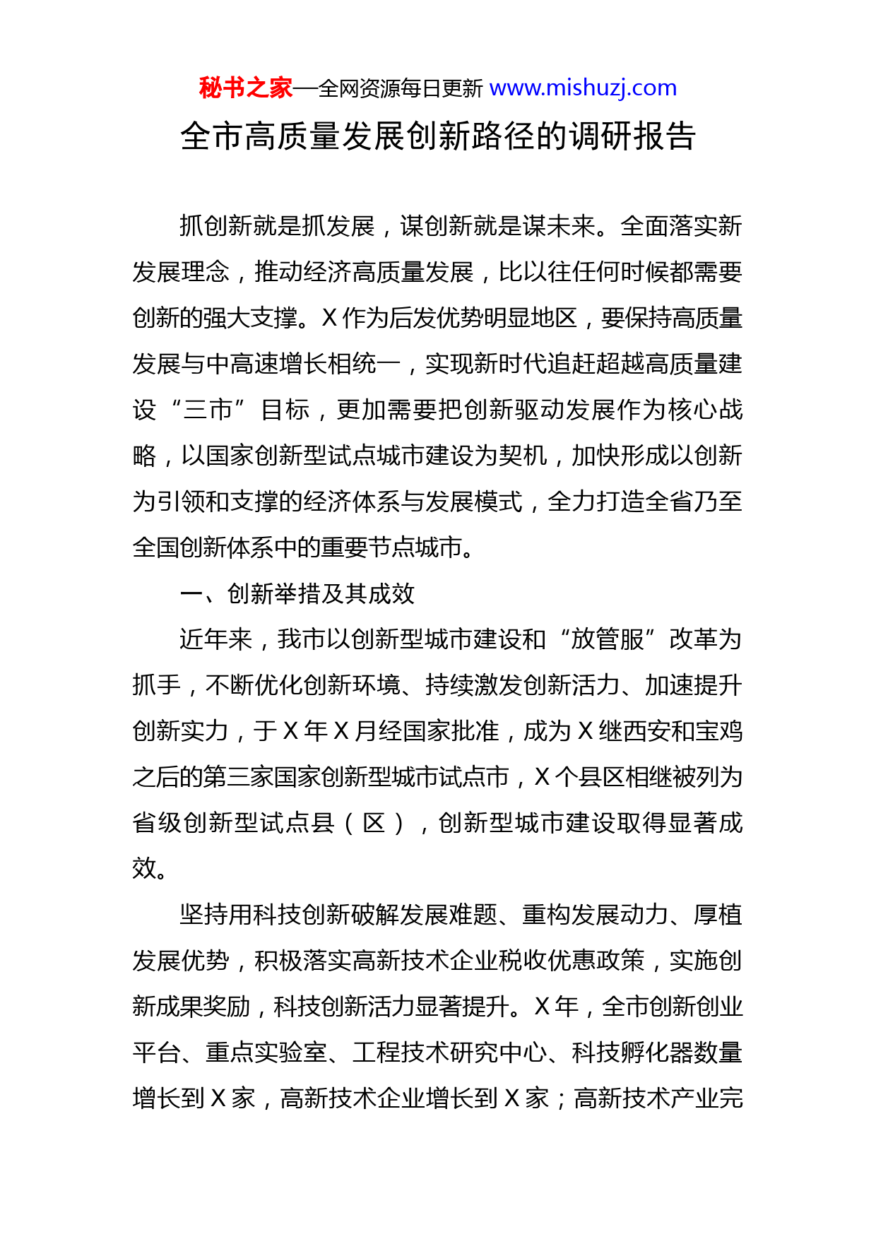 秘书之家—全网资源每日更新www.mishuzj.com全市高质量发展创新路径的调研报告抓创新就是抓发展,谋创新就是谋未来。全面落实新发展理念,推动经济高质量发展,比以往任何时候都需要创新的强大支撑。X作为后发优势明显地区,要保持高质量发展与中高速增长相统一,实现新时代追赶超越高质量建设“三市”目标,更加需要把创新驱动发展作为核心战略,以国家创新型试点城市建设为契机,加快形成以创新为引领和支撑的经济体系与发展模式,全力打造全省乃至全国创新体系中的重要节点城市。一、创新举措及其成效近年来,我市以创新型城市建设和“放管服”改革为抓手,不断优化创新环境、持续激发创新活力、加速提升创新实力,于X年X月经国家批准,成为X继西安和宝鸡之后的第三家国家创新型城市试点市,X个县区相继被列为省级创新型试点县(区),创新型城市建设取得显著成效。坚持用科技创新破解发展难题、重构发展动力、厚植发展优势,积极落实高新技术企业税收优惠政策,实施创新成果奖励,科技创新活力显著提升。X年,全市创新创业平台、重点实验室、工程技术研究中心、科技孵化器数量增长到X家,高新技术企业增长到X家;高新技术产业完秘书之家—全网资源每日更新www.mishuzj.com成产值X亿元、较去年增长X%;战略性新兴产业增加值增长X%;技术合同交易额累计达X亿元;R&D经费支出和支出强度、地方财政支持科技占财政支出比重、专利申请量、授权量等综合评价指标以及创新投入能力与产出能力稳居安康、商洛、广元、达州、巴中等毗邻地区第X位。通过老产品技改升级和新产品研发,一批大型骨干企业的核心技术达到国际或国内先进水平,涌现出陕飞公司、中航电测、东方仪表、X江机床、X江药业、X王药业等自主创新典型,企业市场竞争能力进一步增强。以国家地理标志认证产品和国家生态原产地保护产品认证为抓手,大力提升特色农产品价值,“X米”“X茶”“X药”“X果”等主导产业快速发展,一大批中药材药源基地、产品、生产线通过GAP、GMP和国家原产地地理标志认证。X年,全市新增X名牌X个,质量工作获全省优秀等次;略阳杜仲、黄精列入“十大秦药”品牌;城固县徐香猕猴桃在全国率先获得出口欧盟认证资格、文川镇“臻鑫娇”牌稻米获农业部无公害产品认证。在加大产销对接开拓新市场方面,积极参加西部制造业博览会、宝鸡跨采会、全国工业设计展等各种展会、产品促销活动,不断拓展产品销售半径。在创新技术交易模式方面,以航空智慧新城为代表的中型民用货机项目,采用分期式、阶段性技术交易形式,有效减轻项目资金压秘书之家—全网资源每日更新www.mishuzj.com力,缓解了投资大、周期长、技术复杂等难题,降低了项目风险。在拓展农产品市场方面,仅X年,全市在上海、南京、长沙等地开展特色农产品宣传推介活动X次;“X仙毫”代表X茶叶参加第三季“丝绸之路品牌万里行”活动,与俄罗斯联邦总商会圣彼得堡分会签订茶叶购销合作协议,X柑桔出口中亚各国达X万吨。在主业转型上,鼓励企业以高、精、尖、新技术进行主业改造升级,如X钢的废钢铁回收加工、尧柏水泥石灰石资源综合利用,顺利实现了主业转型。在业态创新上,持续推进互联网技术在农产品销售和物流中的应用,京东云仓及城市仓建成运营,入驻企业X家;勉县X个农资门店完成智能终端运行全覆盖,实现农户购买种子可追溯;留坝县持续打造全域旅游,实现了农旅、文旅、体旅、医养旅游的全方位融合发展。在产业链创新上,以高端装备制造、航空装备制造以及黑米、食用菌等特色农产品加工、中药材加工为重点,不断强化技术研发,推动产业向高科技含量、高附加值方向延伸,形成了高聚集度的产业链条。在体制机制创新上,持续深化“放管服”改革,大力转变政府职能、简化审批程序、调整权责清单,积极推行“一网通办”等经验,营商环境不断优化。在园区管理创新上,积极推进X经济技术开发区等五个园区试点人事制秘书之家—全网资源每日更新www.mishuzj.com度和薪酬体系市场化改革,大力实施引进孵化器运营企业、推行产业基金招商等一系列创新举措,园区管理和运营效率进一步提高。高新区探索出了“园区推荐、第三方担保、银行融资”企业融资服务模式,解决了部分入园企业融资难题。在人才引进创新上,更加注重人才“为我所用”,突破了“为我所有”传统人才管理模式局限,以“柔性人才”引进为特征的机制更加灵活。目前,全市拥有各类专业技术人才X万人,获得中省各类称号的专家X人,享受国务院政府特殊津贴专家X人,国家级、省级突出贡献专家X人,建成院士专家站X个。在社会治理创新上,积极推进民生工程物联网应用,建成全市统一的云服务和集约化管理体系,承载“智慧X”应用项目X余项。二、存在的主要问题全市创新发展取得了良好成绩,但在创新意识、科技投入、园区承载、产业发展等方面仍存在一些问题。主要表现在主体创新意识不足,企业对创新投入高、风险大的畏难情绪较重;部分管理人员对市场配置资源的认识不足,存在依靠行政命令管理市场的惯性思维;社会创新氛围不浓,缺少能够发生思想交流、碰撞的公共创新空间,不会创新、不敢创新的现象非常突出。以企业为主体的创新体系未完全建立,公共研发服务平台较少,企业研发投