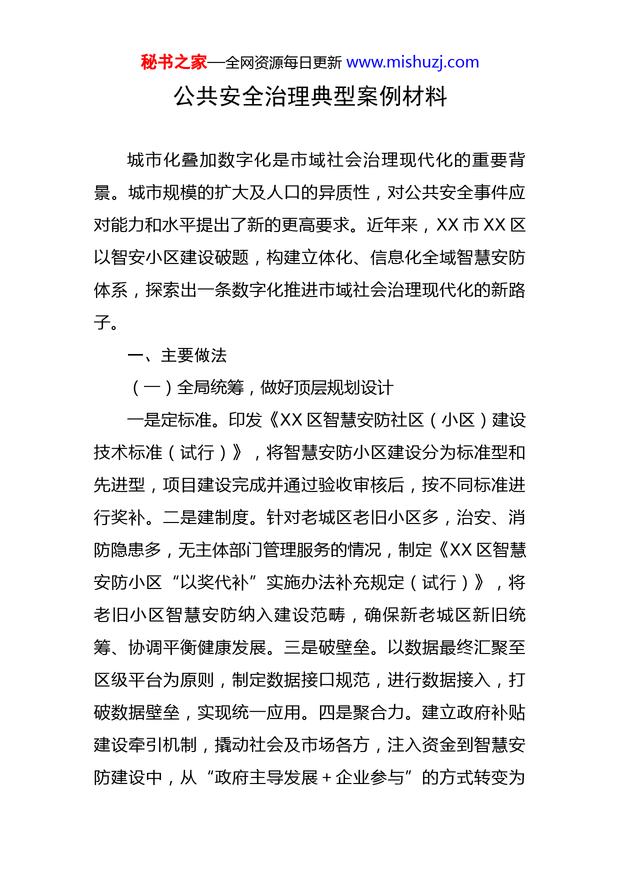 秘书之家—全网资源每日更新www.mishuzj.com公共安全治理典型案例材料城市化叠加数字化是市域社会治理现代化的重要背景。城市规模的扩大及人口的异质性,对公共安全事件应对能力和水平提出了新的更高要求。近年来,XX市XX区以智安小区建设破题,构建立体化、信息化全域智慧安防体系,探索出一条数字化推进市域社会治理现代化的新路子。一、主要做法(一)全局统筹,做好顶层规划设计一是定标准。印发《XX区智慧安防社区(小区)建设技术标准(试行)》,将智慧安防小区建设分为标准型和先进型,项目建设完成并通过验收审核后,按不同标准进行奖补。二是建制度。针对老城区老旧小区多,治安、消防隐患多,无主体部门管理服务的情况,制定《XX区智慧安防小区“以奖代补”实施办法补充规定(试行)》,将老旧小区智慧安防纳入建设范畴,确保新老城区新旧统筹、协调平衡健康发展。三是破壁垒。以数据最终汇聚至区级平台为原则,制定数据接口规范,进行数据接入,打破数据壁垒,实现统一应用。四是聚合力。建立政府补贴建设牵引机制,撬动社会及市场各方,注入资金到智慧安防建设中,从“政府主导发展+企业参与”的方式转变为秘书之家—全网资源每日更新www.mishuzj.com“市场运作为主+政府部门积极推动”的建设模式,建立良好的、可持续的社区建设新模式。(二)数据扩容,提高智慧处理能力一是织天网。搭建全区汇聚分析建模应用的智慧安全防范小区大数据平台,在小区出入口、公共区域等位置安装无感知智能采集设备,进行数据全量汇聚。目前,全区共建设视频监控探头6475路,102个智慧安防小区、54个老旧小区、23个城中村主要通道实现人脸和车辆卡口全覆盖,完成社会面视频监控高清化、智能化升级改造3895路,接入社会视频资源6300余路,为“打防控”提供智能化基础支撑。二是建技防。按照“一户一门禁”的要求,以斗南社区为试点,加强出租房屋治理,推广智慧安防小区建设向出租房延伸,提高社区治安防控科技水平,提升社会治理能力。目前,已完成1200套基础设施建设,完成率92.3%,其中已完成1100户专线安装和965套门锁云平台注册、389户共1530人住户信息采集上平台工作。三是延触角。将智慧安防系统建设向农贸市场、学校、医院、办公点等区域逐步延伸,营造智慧安防系统建设全域式环境。目前,全区已建成智慧安防校园2个、智慧安防市场3个和智慧安防医院1个。四是赋能量。开发推广“智慧社区”App,整合了党员“双报到、双报告、双服务”工作、公共服务、公共管理、公共安全等四大板块的秘书之家—全网资源每日更新www.mishuzj.com功能应用,并设计了与智慧安防小区数据对接联动、智能化前端感知建设、手机/WEB/大屏多端应用等支撑内容,形成了较为完善的体系架构。目前,已在洛龙湖社区成熟运用,下步将在全区推广使用。同时,运用科技手段,解决群众“悬在头顶上的痛”。在XX区惠兰园等2个大型居民小区投入资金80余万元,共安装高空监测设备128套,实现小区全方位、立体化覆盖,得到居民群众广泛认同。(三)强化运用,实现资源共融共通一是数据整合反哺基础。以建设视频大数据云平台为核心,采用最新的视频大数据平台架构,整合平安城市、智慧安防小区、社会视频等基础视频资源,在结构化解析的基础上,汇聚“一标三实”等其他应用类数据,以大数据分析应用为主,建立专题库、主题库,为公安、街道、社区、城管等各单位提供视频结构化数据支撑,从原始的人工巡查向智能化应用转变。二是织密网络资源互通。建设“公共安全视频监控共享平台”,用于内部联网查看,并级联至上级机关。同时,在视频专网建设“公共安全视频监控联网平台”,并将该平台进行研发升级至XX视频大数据云平台,用于全区平安城市视频监控联网,社会视频资源接入,视频图片处理分析,按照规范通过该平台将视频资源及功能共享至区网格中心、交警、城管、应急、街秘书之家—全网资源每日更新www.mishuzj.com道等部门使用。三是智能安防支撑实战。通过公共视频监控探头建设、公共资源接入和社区(小区)单元门禁系统资源接入,把管控单元划分为以小区为单位的最小单元,进一步完善社区前端感知“神经元”建设,实现对小区人、车、物的全维感知、智能识别、全程跟踪,实现社区情况动态掌握、及时预警,发挥防控效能,达到案发先期预警,提高基层公安机关对社区案件的侦办效率。四是智慧治理服务民生。通过探索人工智能、大数据与警务实战的深度应用,建立预警模型,报警指令实时推送到民警手机App,实现智慧平台与警务App信息实时交互功能和访客离线认证比对功能,破解了预警信息不及时、采集信息无法利用和租客访客管理的难题。同时,通过基于人脸识别门禁系统、业主App等智慧便民应用,建立人脸、视频通话、语音通话等多种门禁开启方式,以及覆盖小区智慧安防系统、集成小区“N种力量”进社区,有效破解了社区平安建设综合治理的难题,为现代基层治理提供了有益借鉴。二、治理成效为深入推进市域社会治理现代化建设,XX区坚持改革创新、主动谋划、大胆探索,充分发挥大数据、人工智能等科技手段作用,以辖区的米兰园等小区为试点,对居民小区实施全天候、无死角智能防控,全力打造XX区现代社秘书之家—全网资源每日更新www.mishuzj.com