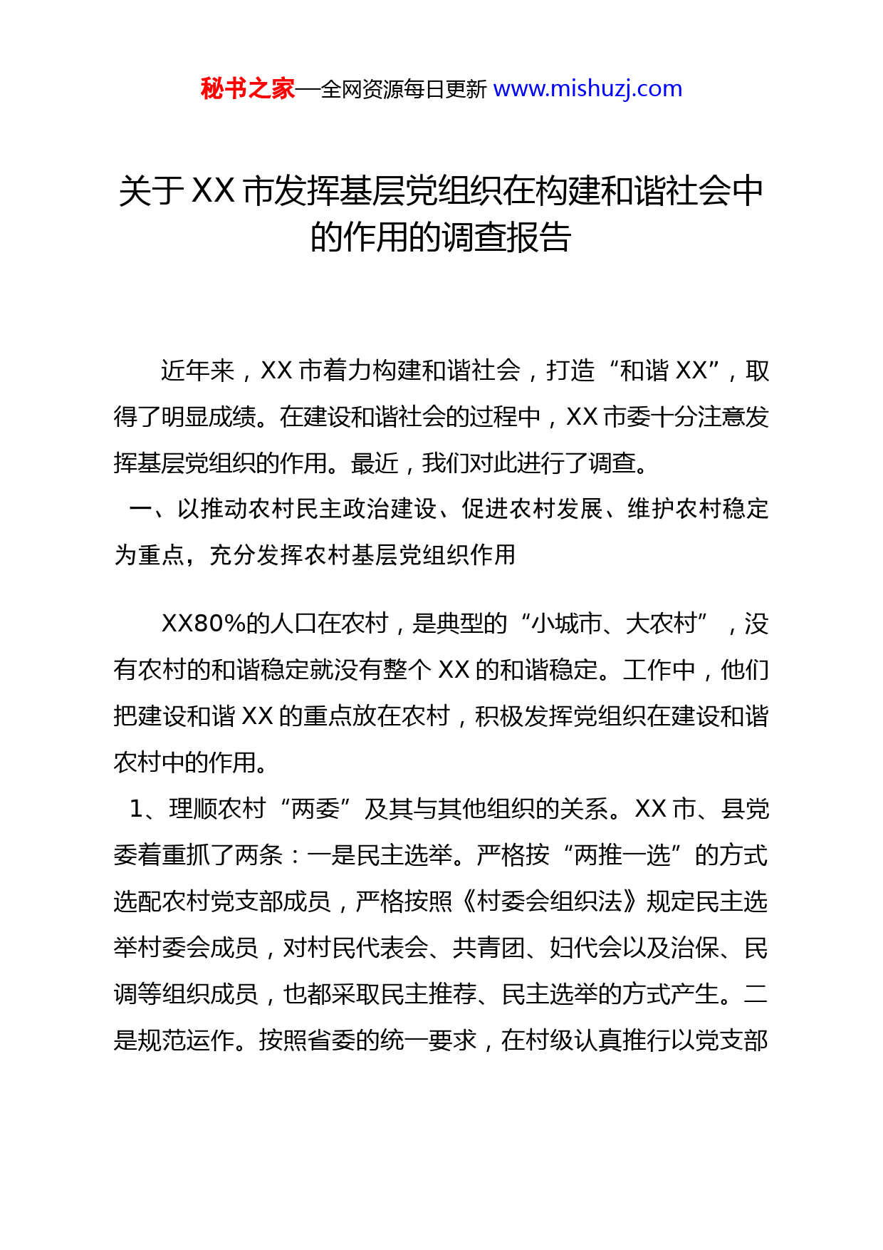 秘书之家—全网资源每日更新www.mishuzj.com关于XX市发挥基层党组织在构建和谐社会中的作用的调查报告近年来,XX市着力构建和谐社会,打造“和谐XX”,取得了明显成绩。在建设和谐社会的过程中,XX市委十分注意发挥基层党组织的作用。最近,我们对此进行了调查。一、以推动农村民主政治建设、促进农村发展、维护农村稳定为重点,充分发挥农村基层党组织作用XX80%的人口在农村,是典型的“小城市、大农村”,没有农村的和谐稳定就没有整个XX的和谐稳定。工作中,他们把建设和谐XX的重点放在农村,积极发挥党组织在建设和谐农村中的作用。1、理顺农村“两委”及其与其他组织的关系。XX市、县党委着重抓了两条:一是民主选举。严格按“两推一选”的方式选配农村党支部成员,严格按照《村委会组织法》规定民主选举村委会成员,对村民代表会、共青团、妇代会以及治保、民调等组织成员,也都采取民主推荐、民主选举的方式产生。二是规范运作。按照省委的统一要求,在村级认真推行以党支部秘书之家—全网资源每日更新www.mishuzj.com领导下的村民自治运行机制和支部工作规范化、村民自治法制化、民主监督程序化为主要内容的“一制三化”工作机制,并将这一机制细化为若干项制度和准则,从制度上消除产生矛盾的土壤。2、以民主议事日活动为载体,畅通农民群众权利诉求和利益表达渠道。2018年以来,他们坚持把每个季度第一个月的10日作为民主议事日,界时,全市所有村街同时举行民主议事活动,市、县、乡三级干部直接到村,与党支部、村委会成员和村民代表一起,共同讨论本村发展、建设的重大事项以及干部作风、土地管理等热点问题,共谋农村的改革、发展、稳定。在2019年的一次民主议事日上,回族群众聚居的XX区XX村村民建议,利用民族优势发展养牛业。参加活动的市、区领导回去后多方联系,帮助他们引进了中国农科院高科技农业技术园区项目,依托园区发展起奶牛养殖小区,并与XX集团达成订单生产协议,使村民年人均收入增长到XXXX元。同时,市委要求农村党支部成员每半年进行一次述职和接受质询活动,村务公开内容由13项增加到20项,强化群众监督力度。3、建立矛盾纠纷调处机制,切实维护农村稳定。稳定是构建和谐社会的基础和前提。他们抓住影响农村稳定的突出问题,建立健全经常性的矛盾纠纷排查调处机制,在市委一季一调度、秘书之家—全网资源每日更新www.mishuzj.com县委一月一排查的基础上,乡、村两级党组织实行了重点矛盾纠纷隐患集中办理、半月点评制度,乡镇党委坚持半月一排查,村街党支部随时发现和解决影响稳定的问题。全市XX个乡镇党委全部配备了抓社会治安综合治理的副职,村村建立了治保会、调委会,村级调解员有X万多名,并发展“十户调解员”、纠纷信息员、企业调解员X万余名。同时,积极探索从根本上消除矛盾纠纷的工作机制。XX县针对村干部办事不公、财务不清这两个矛盾焦点,建立了农村主事、办事、花钱“三权分离”机制,由村干部在发扬民主的基础上决定重要事项,村民办事小组负责落实、办理,村民理财小组负责经费支出。该县XX村投资修建全长XXXX多米、宽7米的水泥进村公路,由于实行了“三权分离”,这项耗资百万元的工程没有引起村民任何猜疑。基层党组织卓有成效的工作保证了XX的稳定,群众对社会治安的满意率达到XX%。4、建立对困难群众的经常性救助机制,保证全体社会成员共享“三个文明”建设成果。任何一个地方都会有一些经济困难和鳏寡孤独、老弱病残的群众,农村困难群众尤其需要帮助。对此,XX各级党组织给予高度重视,把搞好对他们的救助作为建设“和谐XX”的重要环节来抓。全市村级党组织积极开展党员“双带”活动。XX区XX村党支部组织每名党员帮扶一户群秘书之家—全网资源每日更新www.mishuzj.com众,养羊能手、女党员XXX先后帮助X户群众致富。对特殊困难群众,作为重点予以救助,仅2020年乡、村两级就筹措资金近XXX万元,对X万余户、XXX多人进行救助。同时,把逢年过节市、县、乡三级“送温暖”慰问活动制度化。今年春节前,筹措慰问品、慰问金XXX多万元,慰问了X万个家庭。5、提高农村党员、群众思想文化素质。经济快速发展,需要人的素质相应跟进;只有实现人的全面发展,才有和谐可言。他们在大力发展教育事业,狠抓农村党员和入党积极分子培训,几年来,举办农村干部、党员政治理论和专业技术培训班XXXX余期,培训XX余万人次。XX县XX村党总支下设种养业、经商办企业和老党员X个党支部。种养业党支部先后X次组织党员学习种植养殖、农业结构调整、动植物疾病防治等方面的知识,经商办企业人员党支部定期组织党员学习企业管理和市场经济知识,到外地知名企业参观。同时,他们努力以干部、党员素质的提高带动农民素质的全面提升,XXX屯村党支部在农业部乡镇企业学院举办了全省第一家村级经济管理大专班,组织本村知识青年、企业管理人员和村干部入学深造。二、以表达社会关爱、实现各方协调为重点,充分发挥街道社区党组织作用秘书之家—全网资源每日更新www.mishuzj.com在近10余年时间里,XX市区人口由XX多万猛增到XX多万各县(市)城区和城镇人口也迅速聚集。面对日益加快的城市化进程,市委高度重视加强街道社区党的建设,通过创建“平安社区”、